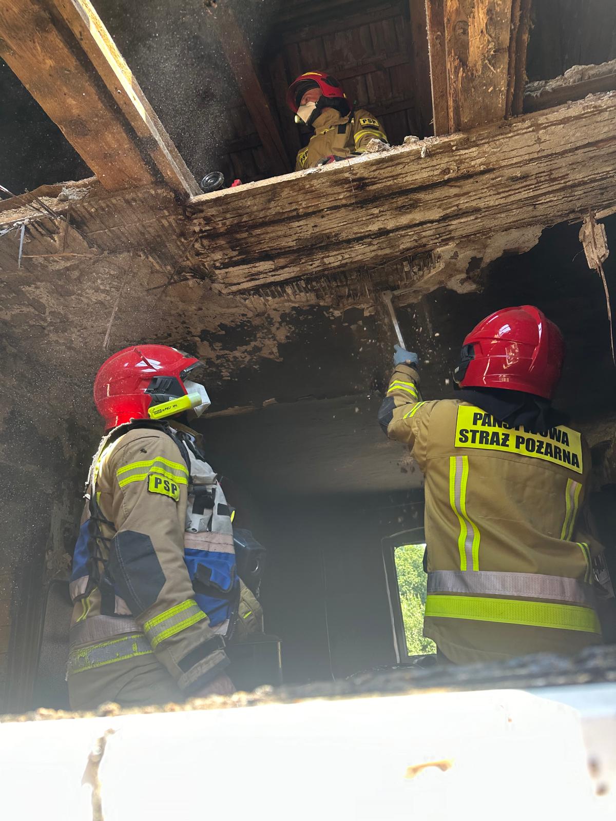 W momencie przybycia zastępów pożarniczych na miejsce zdarzenia z otworów okiennych należących do pomieszczenia kuchennego wydobywał się intensywny dym. Z uwagi na drewnianą konstrukcję stropu oraz więźby dachowej istniało realne zagrożenie rozprzestrzeniania się ognia na pozostałą część obiektu.