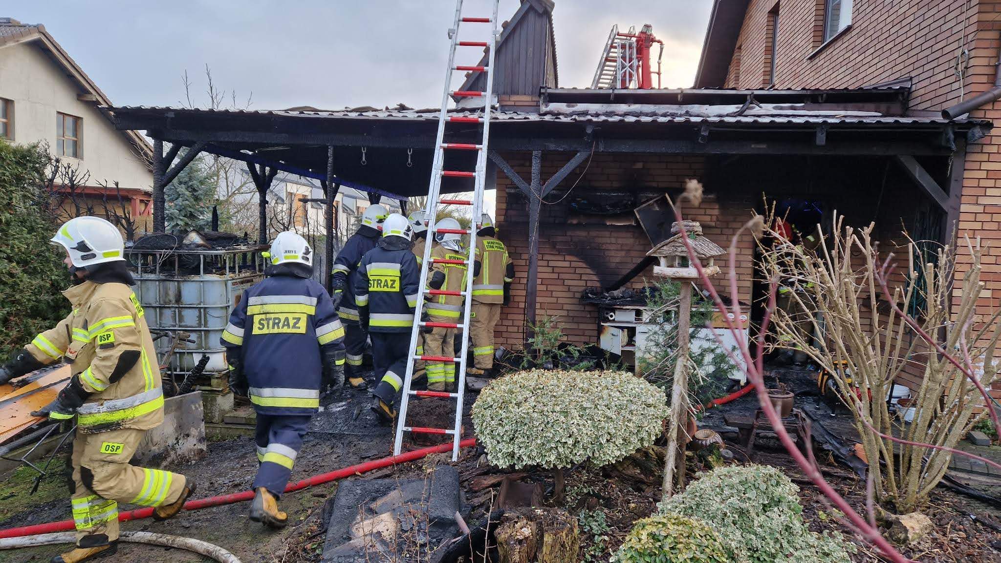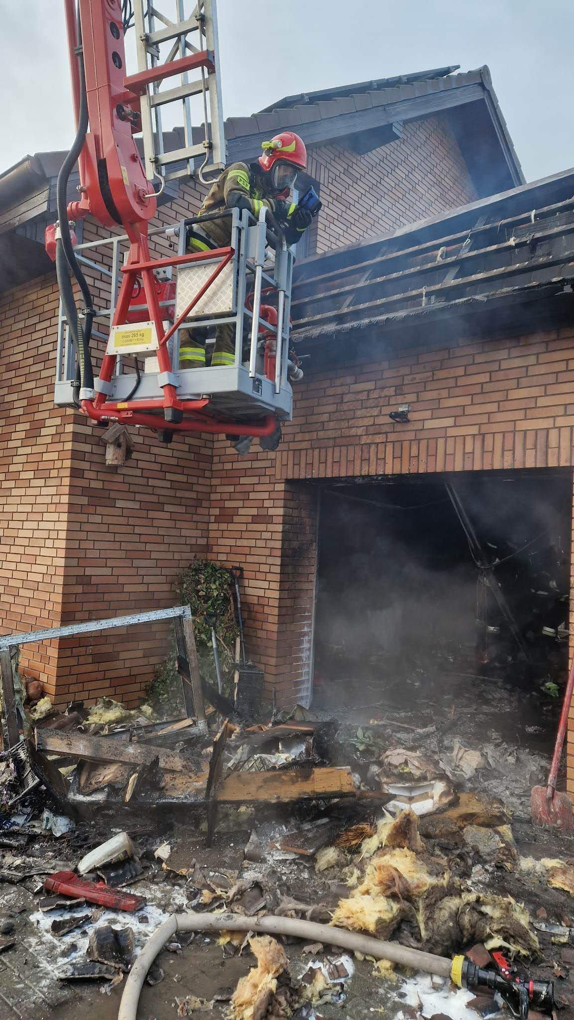 Strażacy po zabezpieczeniu terenu działań podali sumarycznie 4 prądy gaśnicze dostosowując rodzaj środka gaśniczego do sytuacji pożarowej, celem minimalizacji strat materialnych. Z uwagi na dynamiczny rozwój pożaru w pierwszej fazie akcji prowadzono równoczesne działania w natarciu oraz obronie, mając na celu zmniejszenie szybkości rozprzestrzeniania się pożaru i obronę zagrożonej części mieszkalnej. Po stłumieniu ognia zastosowano wentylację mechaniczną celem oddymienia obiektu i poprawy komfortu pracy ratowników realizujących czynności w strefie zagrożenia. W dalszym etapie działań dokonano częściowej rozbiórki części podsufitowej w garażu, dogaszając pojedyncze zarzewia ognia zlokalizowane za pomocą kamery termowizyjnej. Nadpalone mienie znajdujące się wewnątrz wyniesiono poza budynek i dogaszano wodą. W momencie zakończenia działań gaśniczych cały obiekt sprawdzono urządzeniami pomiarowymi, potwierdzając likwidacje zagrożenia. Decyzją Kierującego Działaniami Ratowniczymi prewencyjnie sprawiono podnośnik hydrauliczny, weryfikując stan więźby dachowej budynku jednorodzinnego pod kątem ukrytych zarzewi ognia, których nie stwierdzono. Dzięki sprawnej akcji gaśniczej ogień nie rozprzestrzenił się na część mieszkalną obiektu. Na tym działania trwające łącznie 01 godzinę i 55 minut zakończono i zastępy powróciły do miejsca stacjonowania.