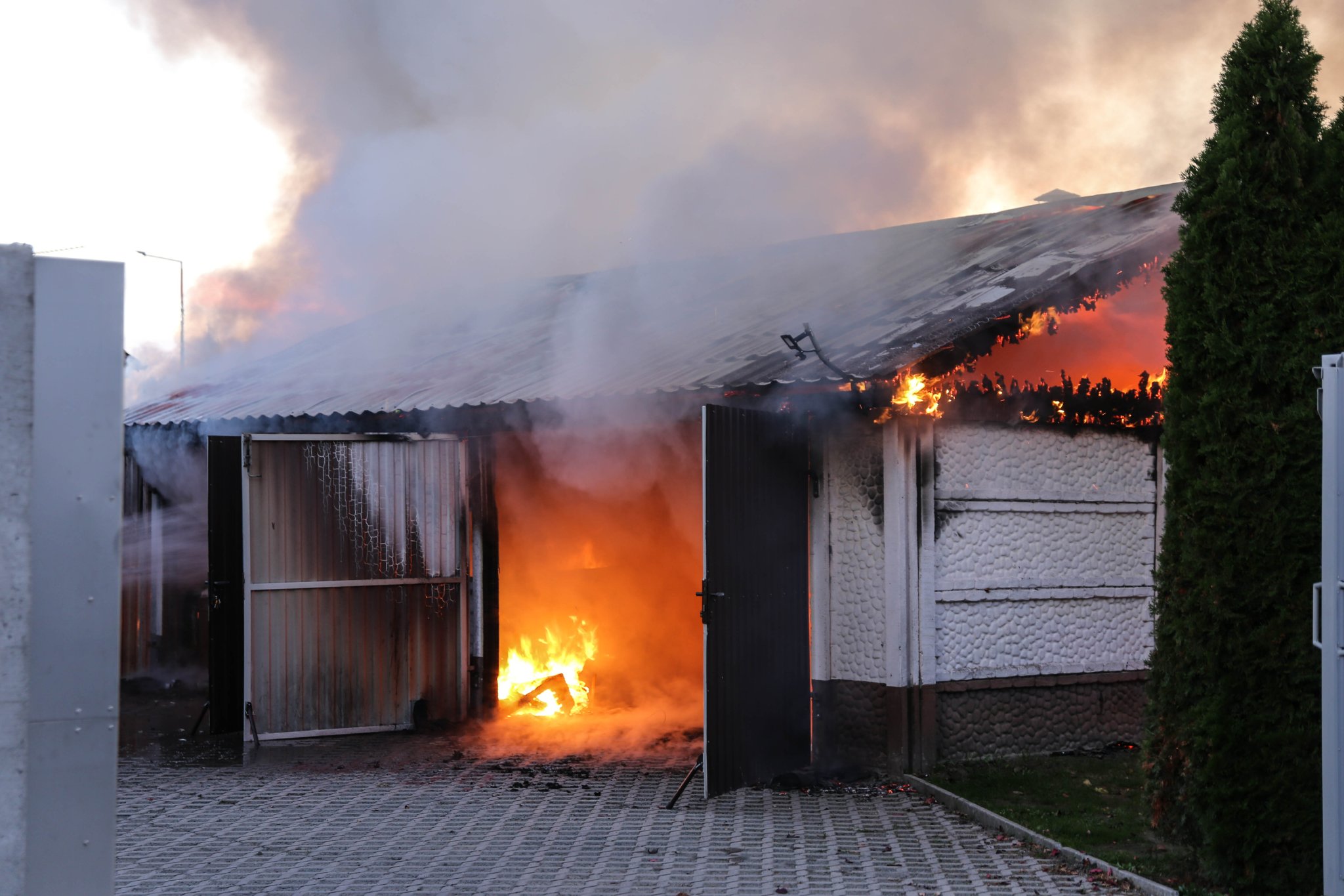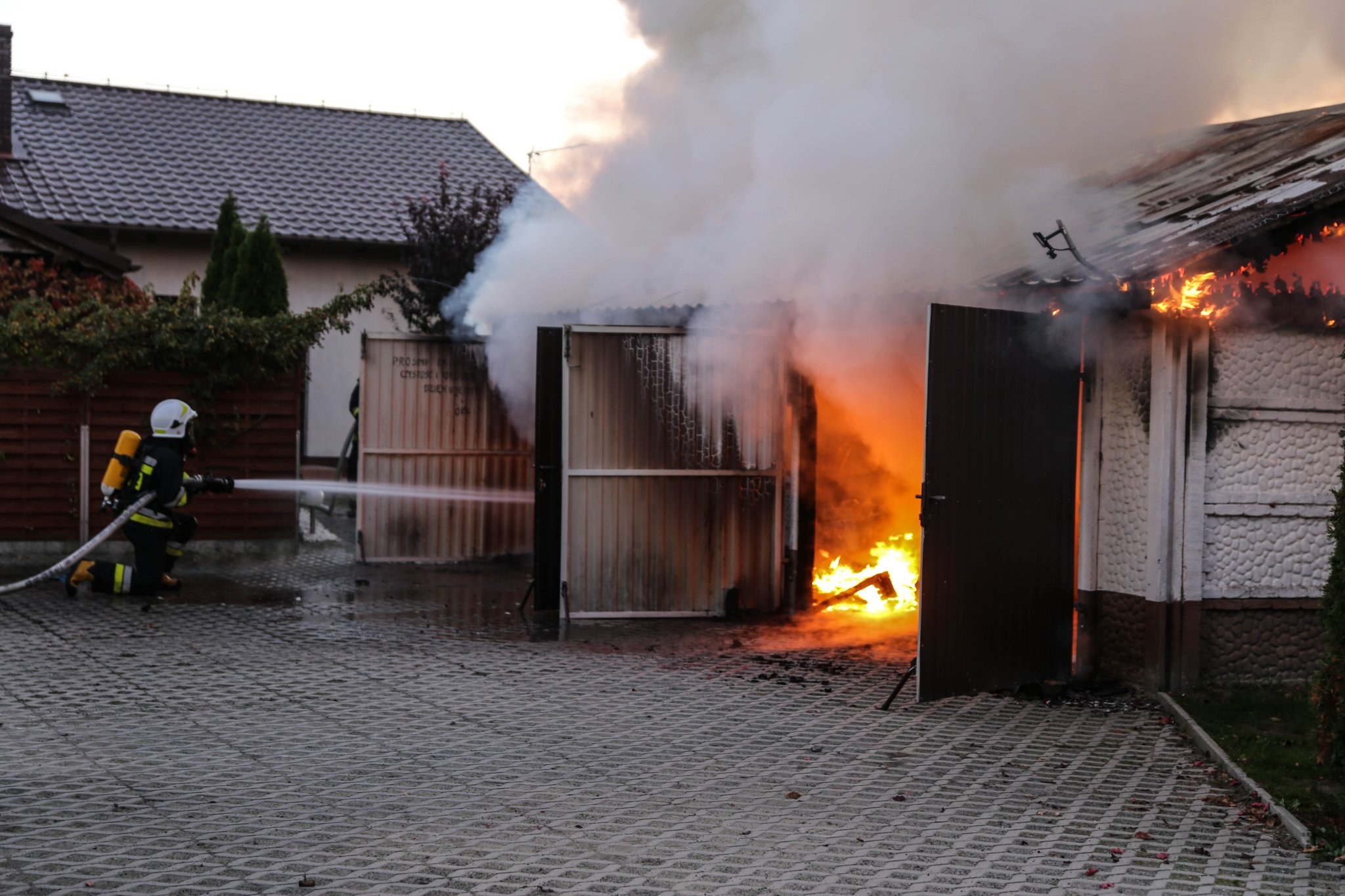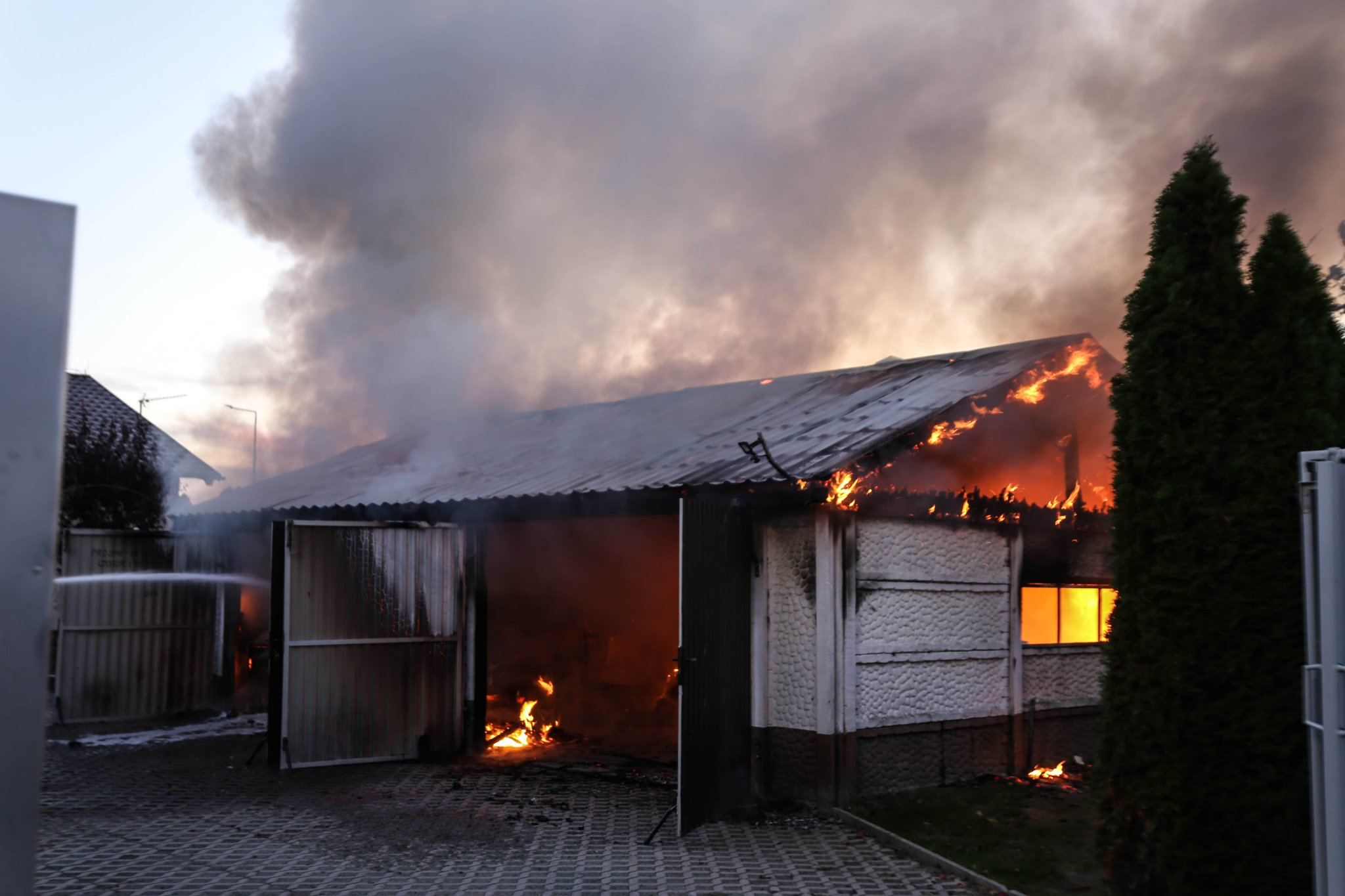 W wyniku przeprowadzonego rozpoznania Kierujący Działaniem Ratowniczym ustalił, że pali się garaż dwustanowiskowy. Pożar obejmuje całe wnętrze wraz z wyposażeniem warsztatowym oraz samochodem osobowym.