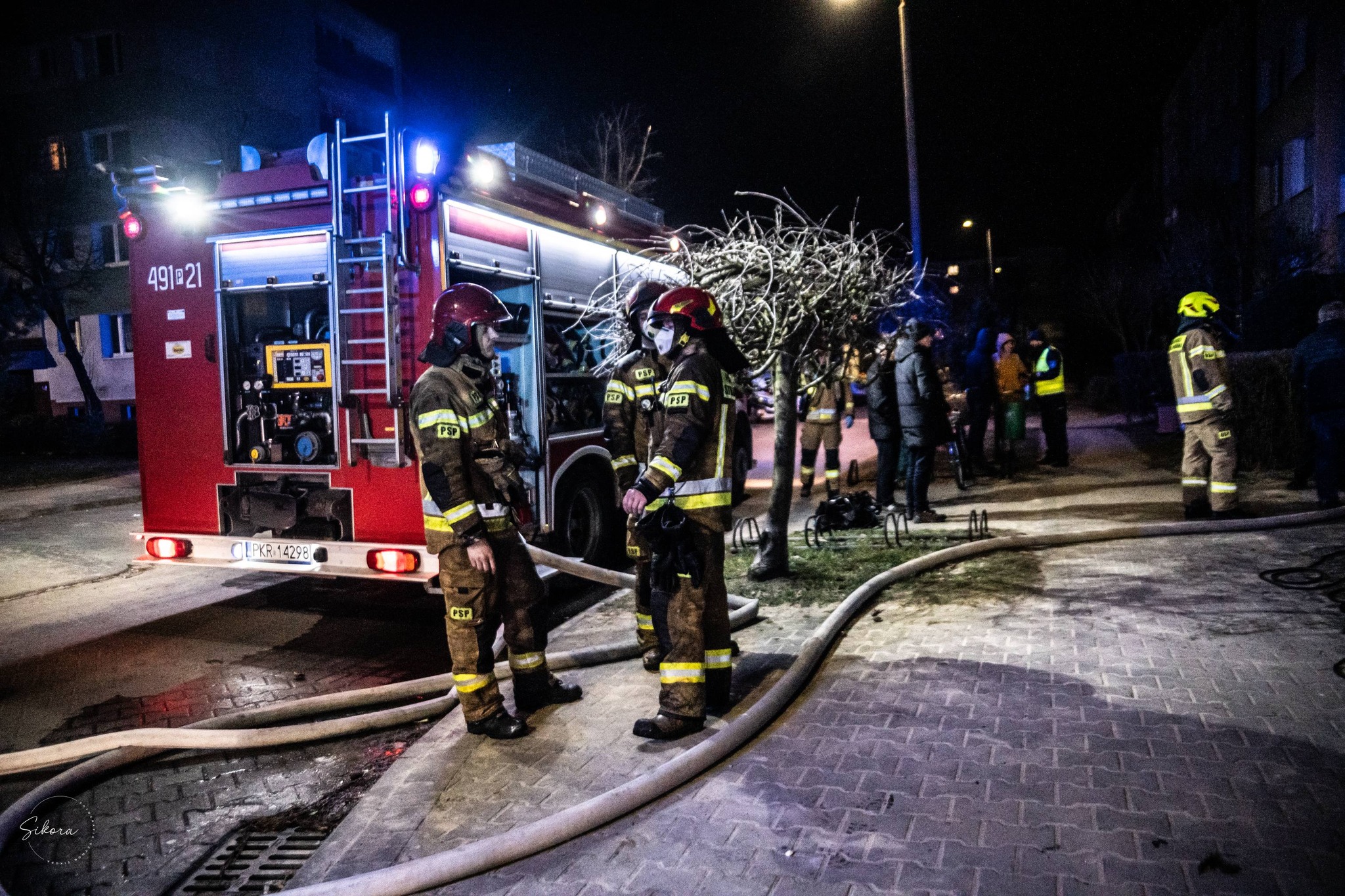 Działania straży pożarnej polegały na zabezpieczeniu miejsca zdarzenia, następnie strażacy zabezpieczeni w sprzęt ochrony układu oddechowego wyposażeni w linie wężową weszli do palącego się lokalu, gdzie podali jeden prąd gaśniczy w natarciu na palące się wyposażenie mieszkania doprowadzając do lokalizacji pożaru. Mieszkańców z wyższych kondygnacji strażacy ewakuowali przy wykorzystaniu kaptura ewakuacyjnego na zewnątrz, gdzie w pneumatycznym namiocie znaleźli tymczasowe schronienie. Z obiektu ewakuowały się 23 osoby w tym 15 osób przez strażaków. Jedna osoba z mieszkania, w którym doszło do pożaru została zabrana do szpitala. Pozostałe osoby, które zgłaszały złe samopoczucie zostały na miejscu przebadane przez personel medyczny, jednak decyzją Kierownika Zespołu nie wymagały hospitalizacji. Na miejscu strażacy współpracowali z Policją, Strażą Miejską, Państwowym Ratownictwa Medycznego, Gminnym Centrum Zarządzania Kryzysowego i Zarządcą Obiektu.