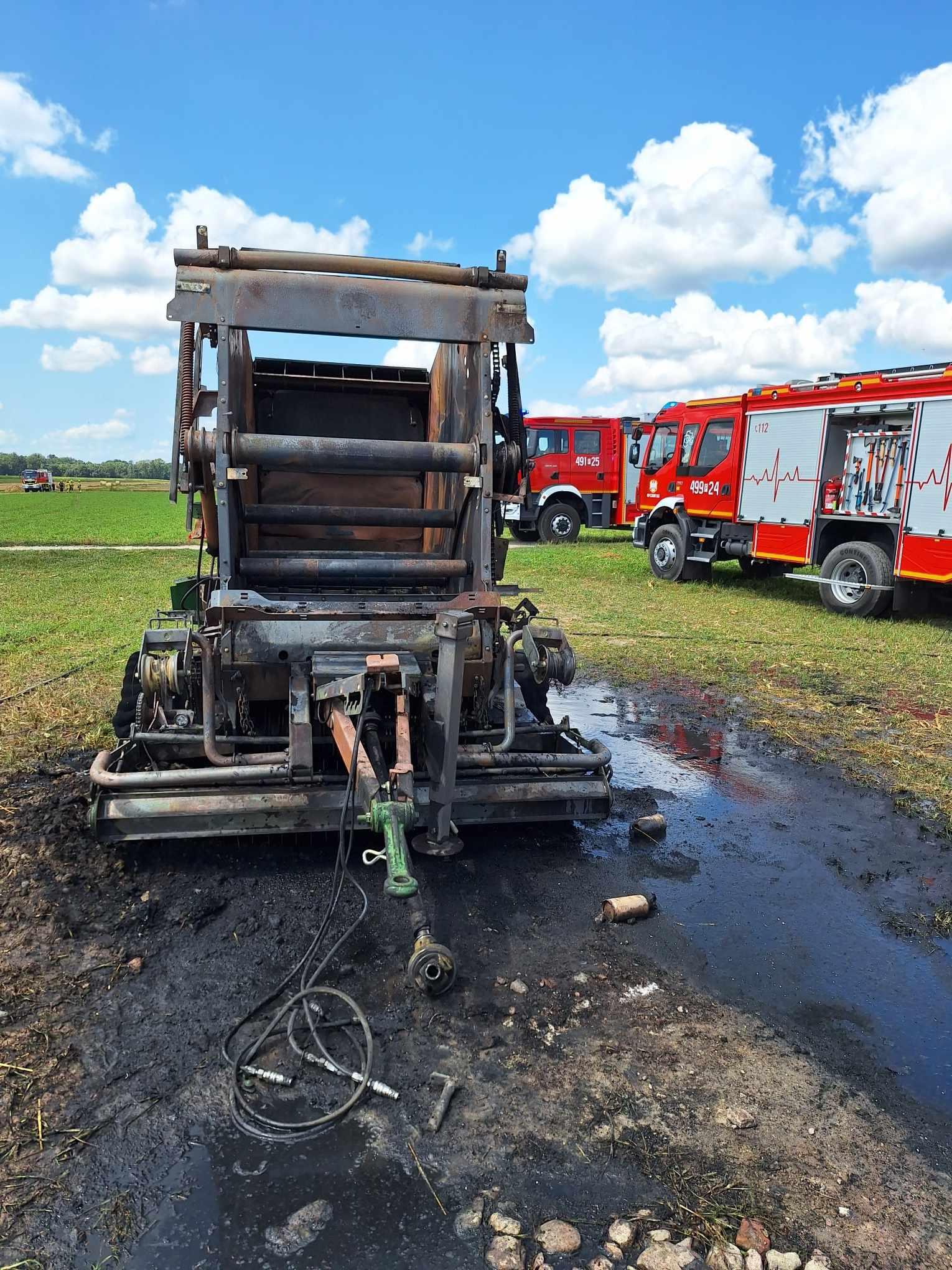 Podczas rozpoznania ustalono, że pali się prasa rolnicza. Operator maszyny w celu zminimalizowania strat odczepił ciągnik od prasy, aby ograniczyć rozprzestrzenienie się ognia .