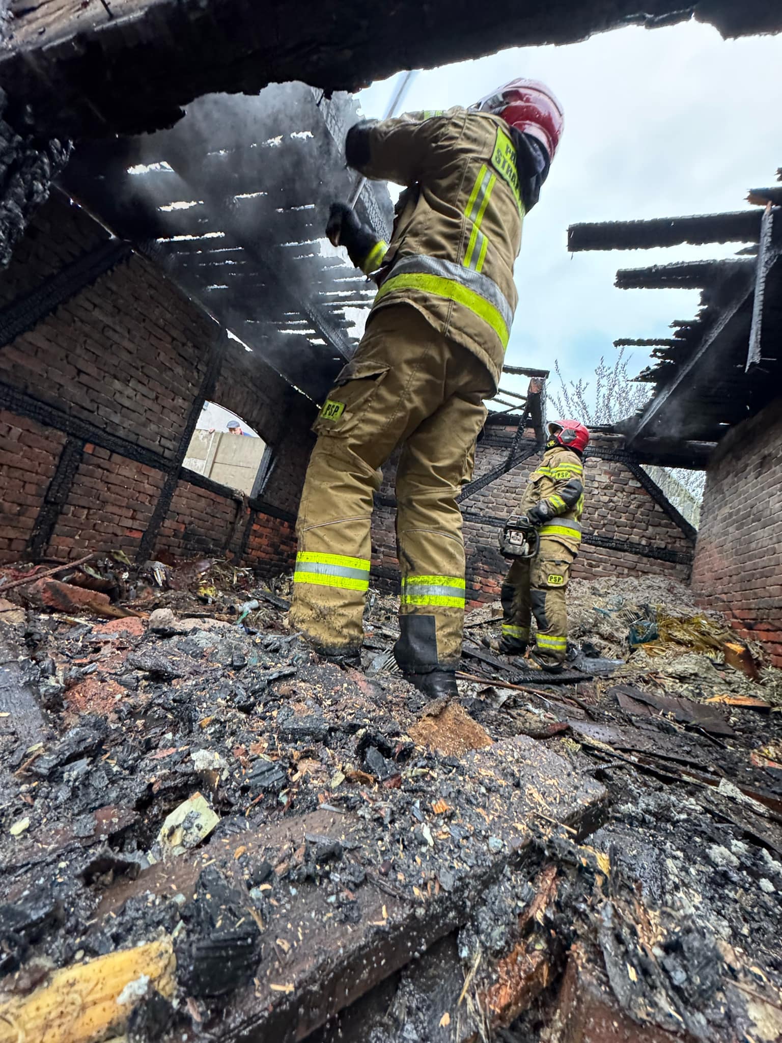 Zabezpieczono teren działań oraz przeprowadzono rozpoznanie. Następnie podano dwa prądy wody w natarciu na palący się budynek oraz jeden prąd wody w obronie na przyległe budynki gospodarcze i mieszkalne. Po wstępnym stłumieniu pożaru KDR ustalił, że pożar częściowo przedostał się na sąsiedni budynek gospodarczy. Po dotarciu kolejnych Sił i Środków Jednostek Ochrony Przeciwpożarowej dowódca polecił rozwinięcie trzeciej linii gaśniczej na drugi budynek objęty pożarem w niewielkim stopniu. Po zlokalizowaniu źródła zagrożenia przystąpiono do usunięcia nagromadzonego dymu oraz pary przy pomocy agregatu oddymiającego. W kolejnym kroku obiekt sprawdzono kamerą termowizyjną, która wykazała ukryte zarzewia ognia w dachu oraz ścianach obiektu (papa, mur pruski). W celu całkowitej likwidacji zagrożenia KDR podjął decyzję o częściowej rozbiórce budynku, który pod wpływem zdarzenia zagrażał mieszkańcom i użytkownikom. W ostatniej fazie działań ratowniczo-gaśniczych przelano pogorzelisko obficie wodą, ponownie sprawdzono kamerą termowizyjną , który potwierdził likwidację zagrożenia.
