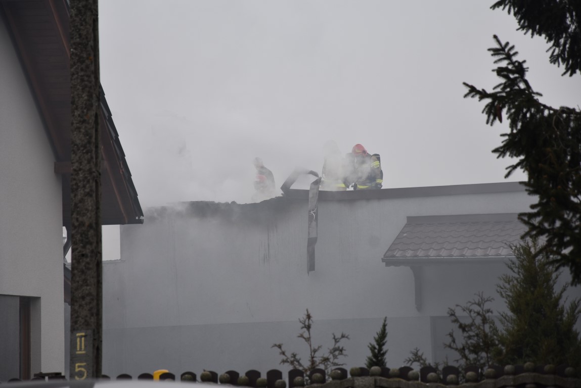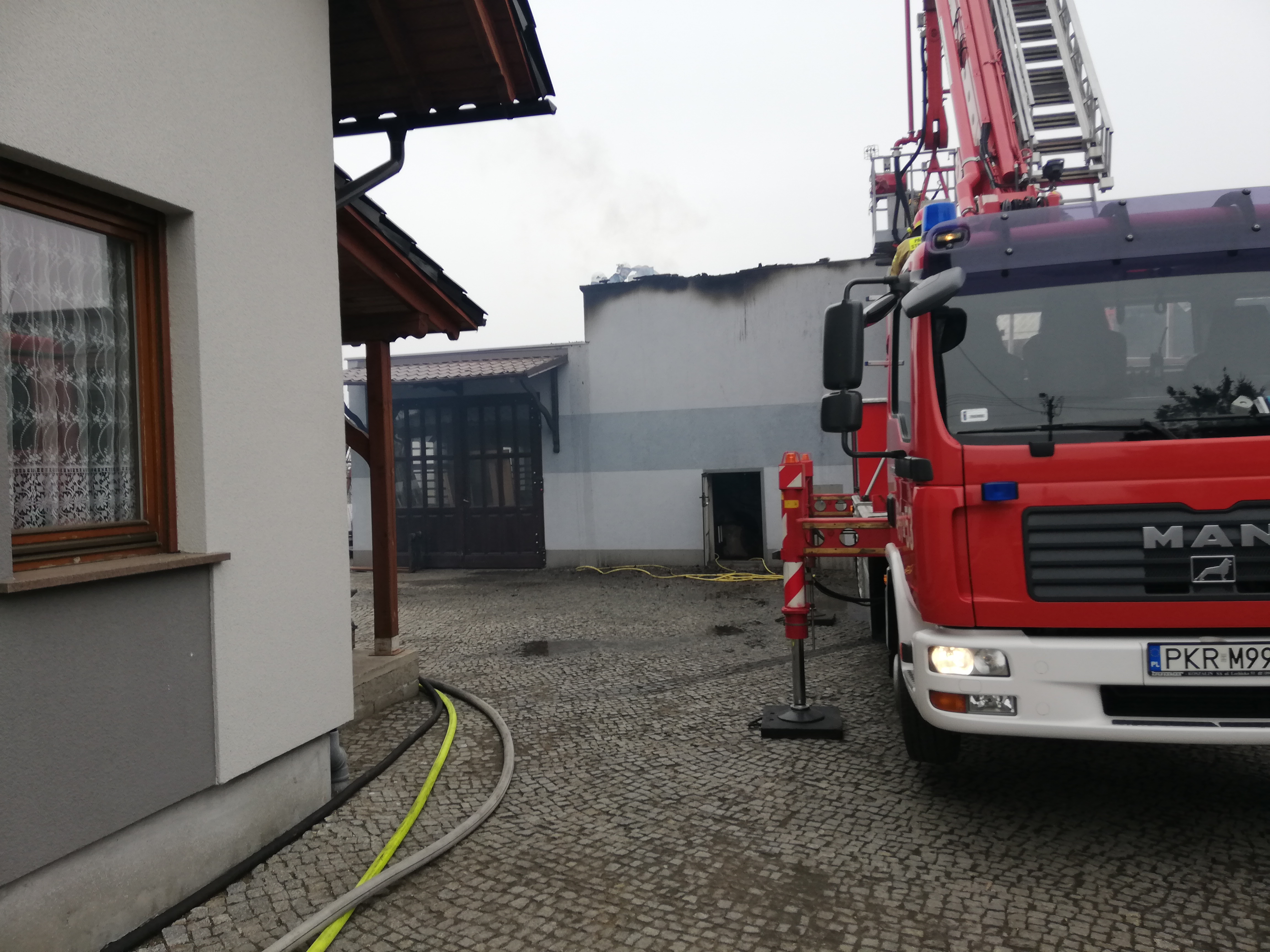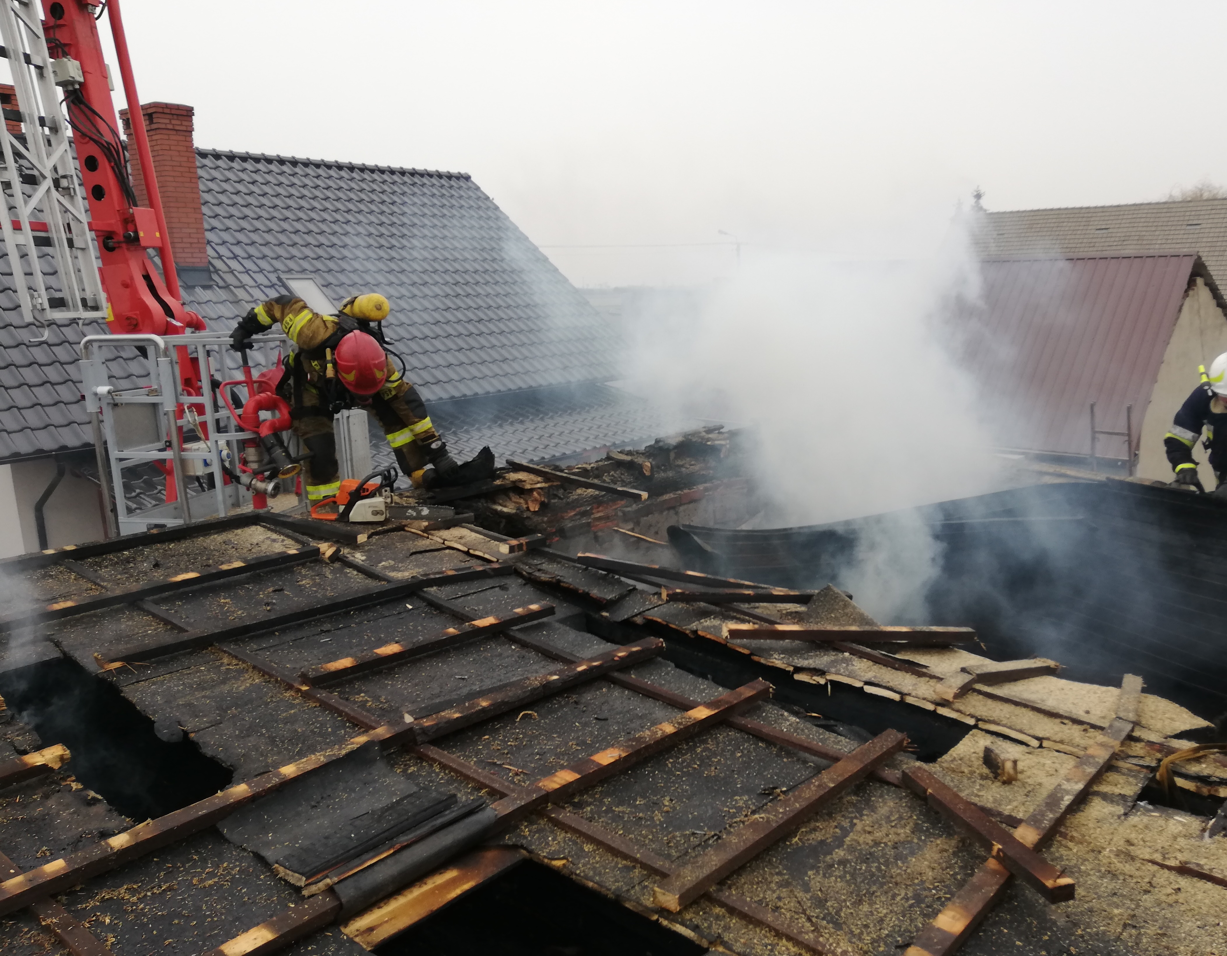 Działania straży pożarnej polegały na zabezpieczeniu miejsca zdarzenia. Następnie strażacy zabezpieczeni w sprzęt ochrony układu oddechowego wprowadzili jeden prąd gaśniczy wody w natarciu na palący się materiał zgromadzony w pomieszczeniu suszarni. Z uwagi na ograniczony dostęp do źródła ognia spowodowany dużą ilością zgromadzonego materiału palnego skierowano drugą rotę na dach obiektu celem wykonania dostępu do źródła pożaru. Po rozebraniu blachy trapezowej wykorzystując pilarkę do drewna, wykonano otwory w części dachowej, przez które podano drugi prąd gaśniczy wody w natarciu na palące się drewno, doprowadzając do ograniczenia rozprzestrzeniania się pożaru. Po ugaszeniu pożaru nadpalony materiał znajdujący się w suszarni został wyniesiony na zewnątrz w miejsce wyznaczone przez właściciela i dogaszony jednym prądem wody. W trakcie prowadzonych działań na bieżąco monitorowano obiekt pod kątem występowania ukrytych zarzewi ognia. Po usunięciu zagrożenia obiekt zabezpieczono dostarczonymi przez właściciela plandekami. Z uwagi na duże natężenie ruchu na drodze na miejsce dotarła Policja, która na czas prowadzonych działań zamknęła drogę powiatową i zorganizowała objazdy. Ratownicy realizujący działania w strefie zagrożenia pracowali w sprzęcie ochrony układu oddechowego z zachowaniem zasad BHP. Na tym działania zakończono i zastępy powróciły do miejsca stacjonowania.