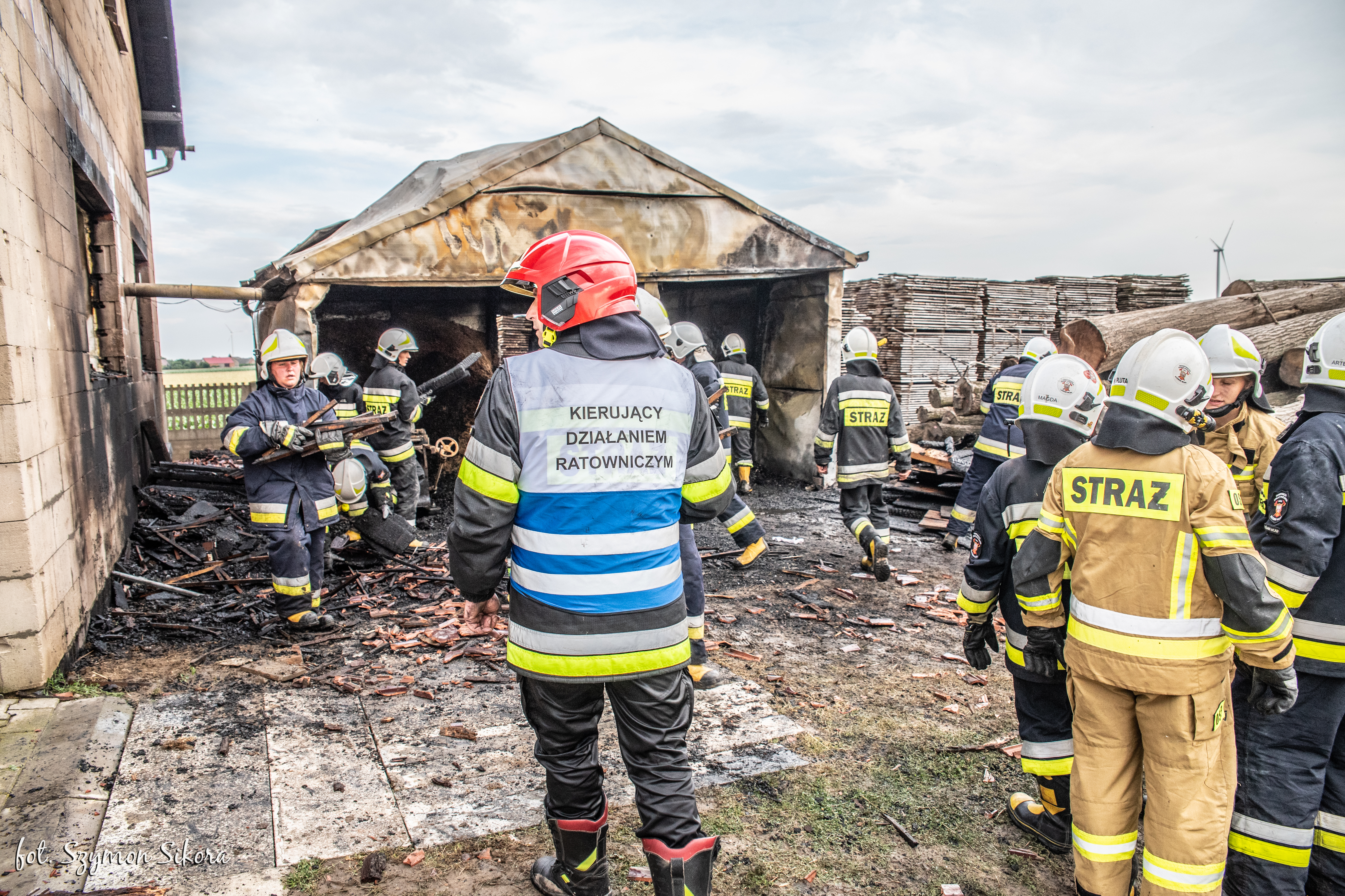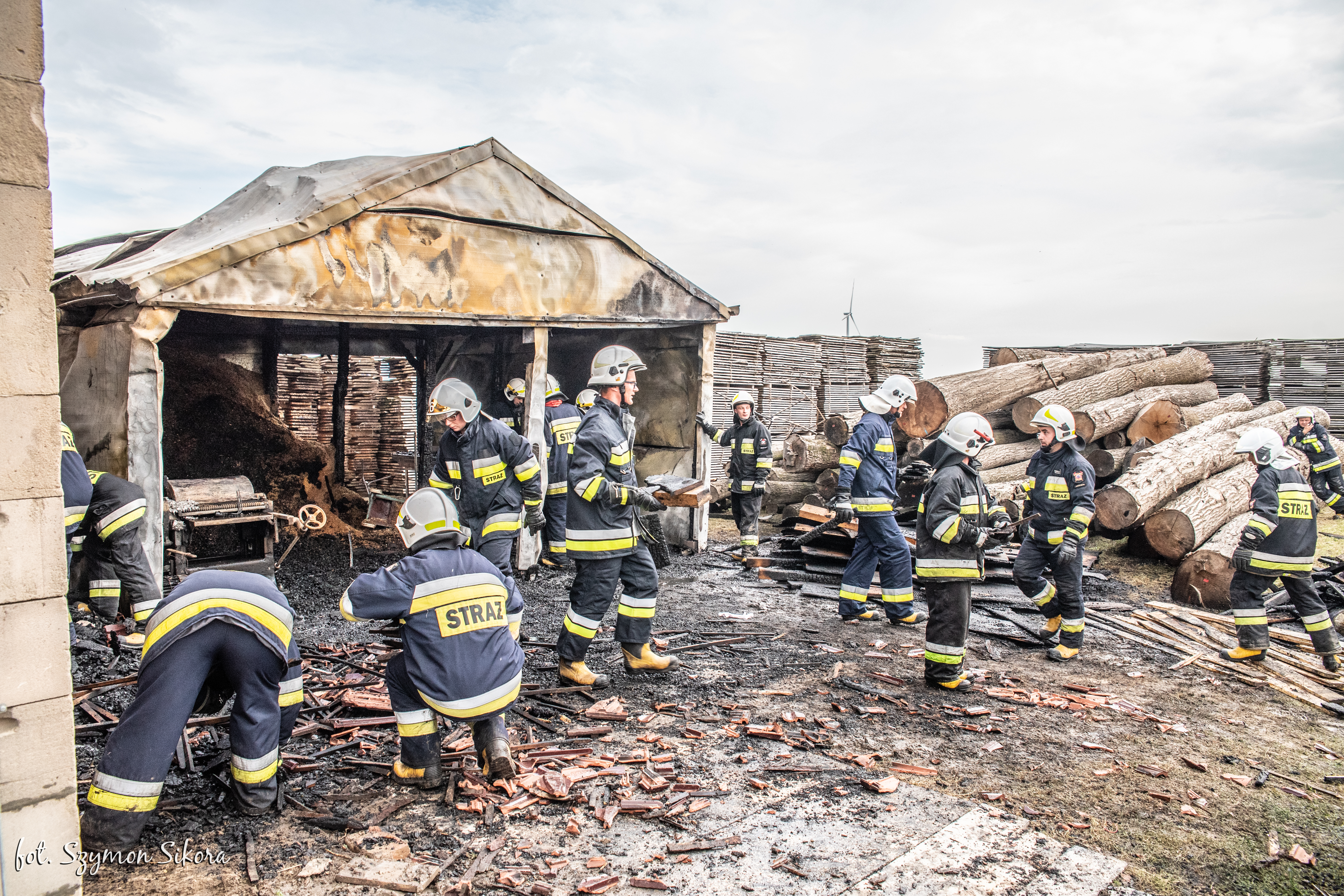 Kierujący Działaniem Ratowniczym w wyniku przeprowadzonego rozpoznania ustalił, że pożarem objęta jest wiata, w której składowane były deski i trociny powstałe w wyniku obróbki drewna. Pożar rozprzestrzenił się na dach przylegającego do wiaty zakładu stolarskiego.