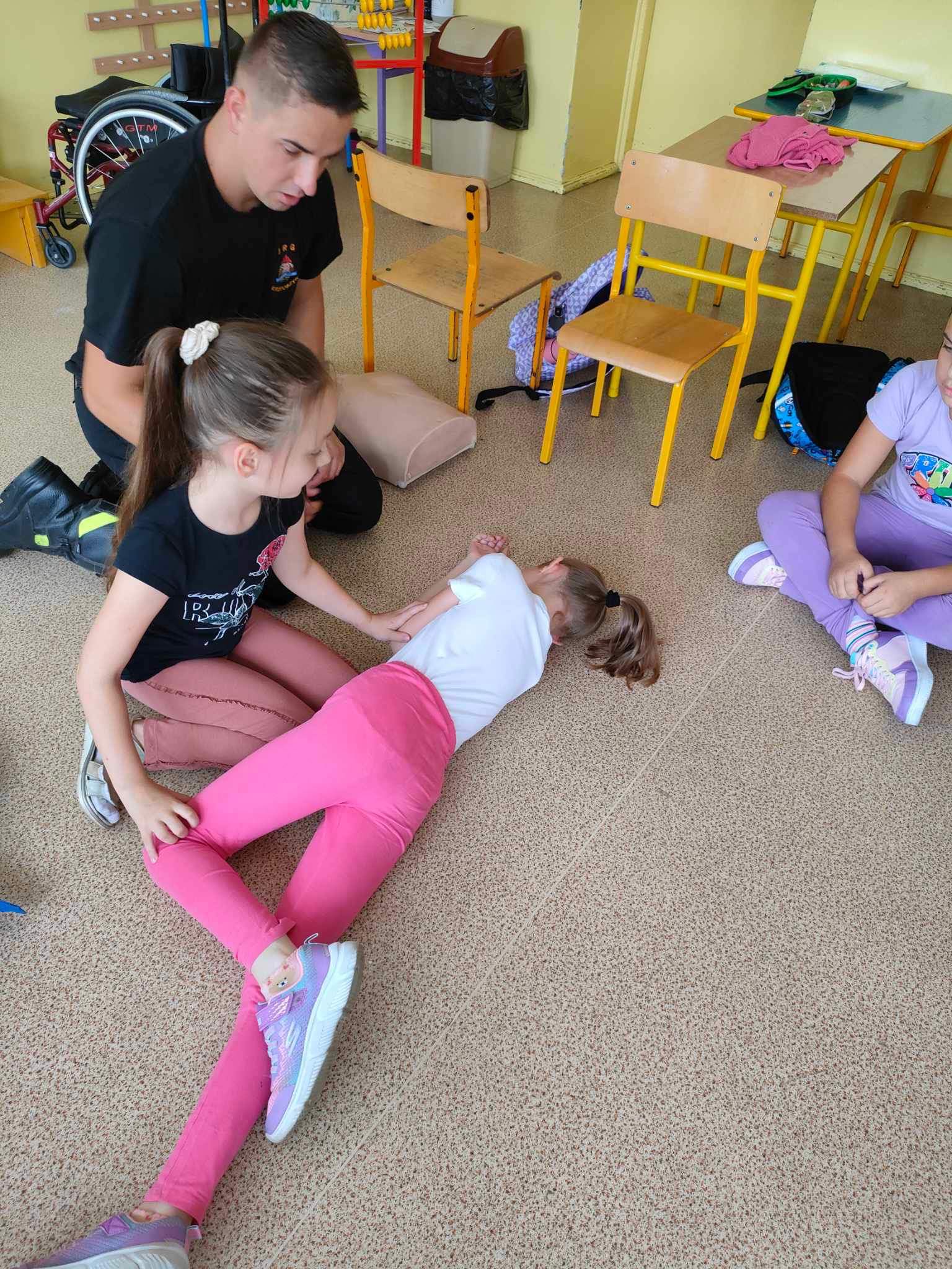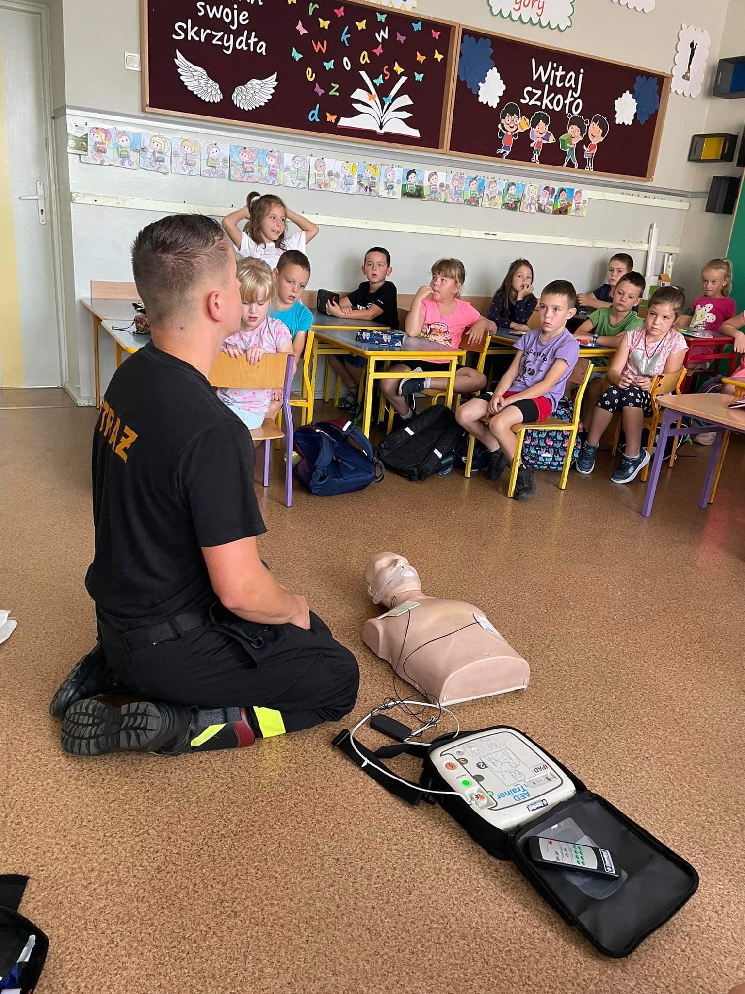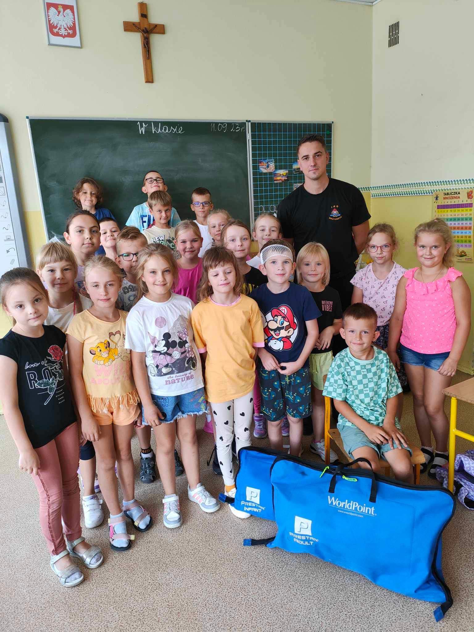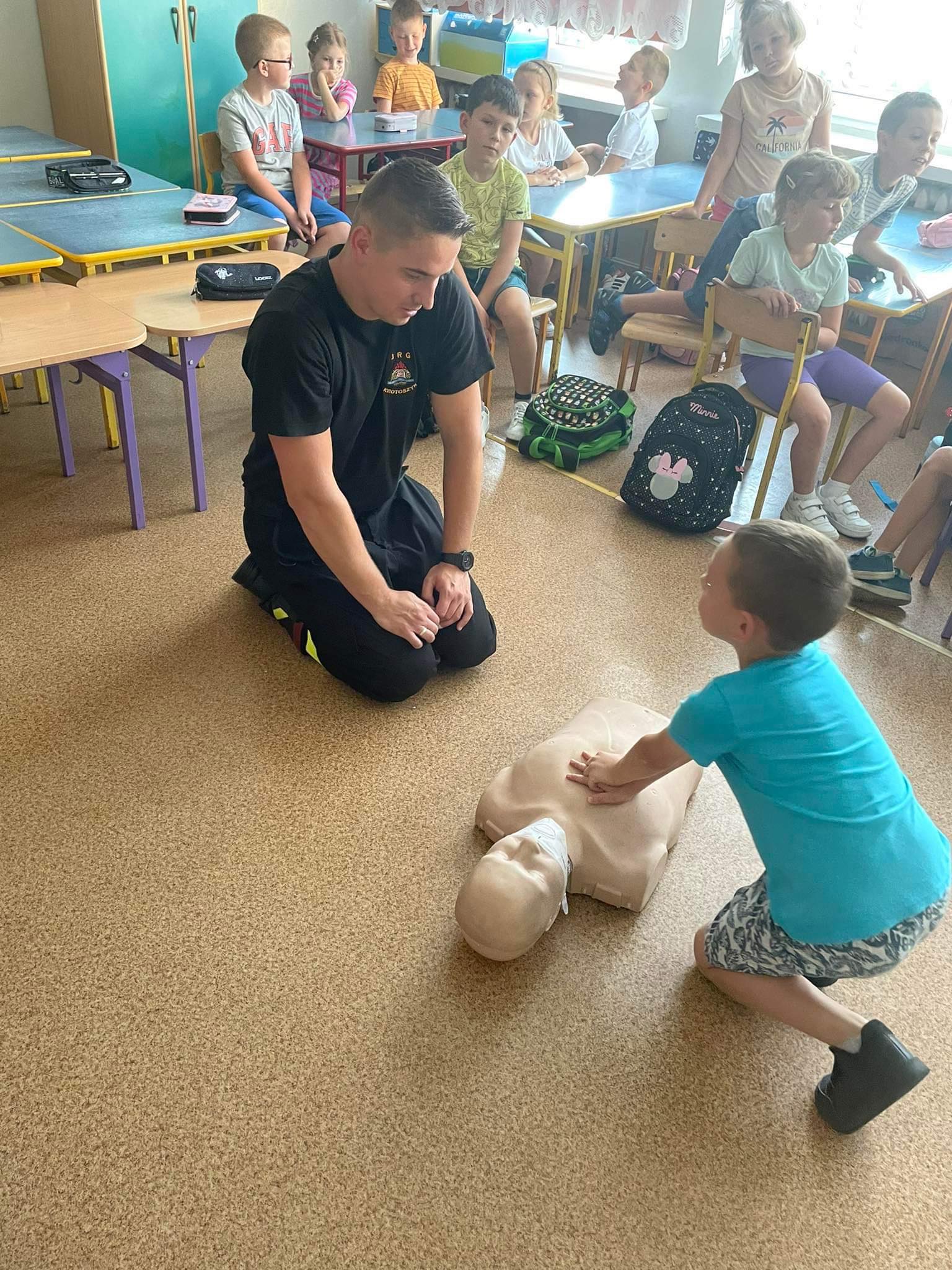 W poniedziałek 11 września 2023 roku st. sekc. Krzysztof Fabisiak z Komendy Powiatowej PSP w Krotoszynie w ramach obchodzonego święta przeprowadził dla dzieci ze Szkoły Podstawowej w Rozdrażewie zajęcia z zakresu udzielania pierwszej pomocy. Zajęcie skierowane były dla uczniów z klas 1-3, a przekazywana wiedza dotyczyła schematów postępowania w sytuacji zagrożenia życia i zdrowia w zwykłym codziennym życiu począwszy od np. złamań, poparzeń, ukąszeń przez owady błonkoskrzydłe po niezwykle istotne umiejętności związane z przywracaniem funkcji życiowych na skutek tzw. nagłego zatrzymania krążenia, do którego często dochodzi w miejscach publicznych w obecności osób postronnych.