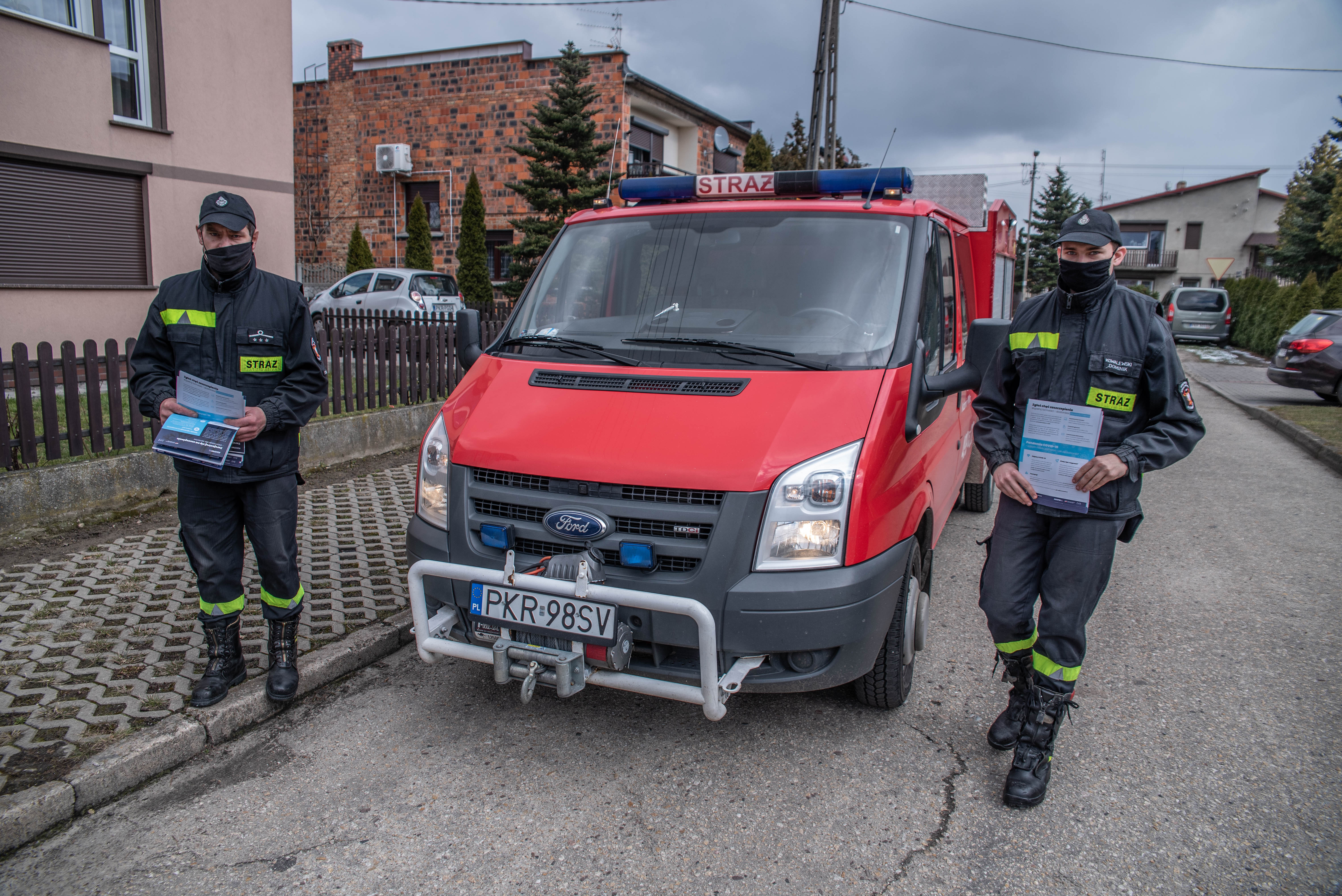 Ulotki zawierają podstawowe informacje o szczepionkach, sposobach zapisania się na szczepienie i możliwościach uzyskania pomocy strażaków w transporcie do punktu szczepień.