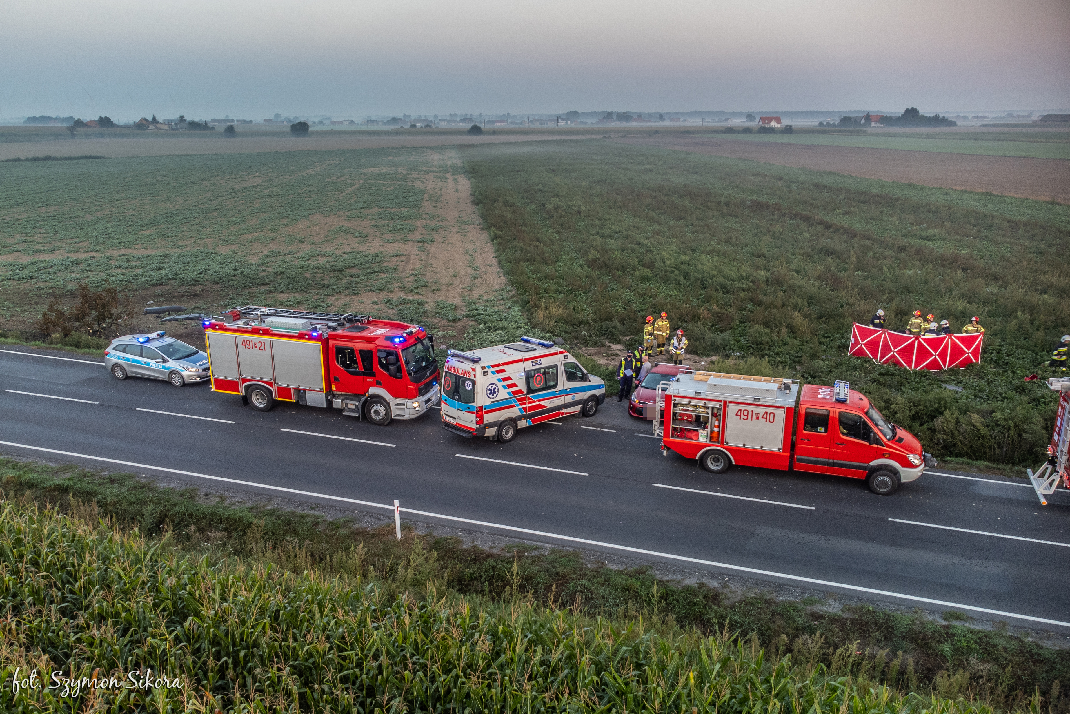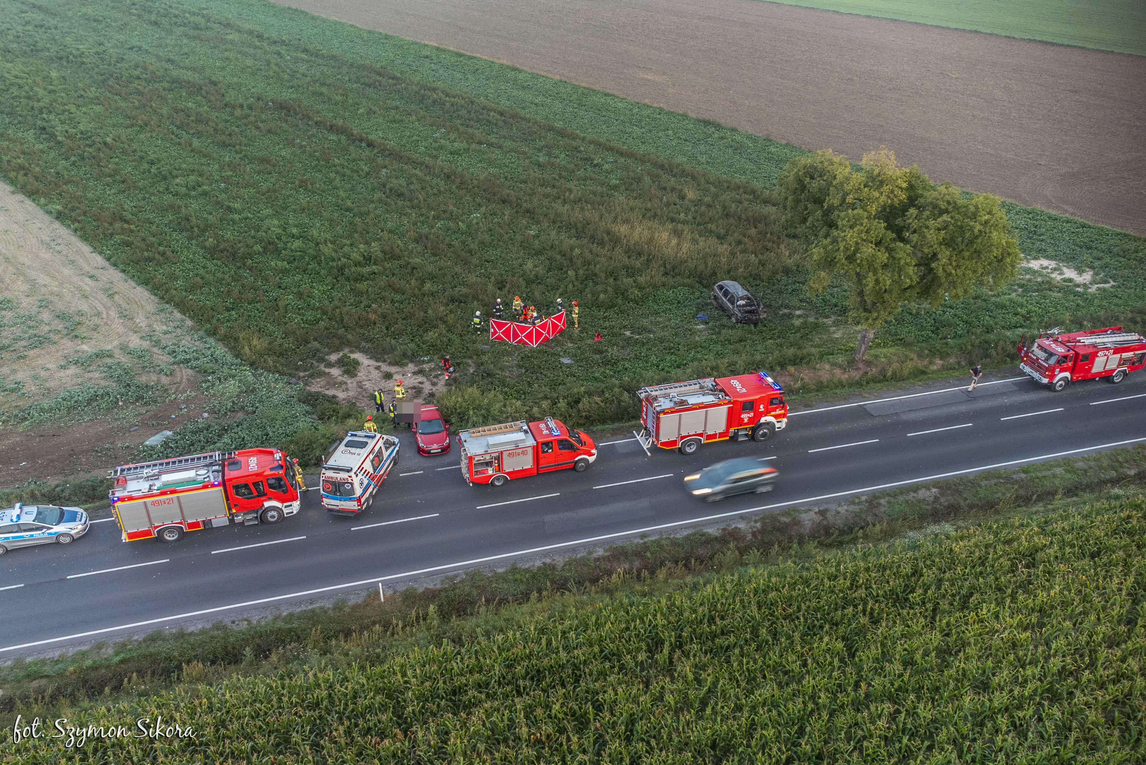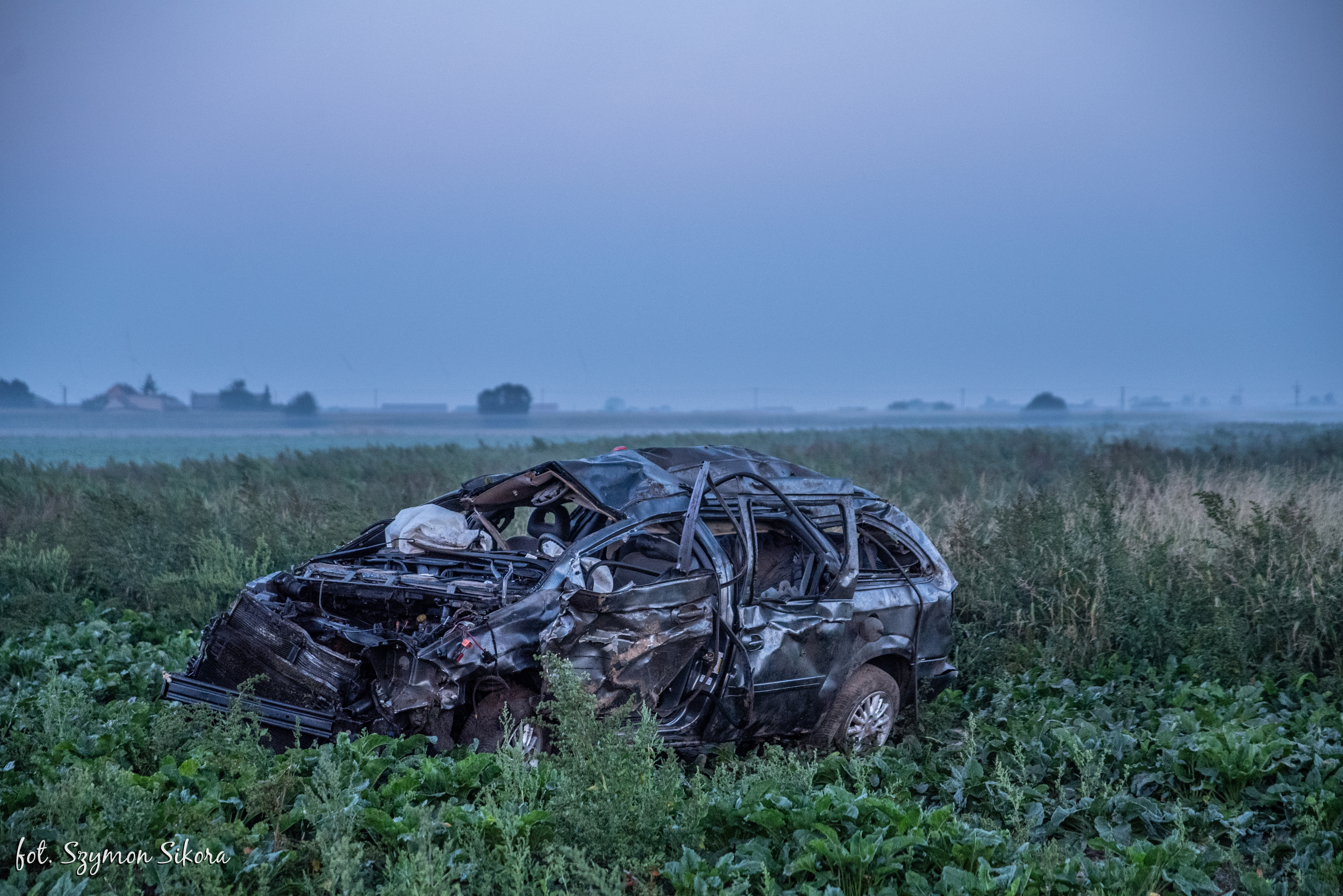 Na miejscu Kierujący Działaniem Ratowniczym ustalił, że rozbity samochód znajduje się poza jezdnią w polu. Kierowca bez funkcji życiowych znajduje się poza pojazdem.