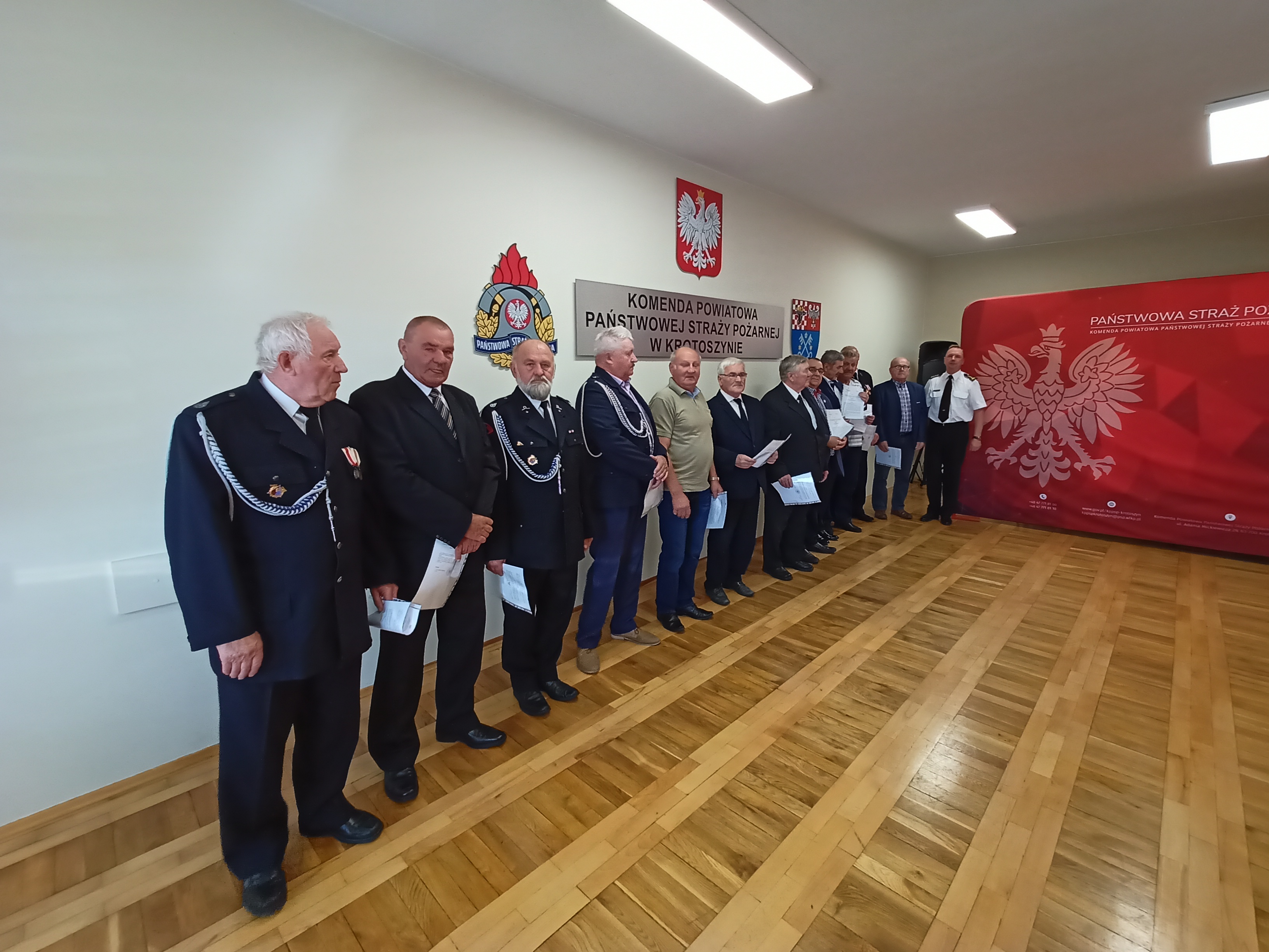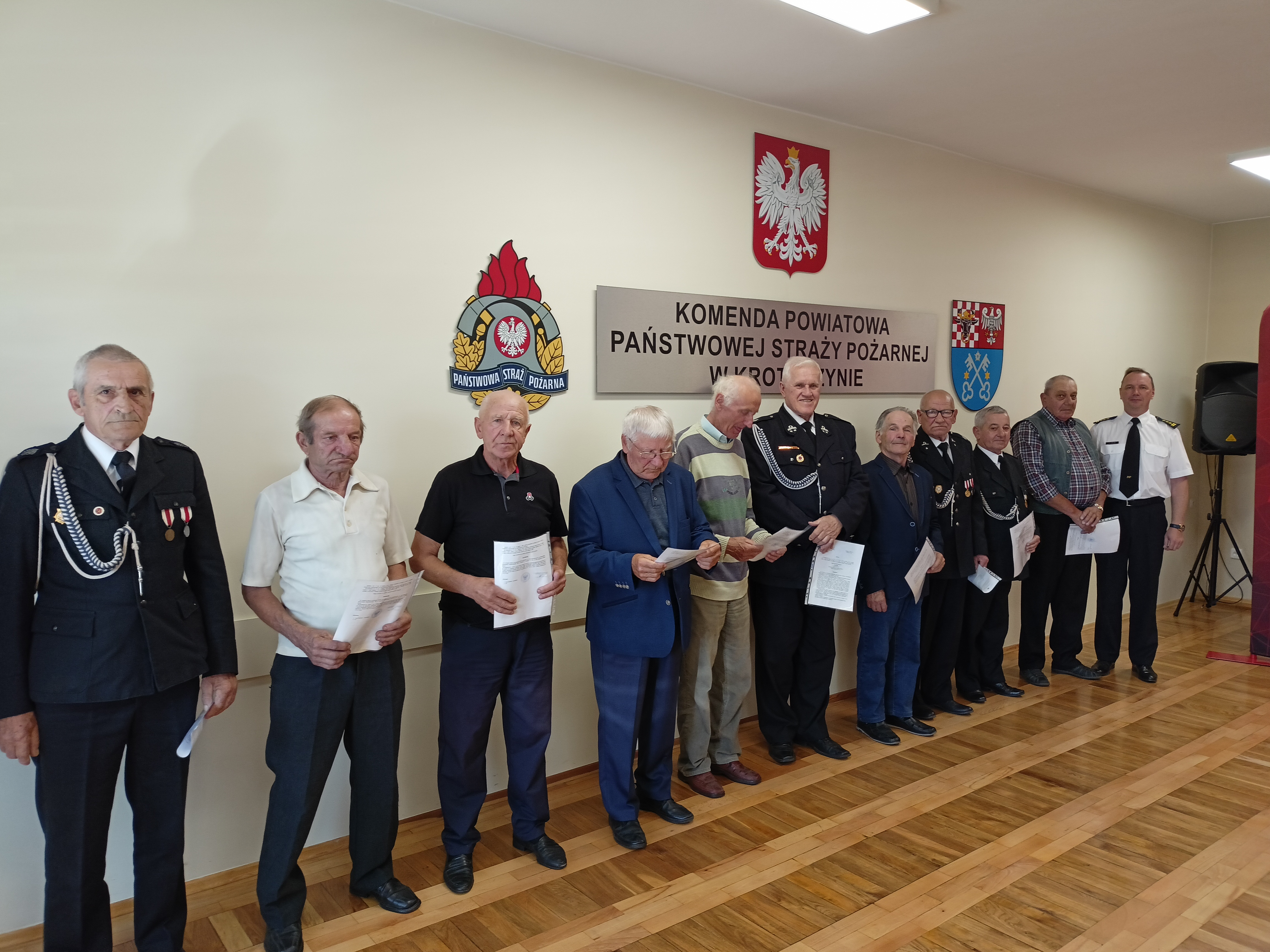 W poniedziałek 18 lipca 2022 roku pełniący obowiązki komendanta powiatowego Państwowej Straży Pożarnej w Krotoszynie st. bryg. Marek Kalak wręczył zasłużonym długotrwałą służbą strażakom decyzje o przyznaniu świadczenia ratowniczego. Uroczystość odbyła się w świetlicy Komendy Powiatowej Państwowej Straży Pożarnej w Krotoszynie.