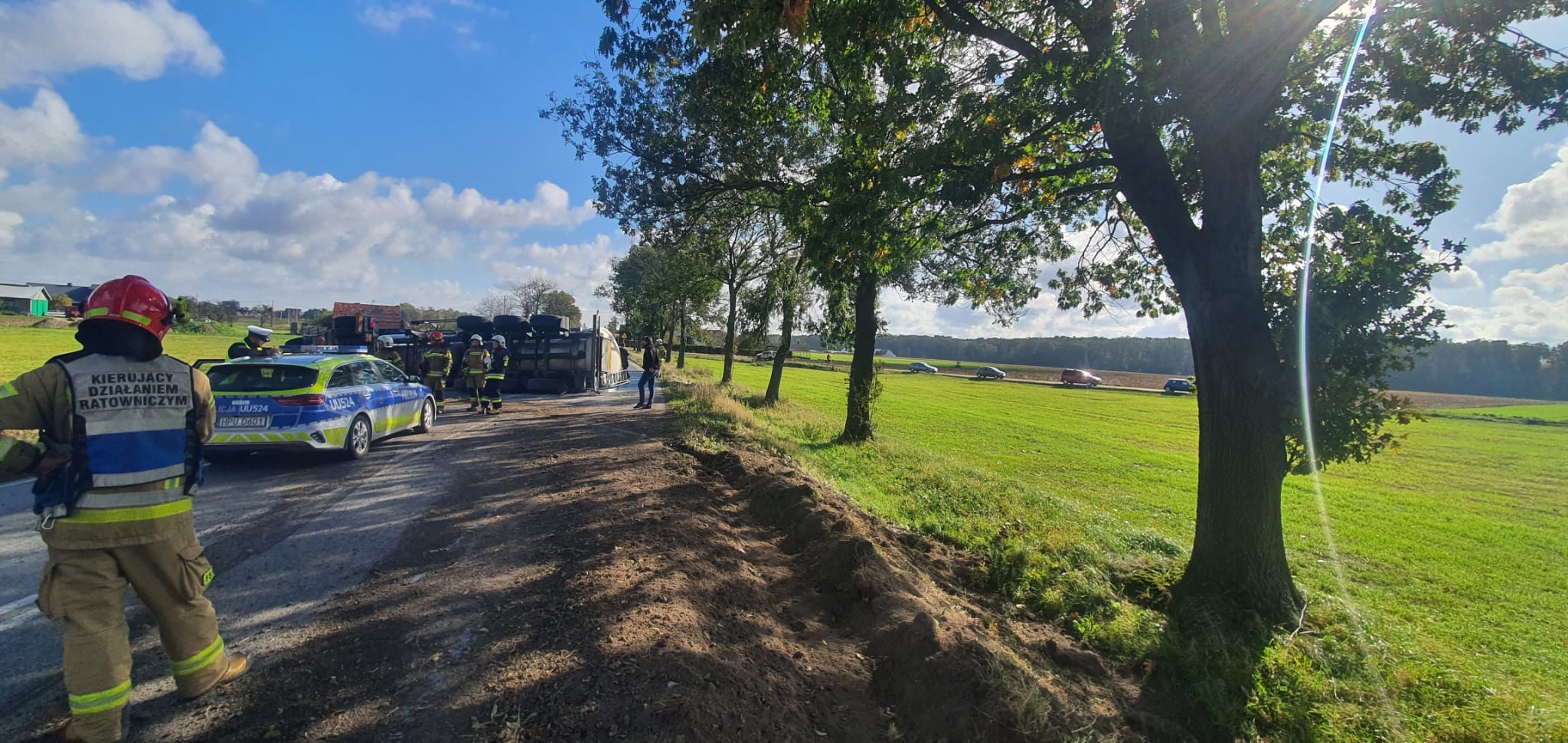 Zgłoszenie do Stanowiska Kierowania Komendanta Powiatowego PSP w Krotoszynie wpłynęło o godzinie 10:59. W momencie przybycia jednostek ochrony przeciwpożarowej na miejsce wypadku kierowca zestawu transportowego znajdował się na zewnątrz pojazdu. Z uwagi na zgłaszane dolegliwości bólowe w późniejszej fazie działań mężczyźnie udzielono kwalifikowanej pierwszej pomocy adekwatnej do poniesionych obrażeń. Po przybyciu służb medycznych uczestnik zdarzenia został przekazany pod opiekę kierownika zespołu, który po diagnostyce w karetce pogotowia nie stwierdził podstaw do hospitalizacji mężczyzny. W tym samym czasie odłączono akumulatory w ciągniku siodłowym oraz zweryfikowano wycieki płynów eksploatacyjnych, których nie stwierdzono. Z uwagi na długotrwałe zamknięcie odcinka drogi krajowej obecni na miejscu funkcjonariusze Policji wyznaczyli objazdy. Właściciel firmy transportowej zorganizował cysternę zastępczą do której przepompowano pozostałą część mleka oraz specjalistyczną pomoc drogową, która rozpoczęła stawianie zestawu na koła. Po odholowaniu uszkodzonej cysterny rozpoczęto czynności zmierzające do likwidacji plamy powstałej wskutek wycieku przewożonego surowca. Czynności te realizowano przy pomocy prądu wody oraz sorbentu. W momencie likwidacji zagrożenia przywrócono ruch całą szerokością jezdni, pozostawiając wyznaczony odcinek drogi przedstawicielom zarządcy wspierających działania służb ratunkowych. Interwencja jednostek ochrony przeciwpożarowej trwała łącznie 05 godzin i 08 minut. W zdarzeniu uczestniczyły trzy zastępy z Jednostki Ratowniczo – Gaśniczej PSP w Krotoszynie oraz jednostka OSP Biadki.
