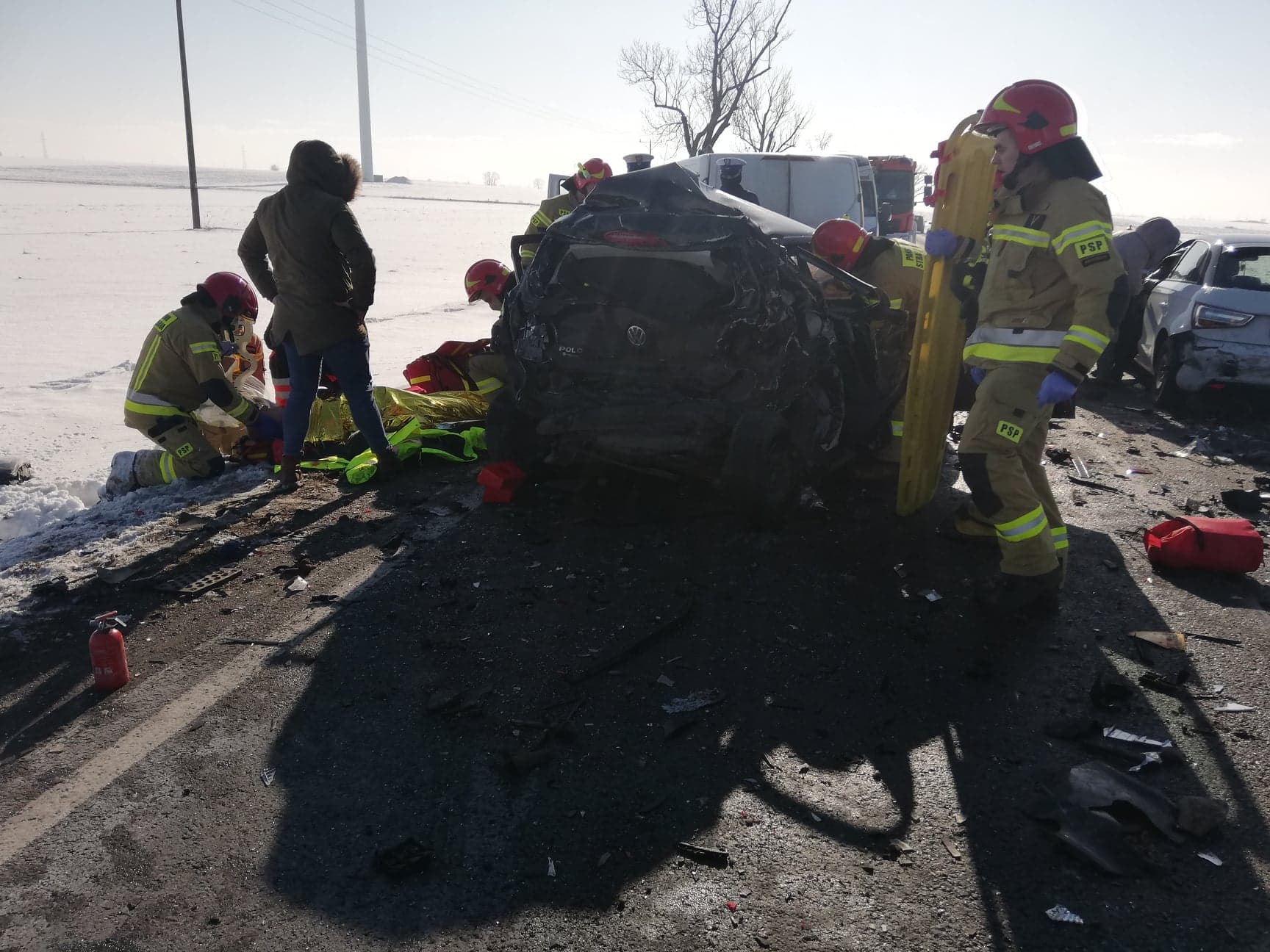 Działania straży pożarnej polegały na zabezpieczeniu miejsca zdarzenia, następnie strażacy wykonali dostęp do uczestników zdarzenia i wspólnie z ratownikami medycznymi przystąpili do ich ewakuacji na noszach typu deska do będących na miejscu karetek pogotowia. Trzy osoby spośród czterech poszkodowanych wymagały przewiezienia do Szpitalnego Oddziału Ratunkowego. Po przekazaniu osób poszkodowanych pod opiekę ZRM strażacy w rozbitych pojazdach odłączyli akumulatory i zabezpieczyli wycieki płynów technicznych. Po zakończonych czynnościach realizowanych przez grupę dochodzeniową z Policji uszkodzone pojazdy zostały zabrane przez pomoc drogową, a z jezdni zostały usunięte elementy karoserii samochodowej oraz wycieki płynów technicznych.