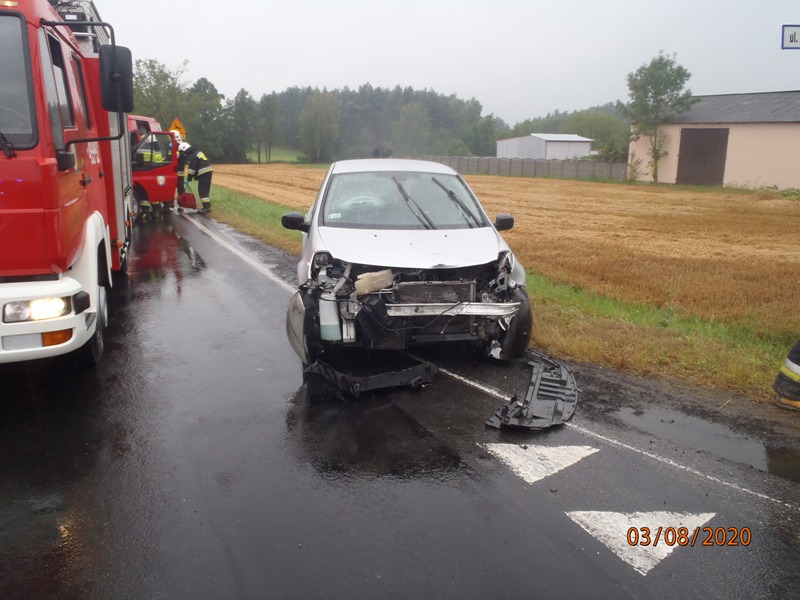 Strażacy po zabezpieczaniu terenu działań przystąpili do oceny stanu uczestników zdarzenia, udzielając poszkodowanym pomocy medycznej adekwatnej do poniesionych obrażeń. Szczególną opieką objęto małe dziecko, które otrzymało od strażaków misia ratownika. Z uwagi na intensywne opady deszczu osoby, które nie odniosły żadnych obrażeń umieszczono w pojeździe pożarniczym zapewniając im komfort termiczny. W momencie przybycia służb medycznych poszkodowanych przekazano pod opiekę zespołu ratownictwa medycznego, który z uwagi na dużą liczbę uczestników zdarzenia podjął decyzję o zadysponowaniu na miejsce wypadku kolejnej karetki pogotowia. Po wykonaniu badań decyzją kierownika zespołu do szpitalnego oddziału ratunkowego przewieziono 3 osoby dorosłe oraz dziecko celem dalszej diagnostyki. W dalszej części działań w uszkodzonych pojazdach odłączono akumulatory oraz zabezpieczono wycieki płynów eksploatacyjnych. Z uwagi na duże natęzenie ruchu drogowego wyznaczono tymczasowy objazd miejsca wypadku drogami lokalnymi. Po zakończeniu czynności realizowanych przez funkcjonariuszy Policji oraz usunięciu uszkodzonych pojazdów z jezdni wznowiono ruch pojazdów na drodze krajowej. Działania straży pożarnej na miejscu wypadku trwały łącznie 02 godziny i 31 minut.
