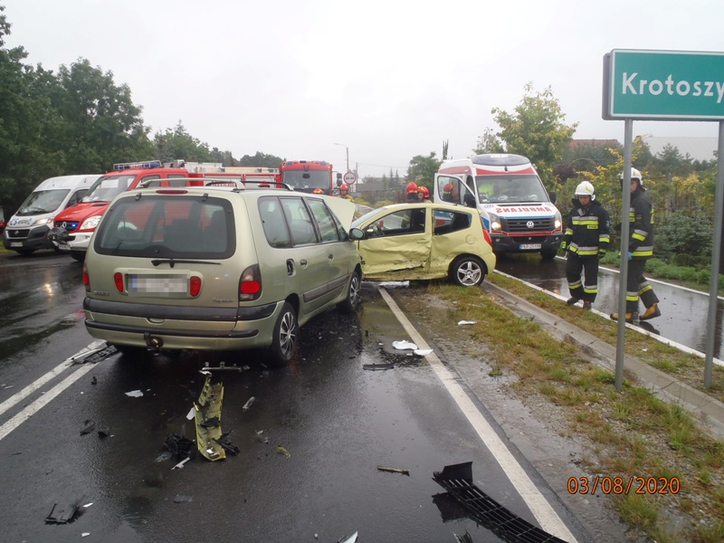 Cztery osoby poszkodowane, w tym małe dziecko to bilans wypadku drogowego z udziałem trzech samochodów osobowych w Krotoszynie na ul. Zdunowskiej. Zgłoszenie do Stanowiska Kierowania Komendanta Powiatowego PSP w Krotoszynie wpłynęło w poniedziałek 03 sierpnia 2020 roku o godzinie 16:08.