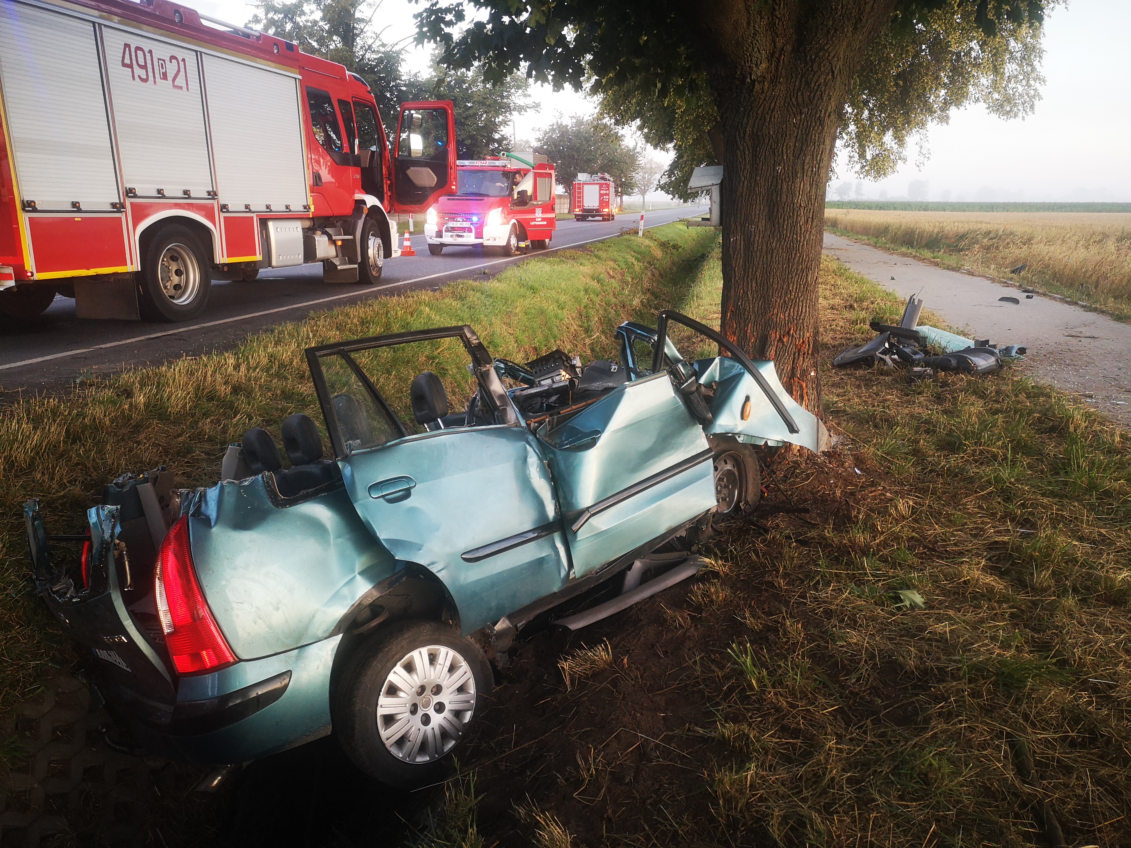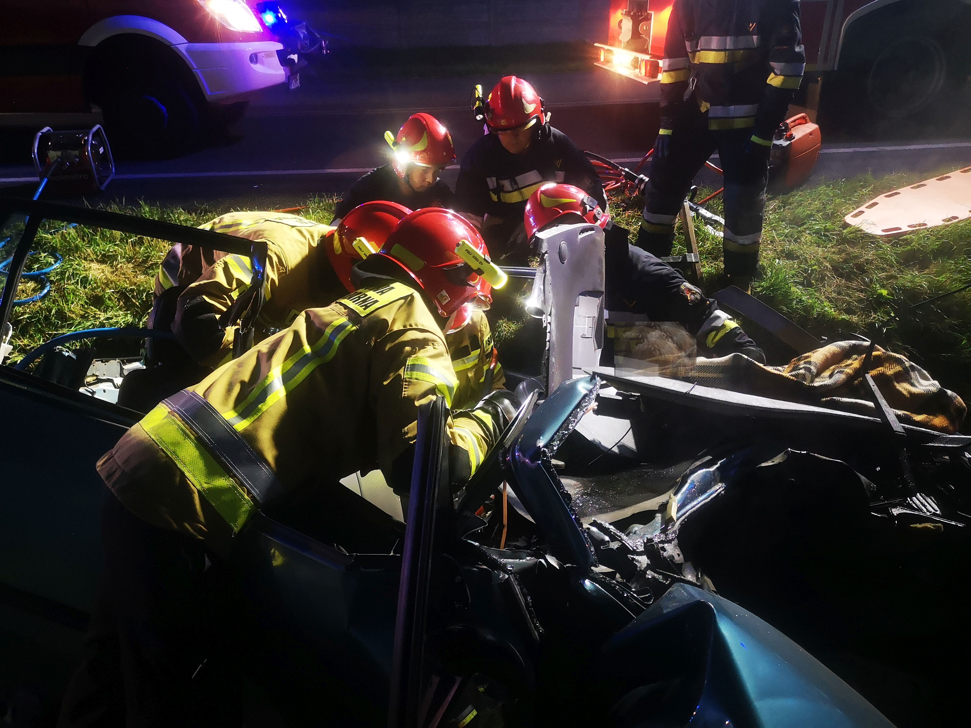 Strażacy po zabezpieczeniu i oświetleniu terenu działań przystąpili do cięcia i rozginania karoserii pojazdu celem wykonania dostępu do osoby poszkodowanej. Decyzją Kierującego Działaniem Ratowniczym do wnętrza rozbitego samochodu wprowadzono ratownika, który na bieżąco kontrolował stan mężczyzny udzielając pomocy medycznej adekwatnej do możliwości i stanu poszkodowanego. Presja czasu była ogromna, gdyż kierowca wymagał pilnej hospitalizacji z uwagi na poniesione obrażenia. Wykorzystane techniki ratownictwa drogowego z użyciem kilku zestawów hydraulicznych przyniosły zamierzony efekt i osoba poszkodowana została ewakuowana na noszach typu deska do karetki pogotowia. Decyzją Kierownika Zespołu Ratownictwa Medycznego uczestnika zdarzenia przetransportowano do Szpitalnego Oddziału Ratunkowego. W dalszej części działań Jednostki Ochrony Przeciwpożarowej wspomagały czynności realizowane przez funkcjonariuszy Policji w zakresie oświetlenia oraz zabezpieczenia miejsca wypadku. Interwencja w której uczestniczyły 4 zastępy i 17 strażaków trwała łącznie 02 godziny i 43 minuty.