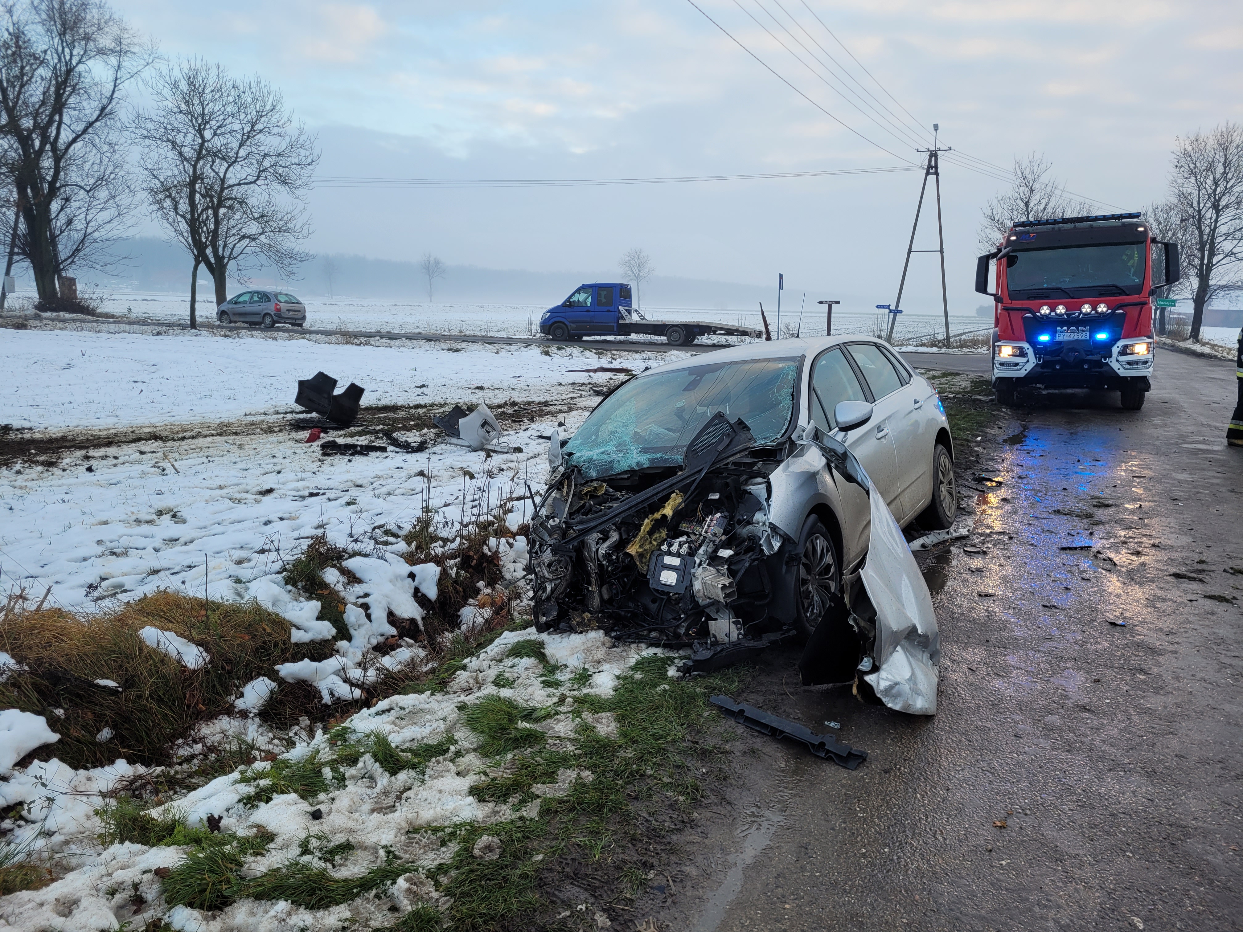 Podczas rozpoznania ustalono, że na skrzyżowaniu dróg powiatowych doszło do wypadku komunikacyjnego z udziałem dwóch samochodów osobowych. W wyniku zderzenia jedno z aut Seat Alhambra stoi poza obrysem drogi w przydrożnym polu, natomiast drugi pojazd Citroen C4 z uszkodzonym przodem znajduje się na kołach na jezdni. Łącznie pojazdami podróżowały dwie osoby, z czego jedna z nich samodzielnie opuściła uszkodzone środki transportu przed przybyciem Jednostek Ochrony Przeciwpożarowej. W wyniku zdarzenia uszkodzona została przydrożna kapliczka. Dwóch uczestników zdarzenia uskarżało się na dolegliwości bólowe i wymagało diagnostyki medycznej.