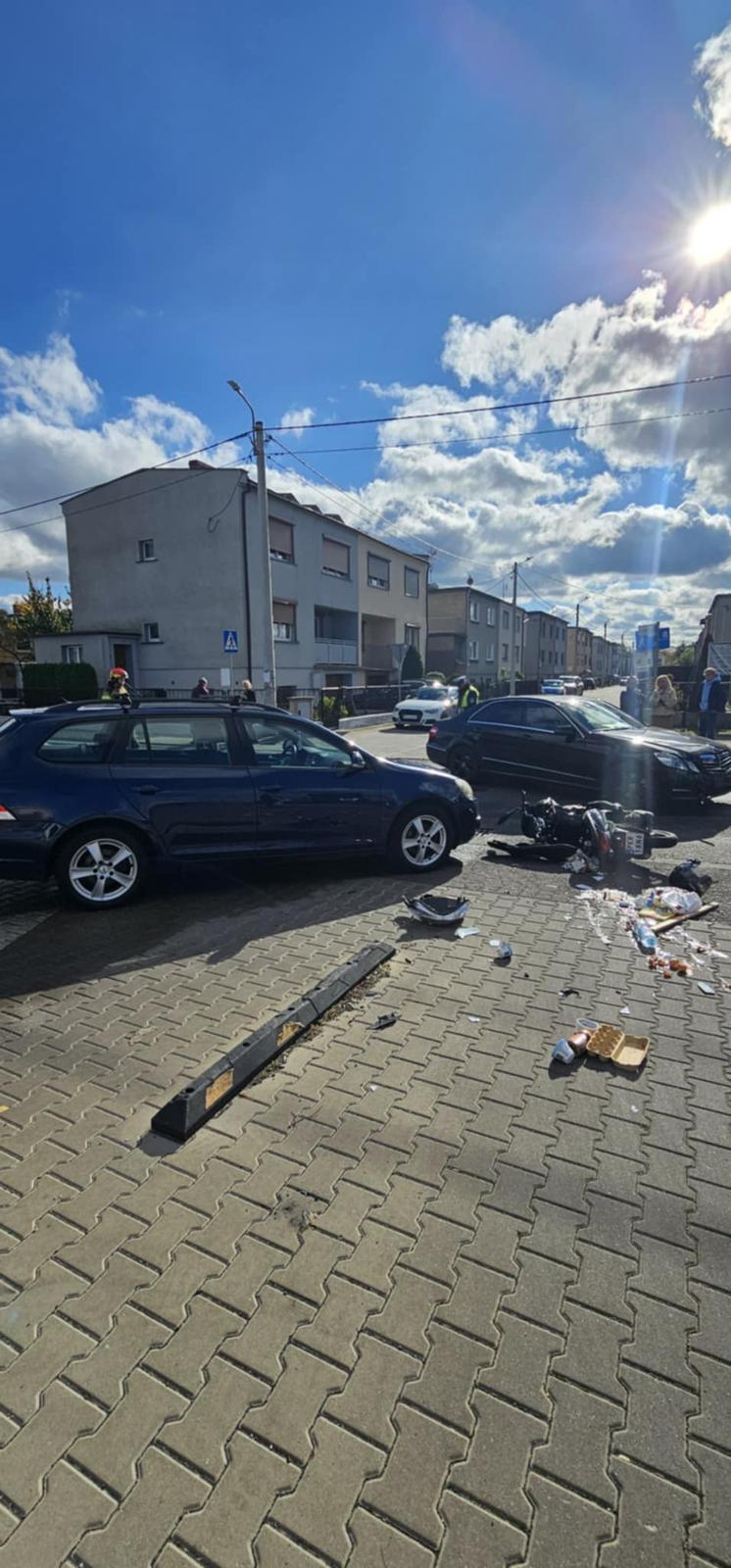 Wypadek z udziałem jednośladu i dwóch pojazdów osobowych.