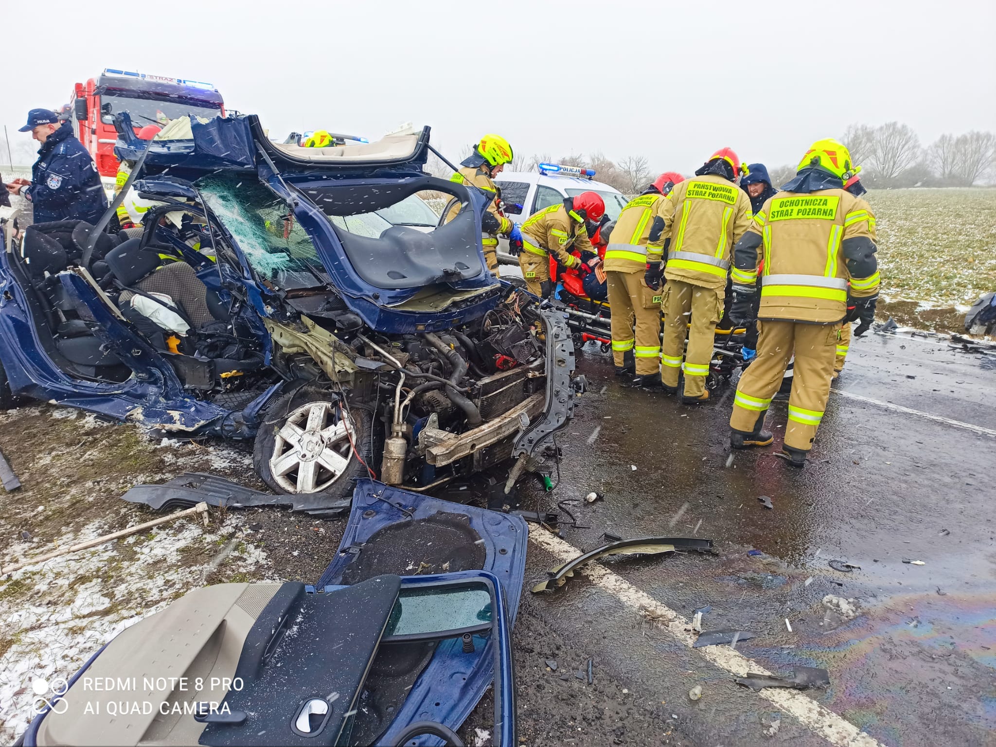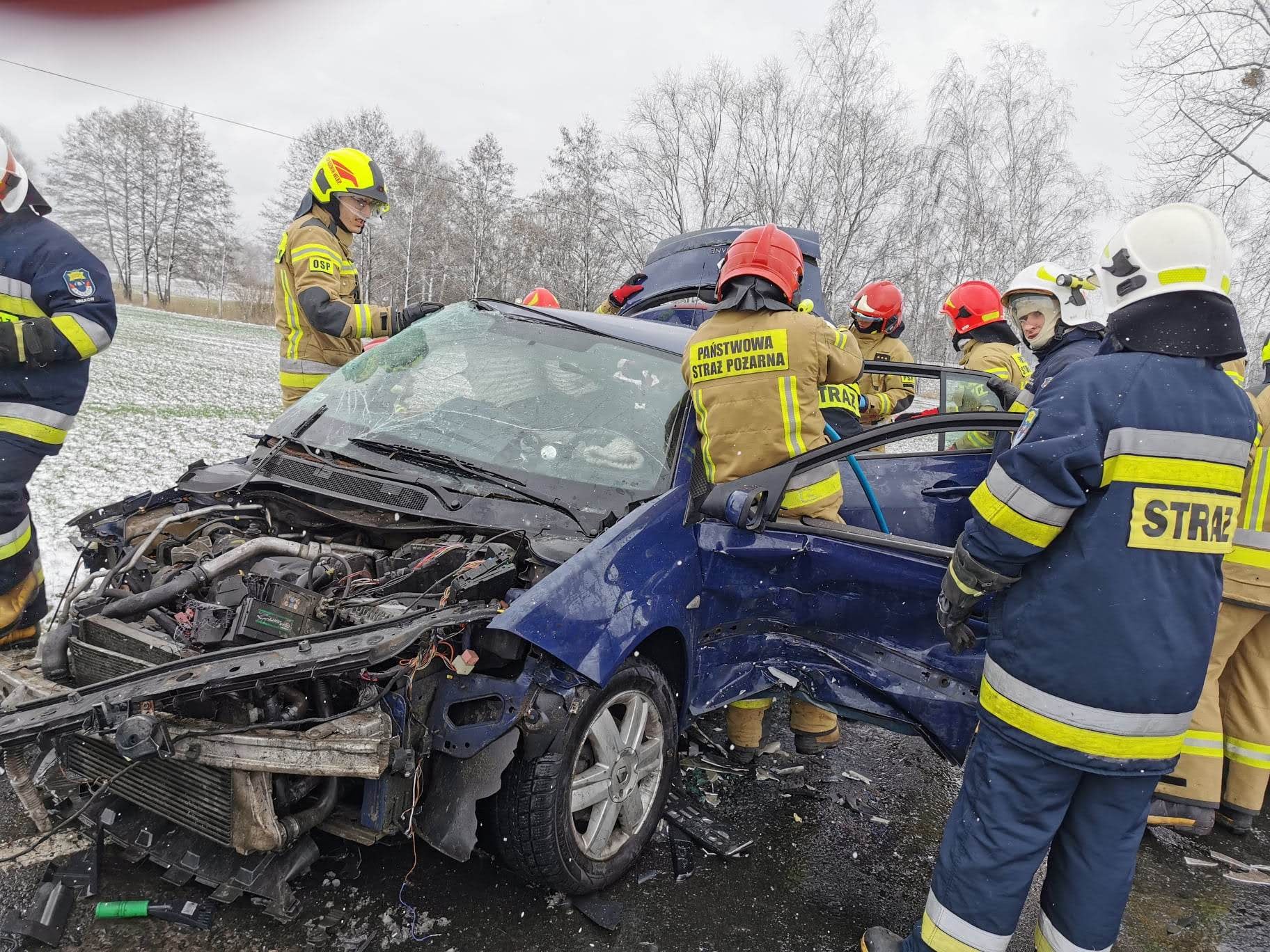 Po przybyciu na miejsce zdarzenia pierwszych jednostek straży pożarnej i zabezpieczeniu terenu działań strażacy dokonali oceny stanu uczestników zdarzenia. W tylnej części najbardziej zdeformowanego pojazdu pozostawał poszkodowany mężczyzna, do którego dostęp był utrudniony, stąd decyzja o usunięciu pojedynczych elementów konstrukcyjnych samochodu osobowego przy użyciu narzędzi hydraulicznych. Pozostała część uczestników zdarzenia w tym matka z dwuletnim dzieckiem opuścili samodzielnie uszkodzone środki transportu i zostali przekazani służbom medycznym. W momencie uzyskania dostępu do mężczyzny i możliwości jego bezpiecznej ewakuacji decyzją kierownika zespołu osobę poszkodowaną przetransportowano na noszach do karetki pogotowia. Po szczegółowej diagnostyce łącznie trzech uczestników zdarzenia trafiło do placówek medycznych celem dalszej hospitalizacji. Na szczęście najmłodszy uczestnik zdarzenia nie odniósł żadnych obrażeń i został przekazany pod opiekę rodziny, by czuł się bezpiecznie. Działania na miejscu wypadku utrudniały niekorzystne i zmienne warunki atmosferyczne, które znacznie opóźniły start śmigłowca Lotniczego Pogotowia Ratunkowego z wyznaczonego przez strażaków miejsca lądowania. Do czasu likwidacji zagrożenia czasowo zamknięto ruch pojazdów na wyznaczonym odcinku drogi krajowej, dlatego obecni na miejscu funkcjonariusze Policji wyznaczyli objazdy. Po zakończeniu czynności dochodzeniowych z jezdni usunięto elementy karoserii samochodowych oraz wycieki płynów eksploatacyjnych. Uszkodzone środki transportu zostały zabrane przez pomoc drogową. W momencie całkowitej likwidacji zagrożenia przywrócono ruch całą szerokością jezdni. Działania straży pożarnej trwały łącznie 3 godziny i 26 minut.