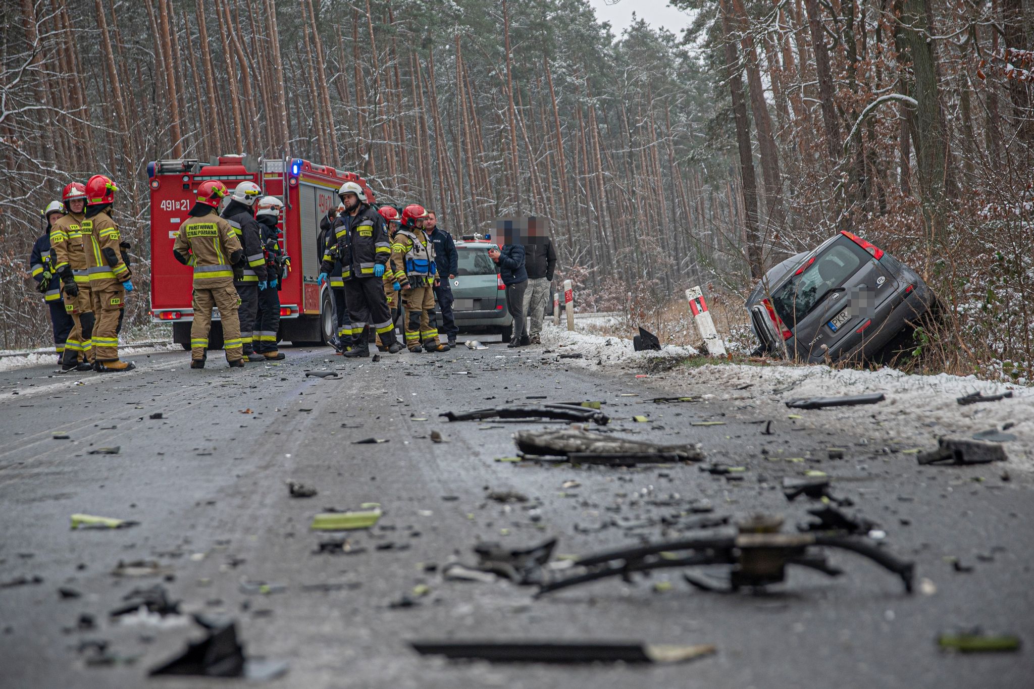 Na miejscu w wyniku przeprowadzonego rozpoznania KDR ustalił, że doszło do zderzenia dwóch samochodów osobowych. Jeden pojazd znajdował się w rowie, a drugi stał na drodze. Pojazdami podróżowały dwie osoby, które w chwili przybycia na miejsce zastępów straży pożarnej znajdowały się poza nimi.
