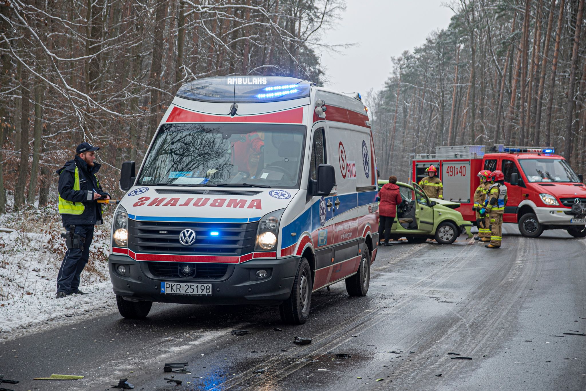 Strażacy zabezpieczyli miejsce zdarzenia, jedna osoba uskarżała się na dolegliwości bólowe więc strażacy do czasu przybycia Zespołu Ratownictwa Medycznego udzielili jej kwalifikowanej pierwszej pomocy. Po dotarciu personelu medycznego osobę poszkodowaną przekazano ratownikom medycznym. W rozbitych pojazdach strażacy odłączyli akumulatory i zabezpieczyli wycieki płynów eksploatacyjnych. Po zakończonych czynnościach realizowanych przez funkcjonariuszy policji strażacy przystąpili do usuwania pozostałości po zdarzeniu, które mogły stwarzać zagrożenie dla innych uczestników drogi.