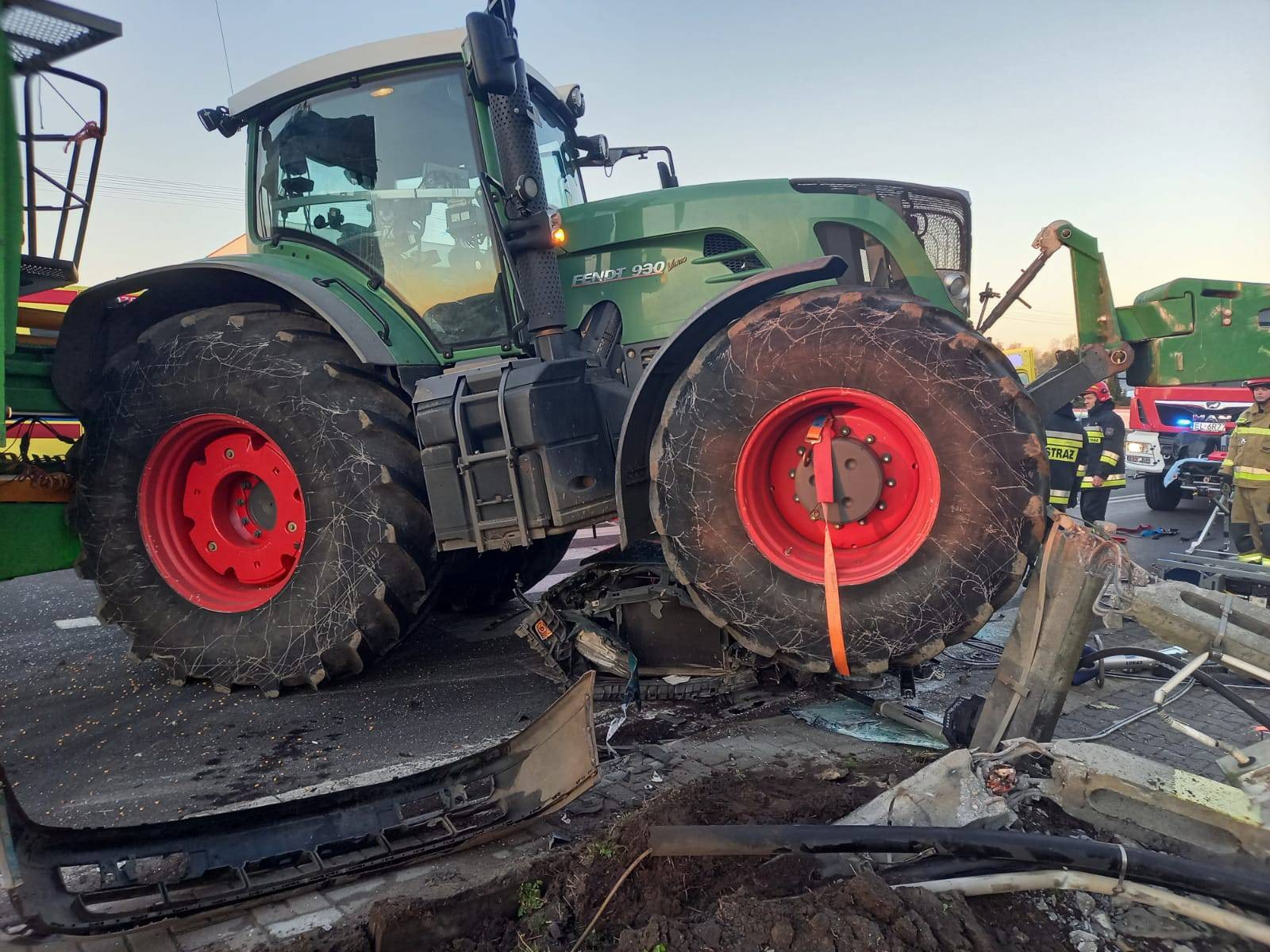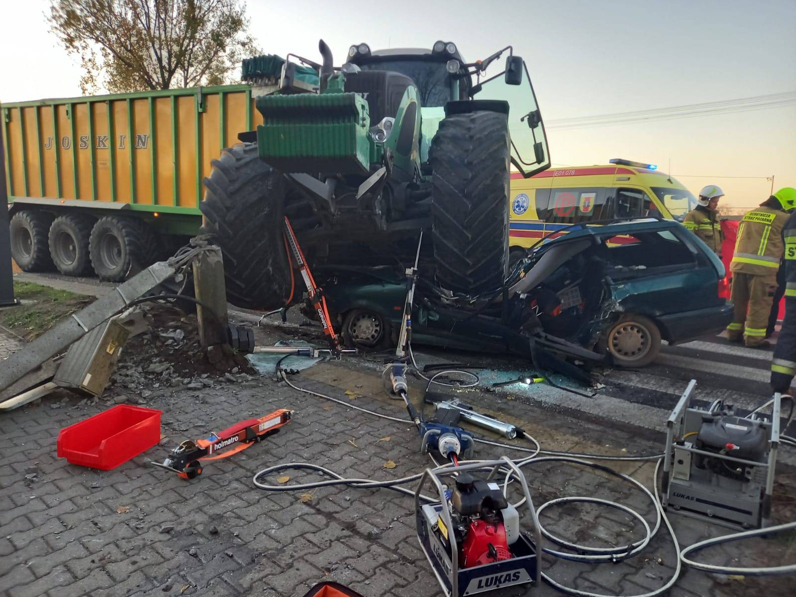 W pierwszej fazie działań strażacy wykonali stabilizację obu pojazdów, a następnie przy pomocy narzędzi hydraulicznych uniesiono ciągnik rolniczy w celu wykonania dostępu i wydobycia kierowcy pojazdu osobowego.