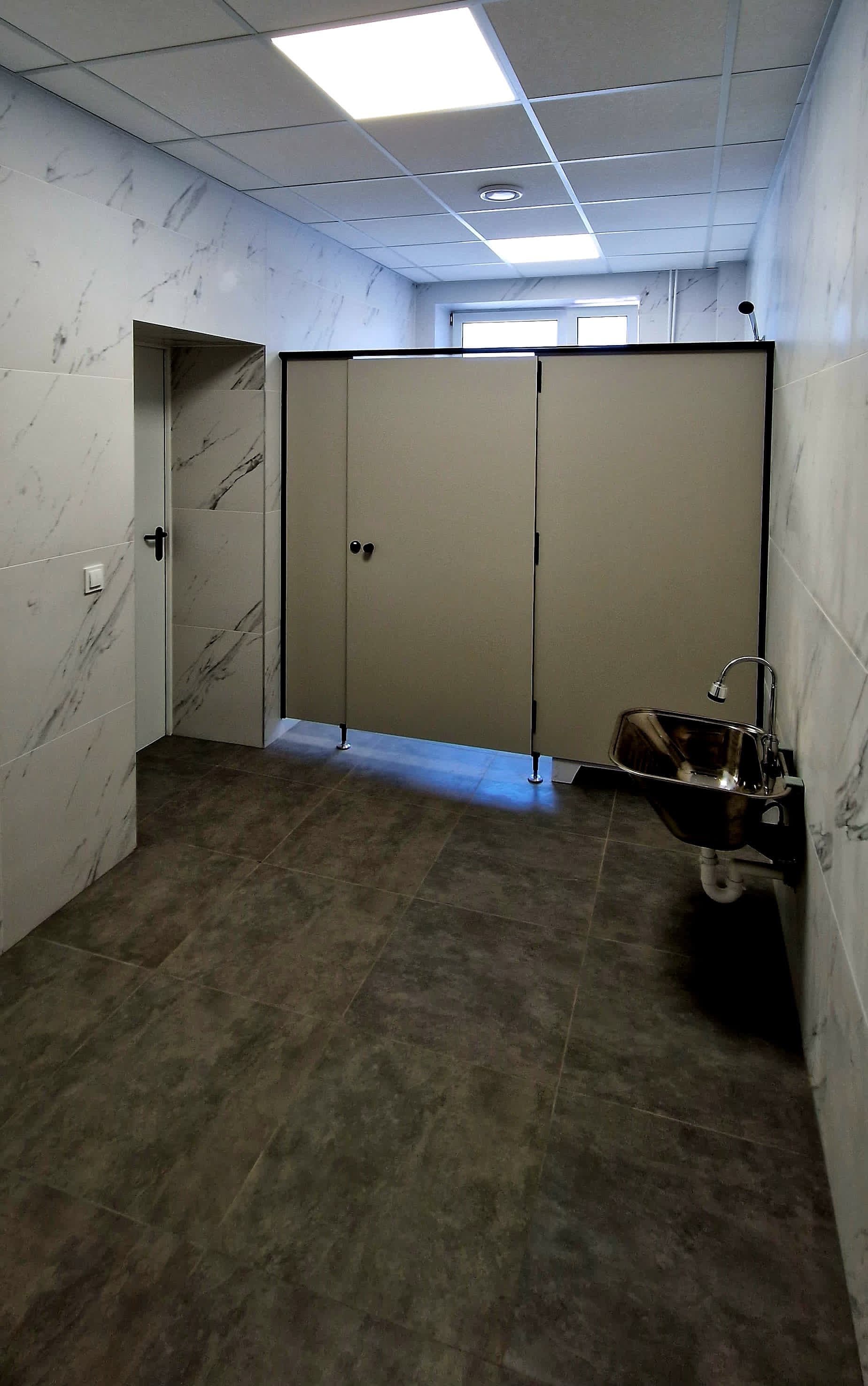 Pralnio-suszarnia: adaptacja pomieszczenia na pralnio-suszarnię odzieży specjalnej wraz z montażem prysznica, dostosowanie instalacji elektrycznej do nowego wyposażenia.