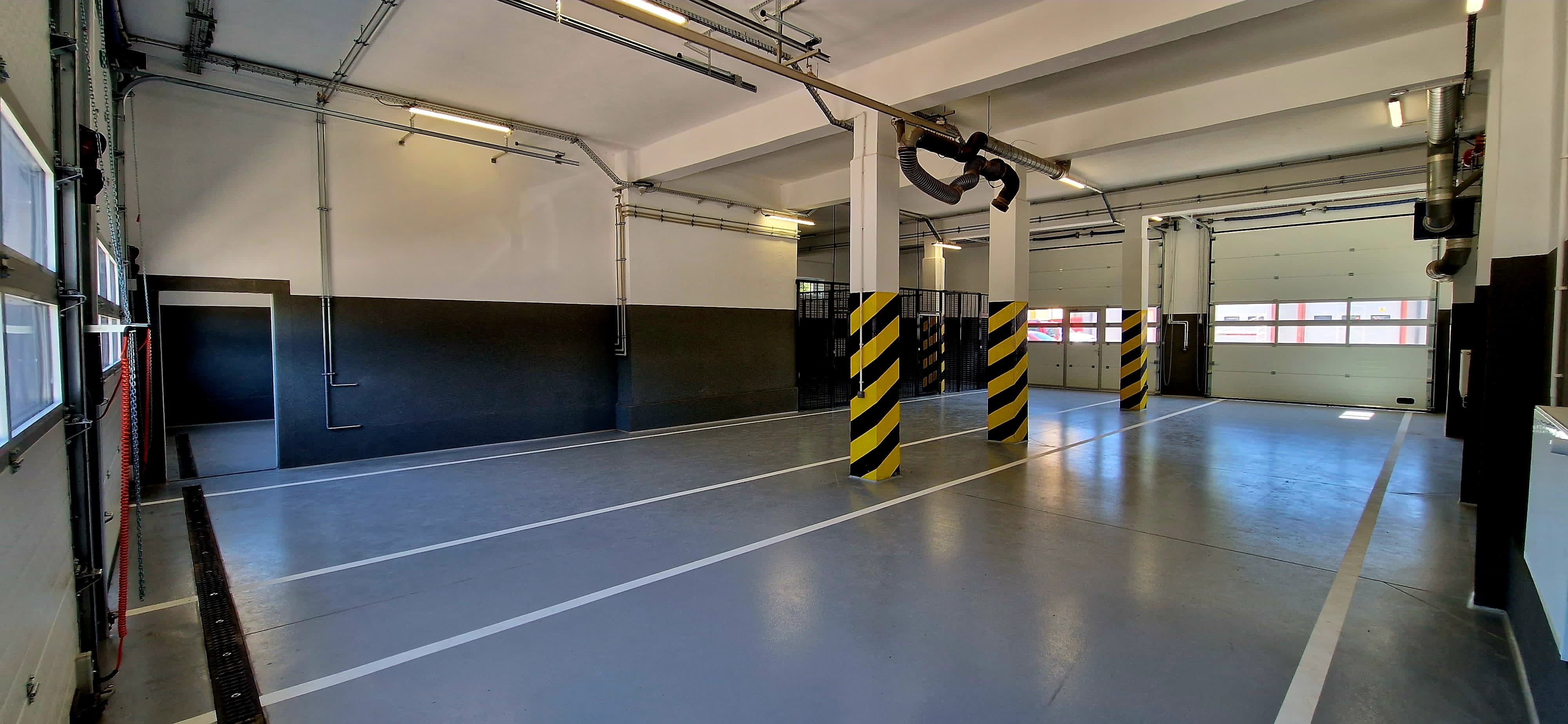 Garaże: obniżenie posadzek w celu uzyskania wymaganej wysokości (min. 3,75 m w świetle bram), wymiana bram garażowych oraz montaż semaforów wyjazdowych, odświeżenie ścian i sufitu, wymiana instalacji elektrycznej, modernizacja oświetlenia na energooszczędne z wydzielonymi obwodami oświetlenia nocnego i alarmowego, wymiana instalacji grzewczej, wykonanie szatni dla zmian służbowych do przechowywania odzieży specjalnej.