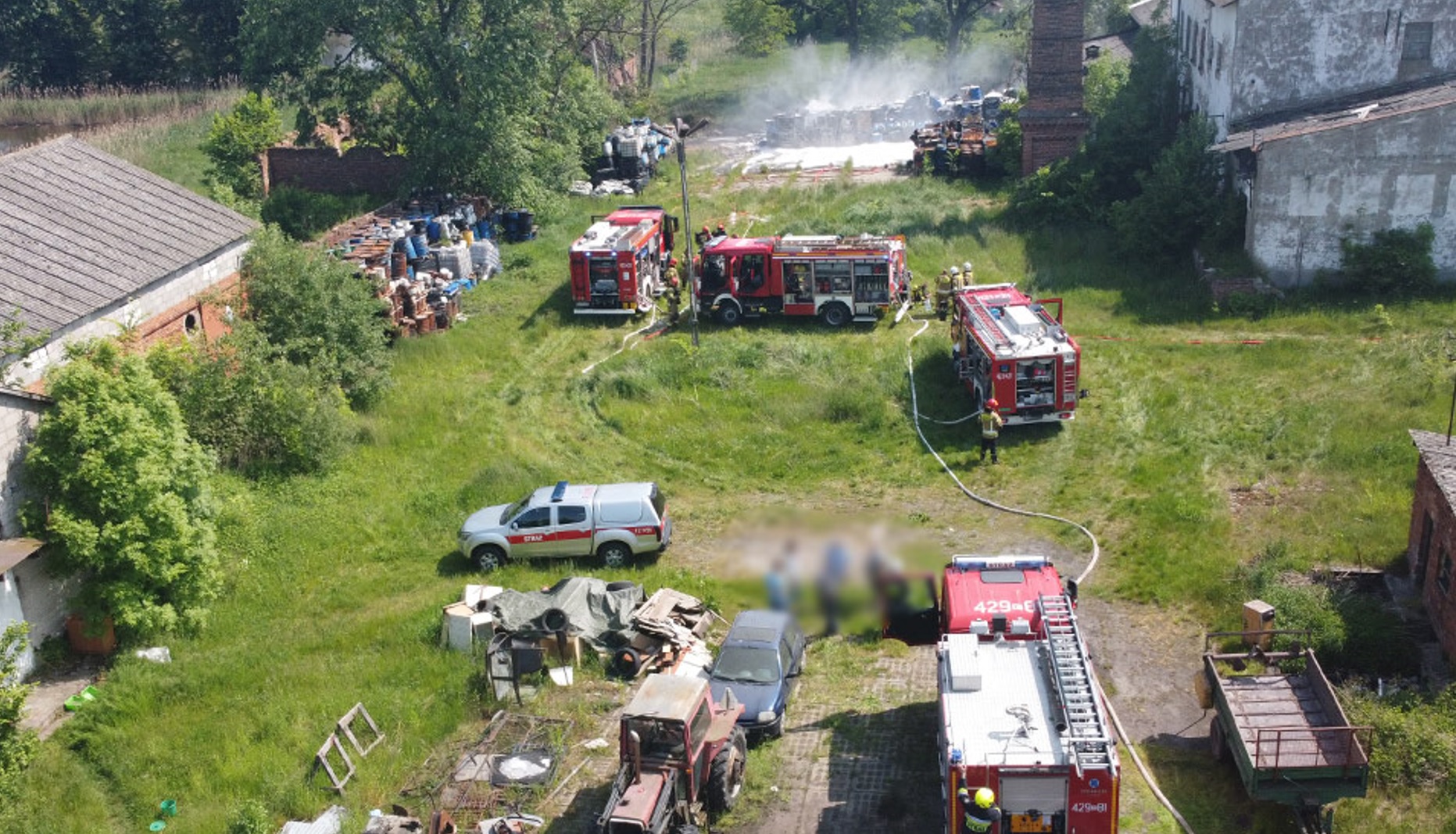 Po dojeździe na miejsce zdarzenia pierwszych zastępów straży pożarnych stwierdzono, że pożarem objęte są beczki oraz zbiorniki z nieznaną substancja na placu składowym. Pożar stwarzał zagrożenie dla budynku znajdującego się w bliskiej odległości od pożaru.
