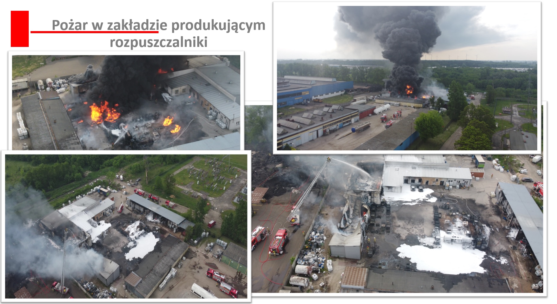 Po dojeździe na miejsce zdarzenia pierwszych zastępów straży pożarnych stwierdzono, że pożarem objęte są zbiorniki z rozpuszczalnikiem znajdujące się na placu składowym oraz część budynku magazynowego. Pożar rozwijał się w różnych kierunkach, stwarzając zagrożenie dla pozostałych budynków na terenie zakładu.
