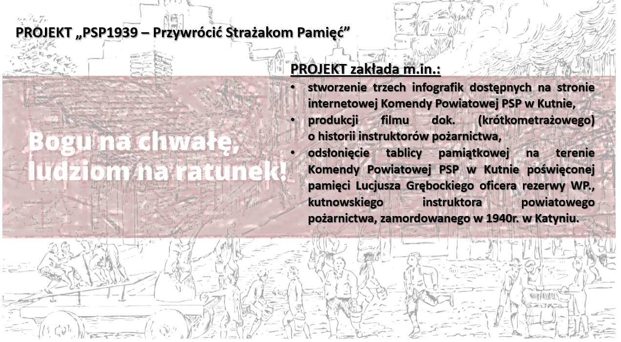 Projekt „PSP1939 – Przywrócić Strażakom Pamięć” to wyzwanie polegające na chęci upowszechnienia wiadomości i przybliżenia wiedzy o kutnowskich instruktorach powiatowych pożarnictwa, którzy w okresie II RP tworzyli zręby zawodowego pożarnictwa na terenie powiatu kutnowskiego.