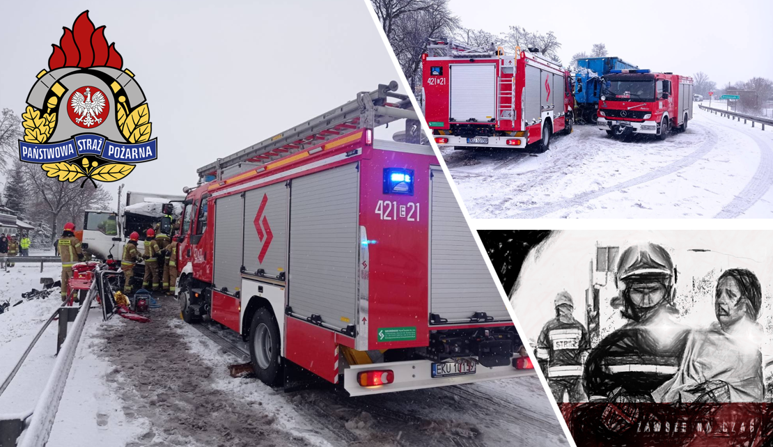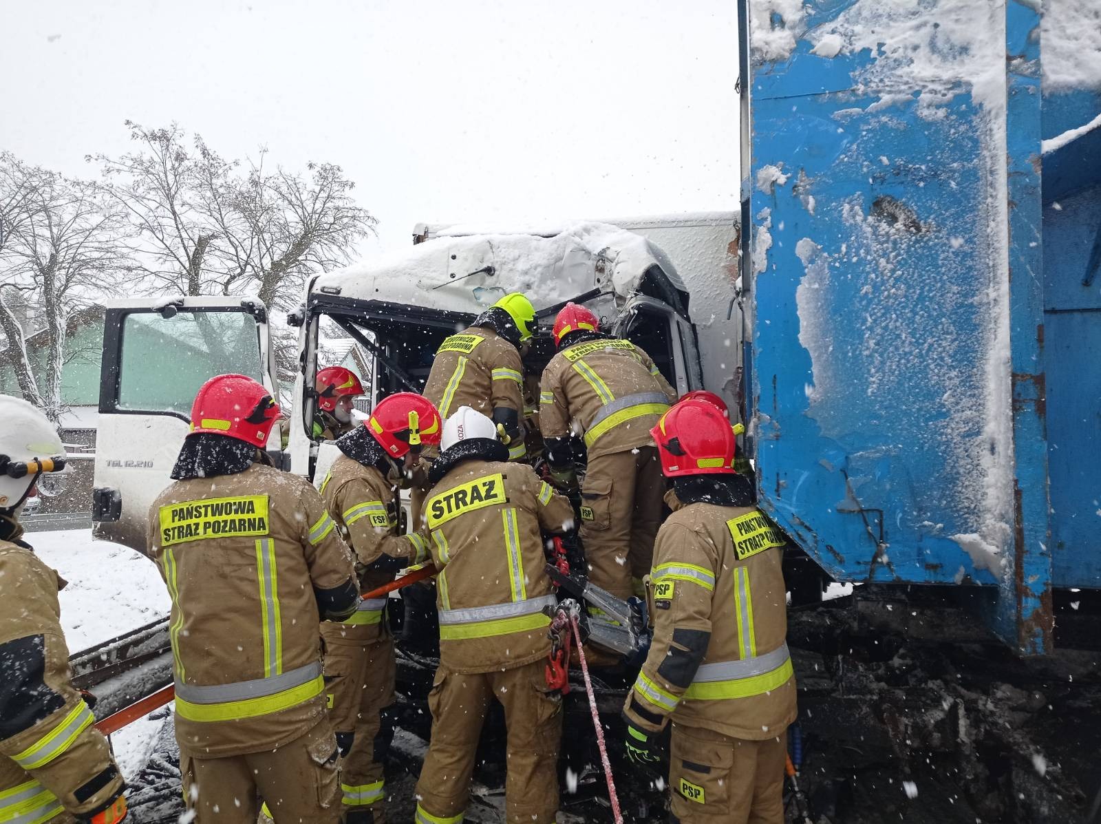Po dojeździe na miejsce zdarzenia pierwszych zastępów straży pożarnych, stwierdzono że samochód ciężarowy MAN na skrzyżowaniu drogi krajowej DK 92 z drogą gminną uderzył w drugi samochód ciężarowy MAN z przyczepa. Działania straży pożarnej polegały na zabezpieczeniu miejsca zdarzenia, odłączeniu zacisków akumulatorów oraz dotarcia do kierowcy samochodu ciężarowego. Ratownicy przy użyciu narzędzi hydraulicznych wykonali dostęp do osoby poszkodowanie poprzez usunięcie drzwi oraz elementów konstrukcyjnych pojazdu. Równocześnie ratownicy udzielili kierowcy kwalifikowanej pierwszej pomocy polegającej na stabilizacji odcinka szyjnego i kończyny prawej oraz na wsparciu psychicznym. Po przyjeździe na miejsce zdarzenia Zespołu Ratownictwa Medycznego, pod nadzorem lekarza ratownicy wydobyli poszkodowanego mężczyznę na noszach typu deska, a następnie został przewieziony na SOR w Kutnie.