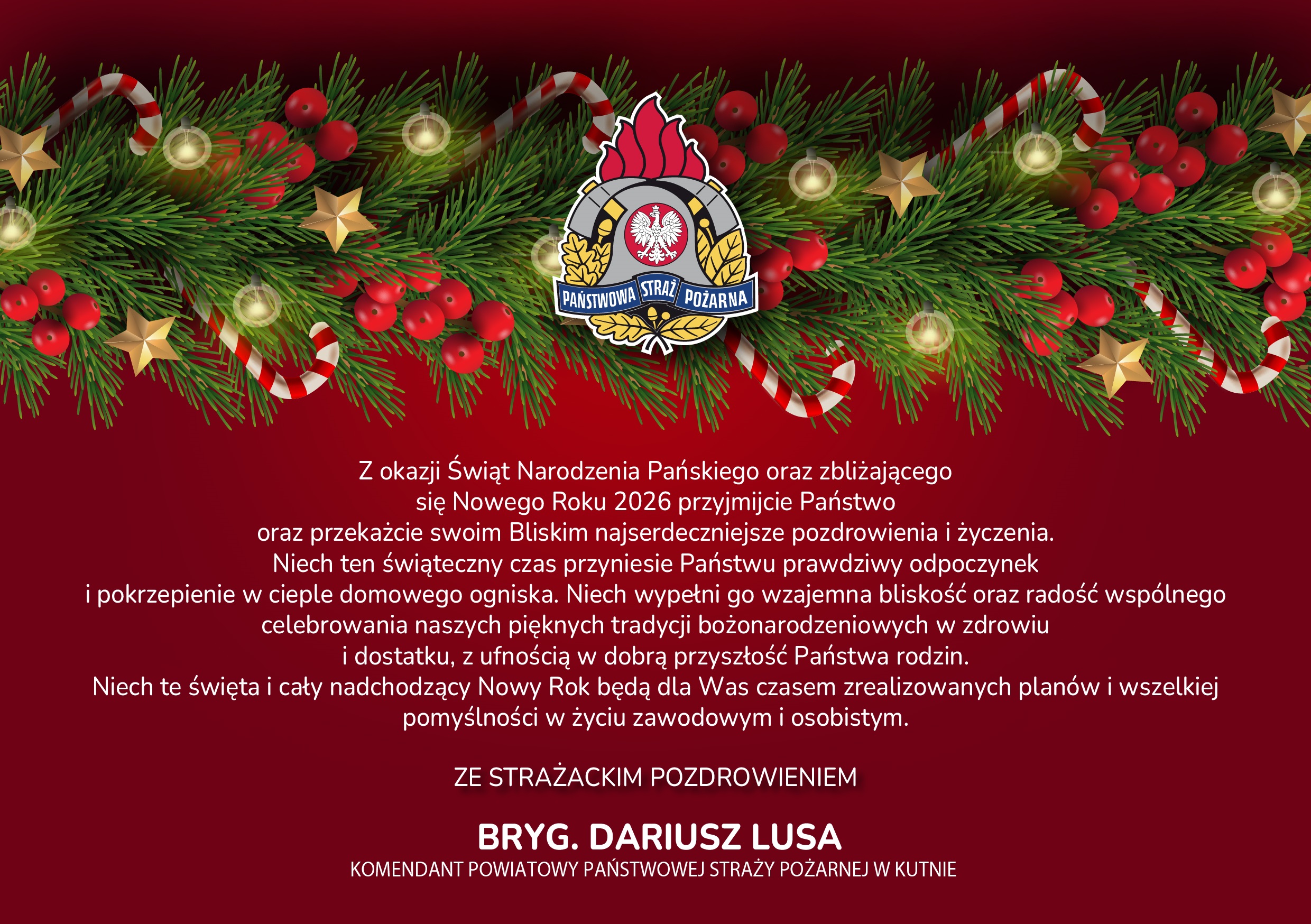 Życzenia Świąteczne Komendanta Powiatowego PSP w Kutnie 23.12.2025 Zdjęcia (2) Pokaż zdjęcie 1 z galerii. Pokaż zdjęcie 2 z galerii.
