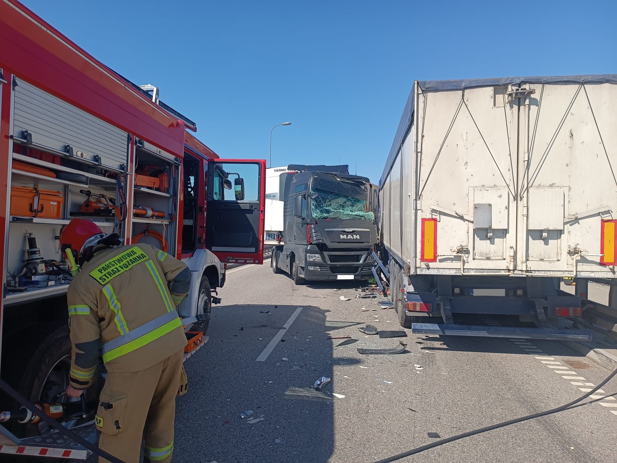 09 maja 2023 roku o godz. 10:24 dyżurny operacyjny Stanowiska Kierowania Komendanta Powiatowego Państwowej Straży Pożarnej w Kwidzynie, przyjął zgłoszenie o zderzeniu czołowym dwóch samochodów ciężarowych, do którego doszło w Opaleniu, na moście nad Wisłą na drodze krajowej nr 90. Do zdarzenia zadysponowane zostały 3 zastępy z Jednostki Ratowniczo-Gaśniczej w Kwidzynie, 3 zastępy z Jednostki Ratowniczo-Gaśniczej w Tczewie, 1 zastęp z OSP Pastwa, 1 zastęp z OSP Tychnowy, 1 zastęp z OSP Opalenie, 2 zespoły ratownictwa medycznego, śmigłowiec Lotniczego Pogotowia Ratunkowego oraz 2 patrole Policji. Działania strażaków polegały na zabezpieczeniu miejsca zdarzenia, wykonaniu dostępu do jednego z kierujących przy użyciu narzędzi hydraulicznych, udzieleniu kwalifikowanej pierwszej pomocy dwóm osobom poszkodowanym, pomocy w usunięciu pojazdów z jezdni oraz uprzątnięciu jej nawierzchni.
