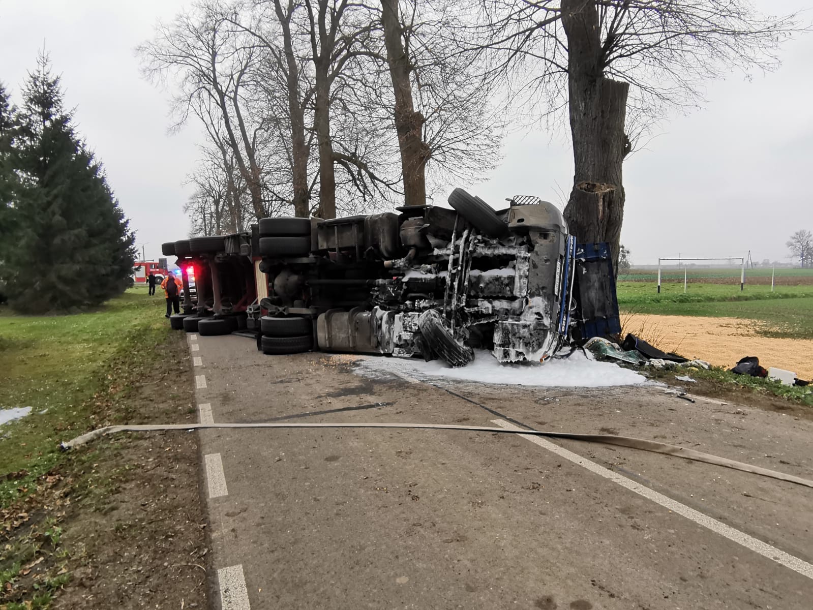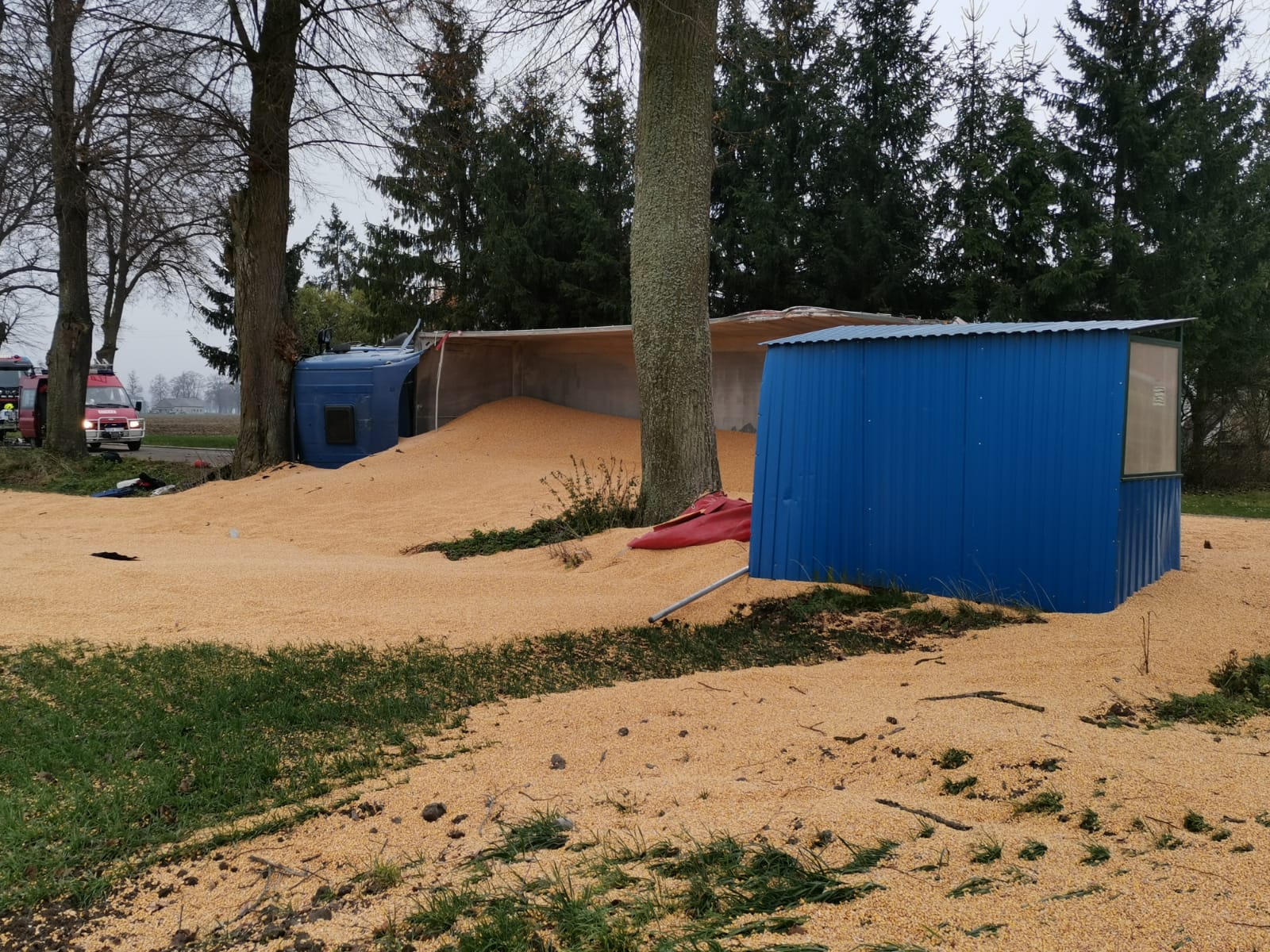 13 listopada 2021 r. o godz. 11:51 dyżurny operacyjny stanowiska kierowania komendanta powiatowego PSP w Kwidzynie, przyjął zgłoszenie o wypadku samochodu ciężarowego w miejscowości Szkaradowo Wielkie. Do zdarzenia zadysponowane zostały 2 zastępy z JRG w Kwidzynie, 1 zastęp z JRG Sztum, 2 zastępy z OSP Ryjewo, 1 patrol Policji i 1 zespół ratownictwa medycznego. Na miejscu zdarzenia strażacy zastali ciągnik siodłowy z naczepą, leżące na boku oraz uszkodzoną wiatę przystankową. Z naczepy na drogę i pola rozsypała się przewożona kukurydza. Świadkowie zdarzenia przy użyciu gaśnic ugasili pożar w komorze silnika. Strażacy zabezpieczyli miejsce zdarzenia, udzielili kierującemu kwalifikowanej pierwszej pomocy, kierowali ruchem drogowym, dokonali sorpcji płynów eksploatacyjnych i usunęli kukurydzę z jezdni. Straty oszacowano na około 250 tys. zł. Łączny czas akcji 5 h 5 min.