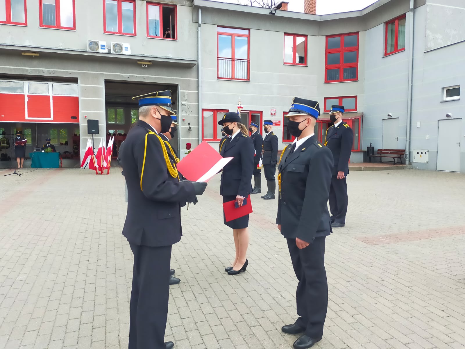 Zaproszeni goście oraz komendant powiatowy mł. bryg. Wojciech Berent dziękowali funkcjonariuszkom, funkcjonariuszom i pracownikom kwidzyńskiej Komendy za trud, zaangażowanie i poświęcenie na rzecz zapewnienia bezpieczeństwa naszego powiatu oraz rozwój tutejszej Komendy. Komendant powiatowy specjalne słowa wdzięczności skierował do przedstawicieli samorządu terytorialnego z naszego powiatu oraz do wspierających Państwową Straż Pożarną instytucji, firm i podmiotów, których z powodu obostrzeń sanitarnych zabrakło w tym wyjątkowym dniu na placu kwidzyńskiej Komendy.