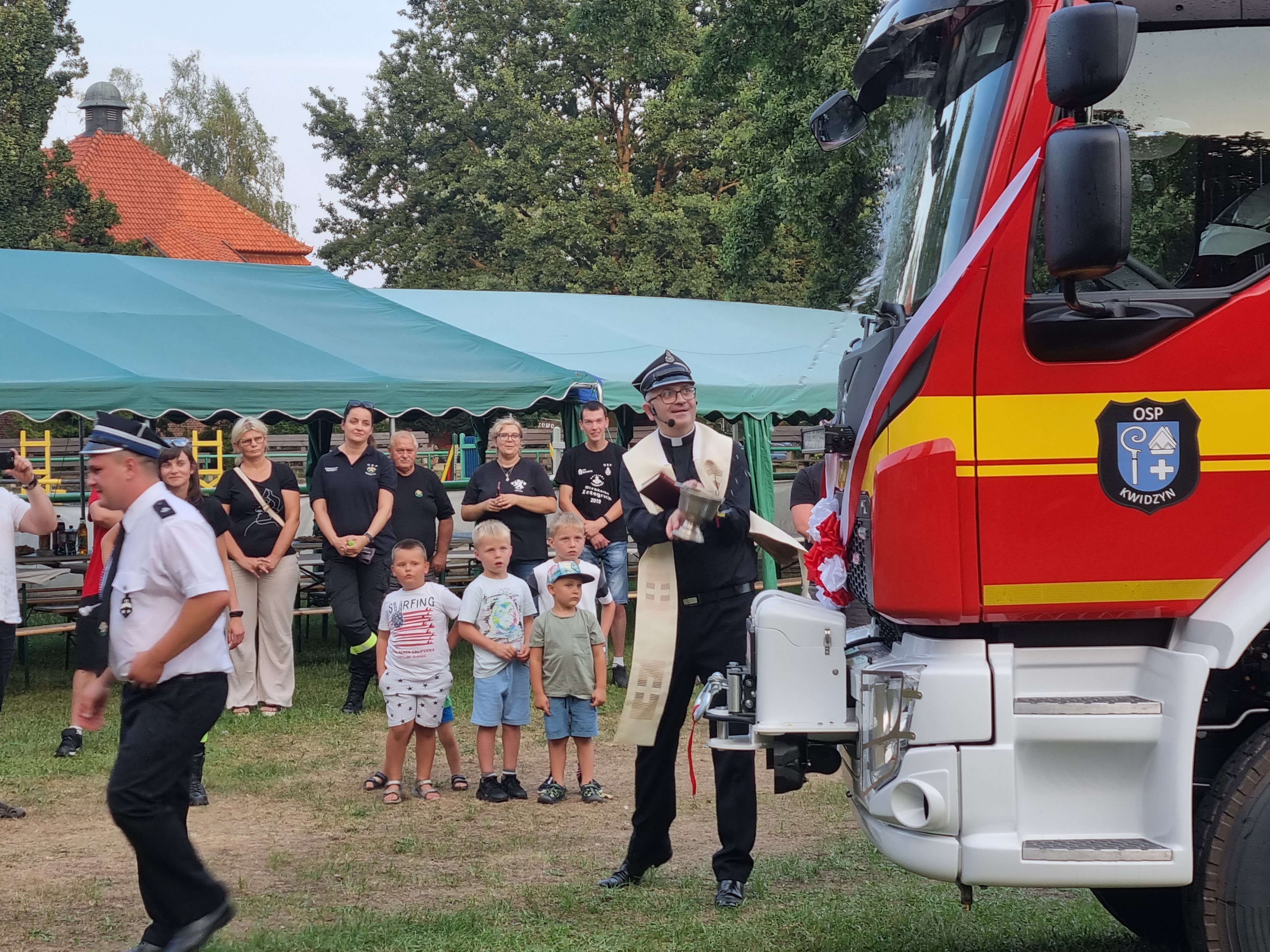 Ksiądz Daniel Pałkowski (członek OSP Kwidzyn) dokonał poświęcenia nowego Volvo.