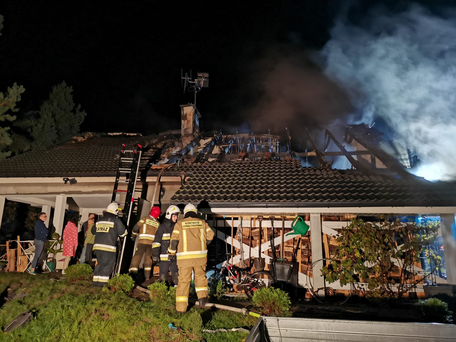 11 października 2021 r. o godz. 1:37 dyżurny operacyjny stanowiska kierowania komendanta powiatowego PSP w Kwidzynie, przyjął zgłoszenie o pożarze domu w Ryjewie przy ul. Słonecznej. Do zdarzenia zadysponowane zostały 4 zastęp z Jednostki Ratowniczo-Gaśniczej (JRG) w Kwidzynie, 1 zastęp z JRG Sztum, 2 zastępy z OSP Ryjewo, 1 zastęp z OSP Straszewo, 1 zastęp z OSP Benowo, Pogotowie Energetyczne i Policja. Na miejscu zdarzenia strażacy zastali pożar dachu na budynku mieszkalnym jednorodzinnym, pożarem objęty był także dach nad garażem, stanowiącym integralna część budynku oraz składowane przy domu drewno opałowe. Działania strażaków polegały na zabezpieczeniu miejsca zdarzenia, odłączeniu zasilania w energię elektryczną, podaniu czterech prądów gaśniczych wody, ewakuacji butli z gazem, wyprowadzeniu pojazdów z garażu, częściowej ewakuacji mienia, prowadzeniu prac rozbiórkowych konstrukcji i poszycia dachu, przewietrzeniu budynku i sprawdzeniu go pod kątem występowania tlenku węgla oraz sprawdzeniu pogorzeliska przy użyciu kamery termowizyjnej. Straty oszacowano na ok. 600 tys. zł. Przyczyna zdarzenia nieustalona.