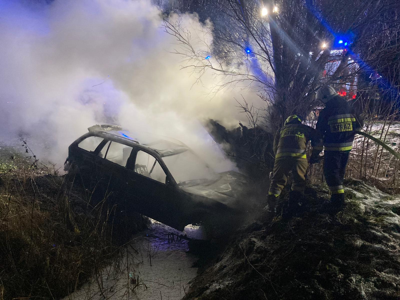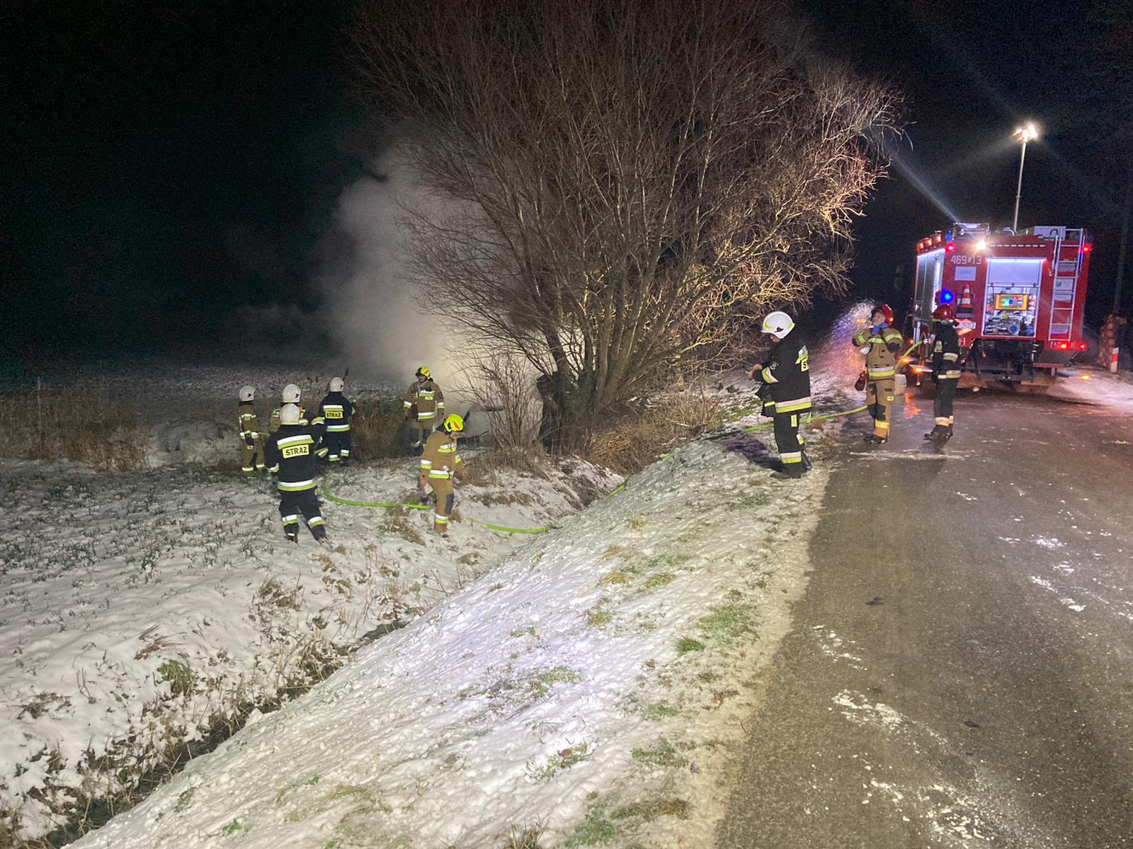 09 stycznia 2022 roku o godz. 03:59 dyżurny operacyjny stanowiska kierowania komendanta powiatowego PSP w Kwidzynie, przyjął zgłoszenie o pożarze samochodu marki BMW, do którego doszło w miejscowości Pułkowice gm. Ryjewo. Do zdarzenia zadysponowane zostały: 1 zastęp z Jednostki Ratowniczo-Gaśniczej w Kwidzynie, 1 zastęp z OSP Ryjewo, 1 zastęp z OSP Straszewo, 1 zespół ratownictwa medycznego (ZRM) oraz 2 patrole Policji. Na miejscu zdarzenia strażacy zastali samochód osobowy, który uderzył w drzewo i znajdował się poza jezdnią. Samochód i drzewo objęte były pożarem. Kierowca pojazdu przebywał pod opieką ZRM i został zabrany do szpitala. Strażacy zabezpieczyli i oświetlili teren akcji, podali jeden prąd gaśniczy na palący się samochód i drzewo. Przyczyna zdarzenia nieustalona.