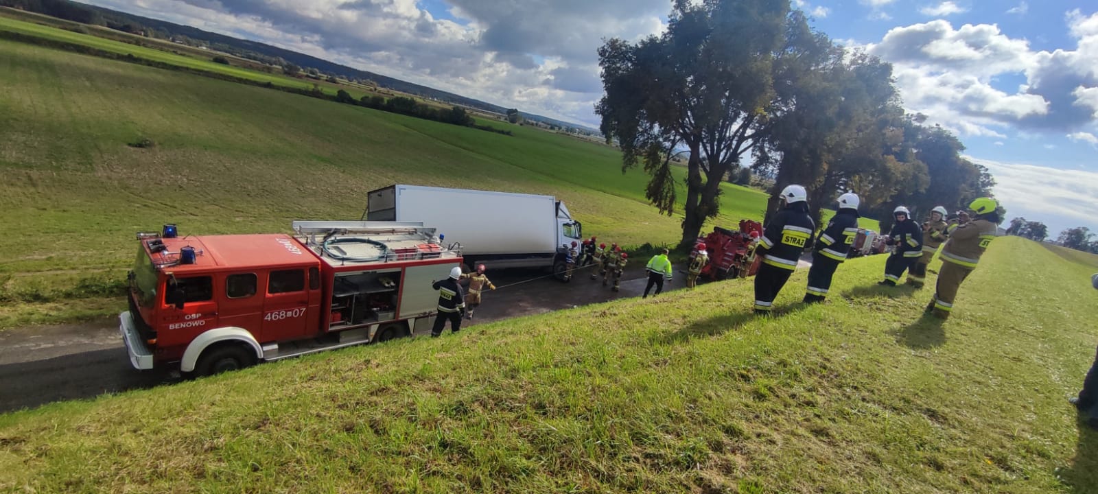 3 października 2022 roku o godz. 10:00 dyżurny operacyjny stanowiska kierowania komendanta powiatowego PSP w Kwidzynie, przyjął zgłoszenie o samochodzie ciężarowym, który zsunął się z jezdni i zagraża przewróceniem. Do zdarzenia w Benowie zadysponowana została Specjalistyczna Grupa Ratownictwa Technicznego TCZEW, 2 zastępy z Jednostki Ratowniczo-Gaśniczej w Kwidzynie, 1 zastęp z OSP Benowo, 1 zastęp z OSP Ryjewo oraz 1 patrol Policji. Działania strażaków polegały na zabezpieczeniu miejsca zdarzenia i zabezpieczeniu pojazdu przed ewentualnym dalszym zsunięciem lub przewróceniem. Po tych działaniach Specjalistyczna Grupa Ratownictwa Technicznego TCZEW dokonała wciągnięcia pojazdu na jezdnię.