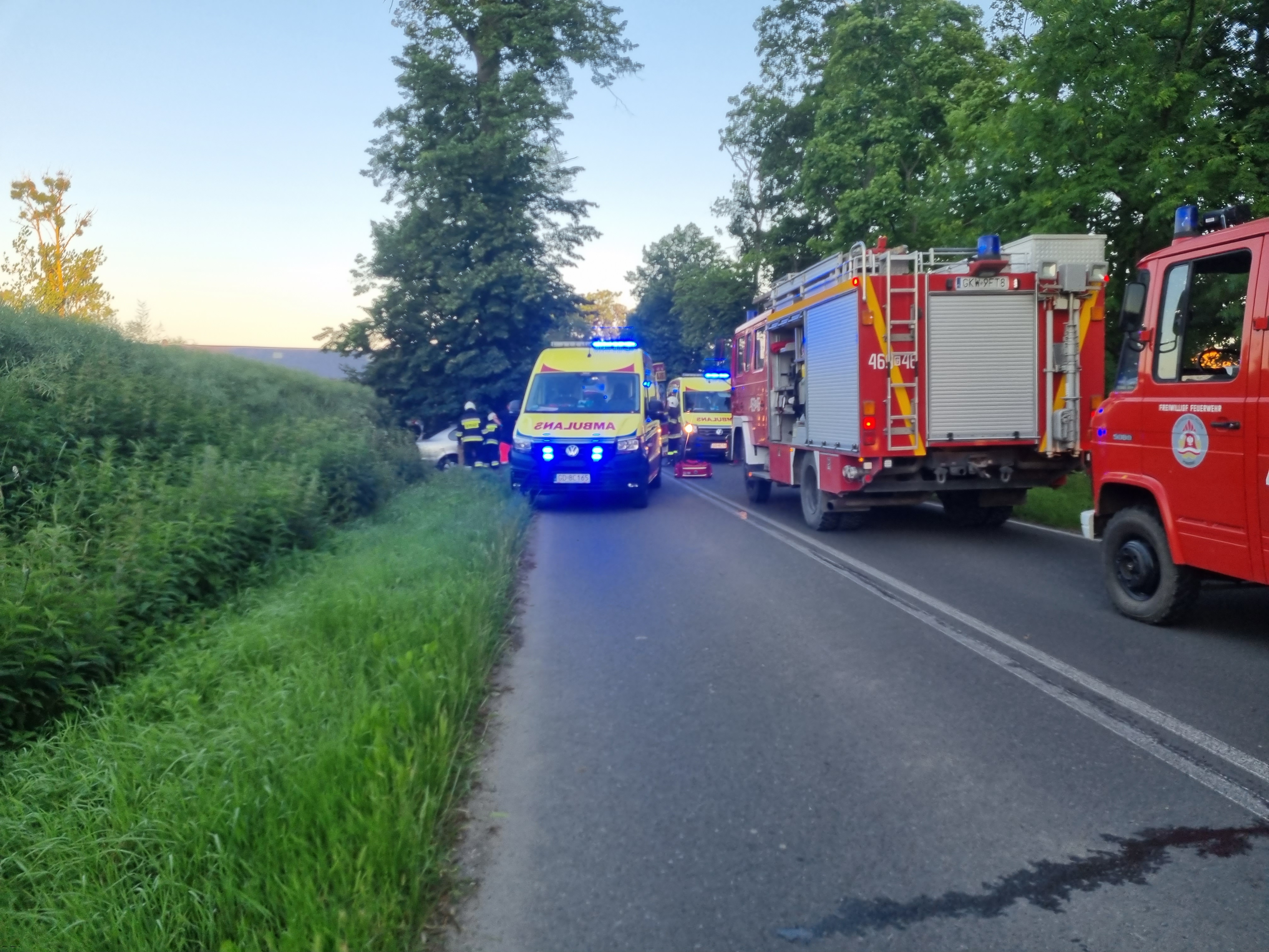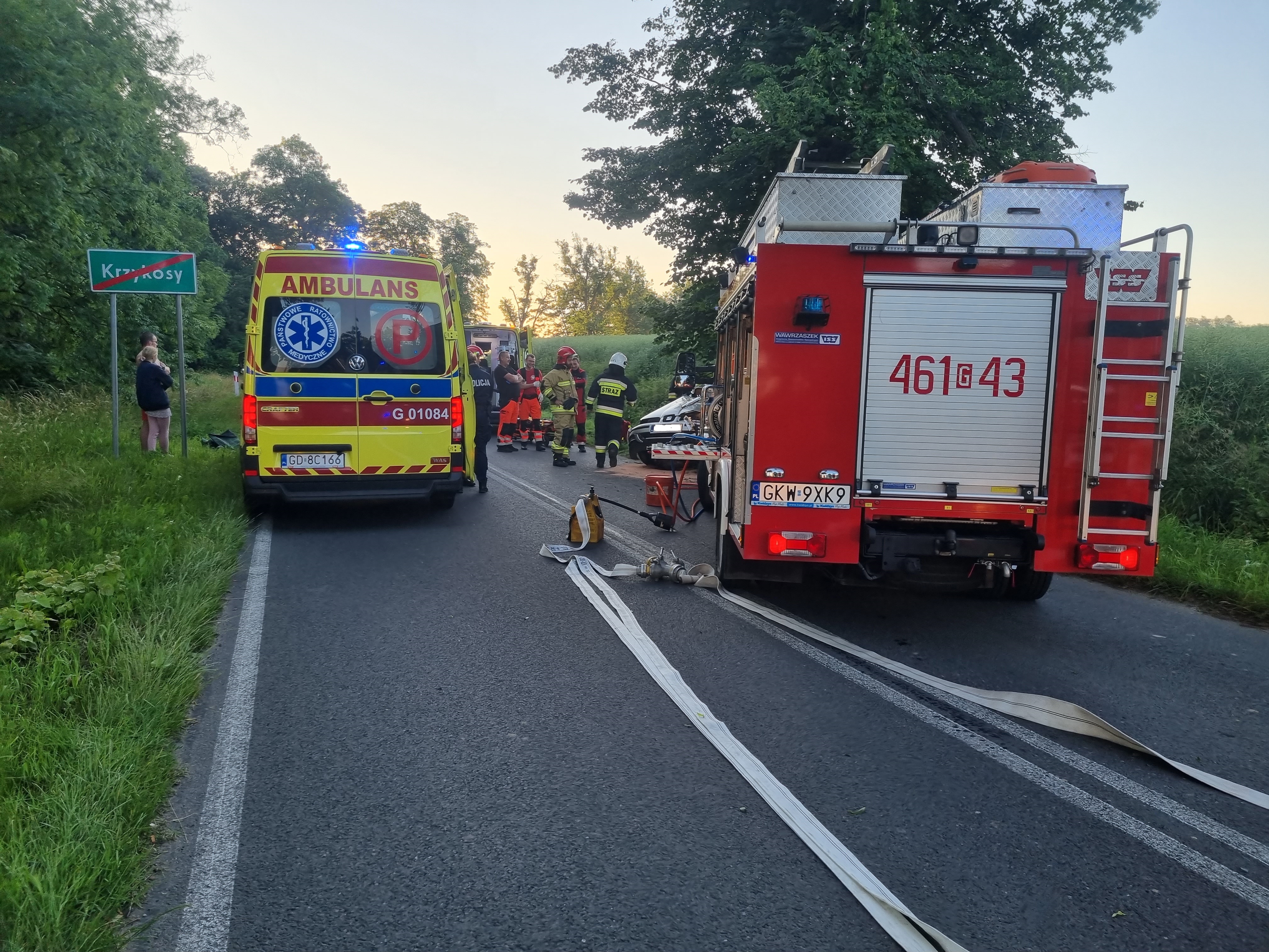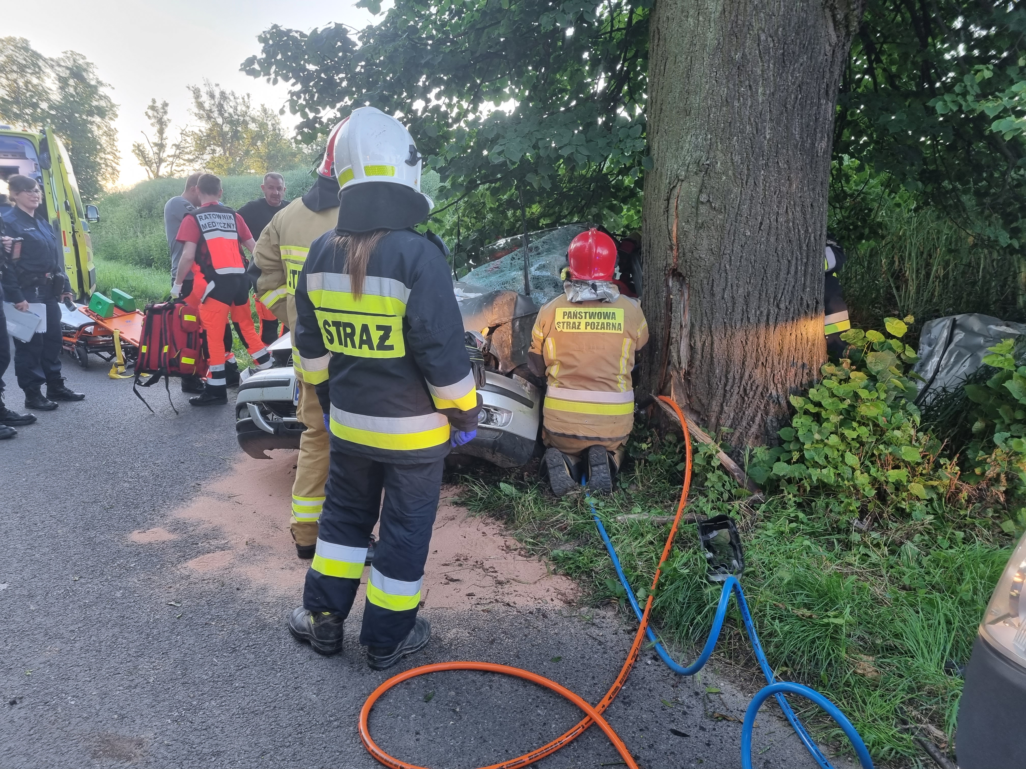 24 czerwca 2022 r. o godz. 4:42 dyżurny operacyjny stanowiska kierowania komendanta powiatowego PSP w Kwidzynie, przyjął zgłoszenie o wypadku drogowym z udziałem jednego samochodu osobowego, który w Krzykosach uderzył w przydrożne drzewo. Pojazdem podróżowały dwie osoby. Do zdarzenia zadysponowano 2 zastępy z Jednostki Ratowniczo-Gaśniczej w Kwidzynie, 1 zastęp z OSP Rozajny, 1 zastęp z OSP Wandowo, 2 Zespoły Ratownictwa Medycznego (ZRM) oraz Policję. Podczas działań ratowniczych zabezpieczono miejsce zdarzenia, zamknięto ruch drogowy w obu kierunkach, odłączono akumulator w uszkodzonym pojeździe oraz ustabilizowano go, sprawiono zestaw sprzętu hydraulicznego oraz linię gaśniczą. Udzielono kwalifikowanej pierwszej pomocy osobie przebywającej na zewnątrz pojazdu. Wykonano dostęp do osoby poszkodowanej przebywającej w pojeździe, przy użyciu narzędzi hydraulicznych oraz udzielono jej kwalifikowanej pierwszej pomocy. Obie osoby przekazano do ZRM. Dokonano sorpcji płynów eksploatacyjnych z jezdni.