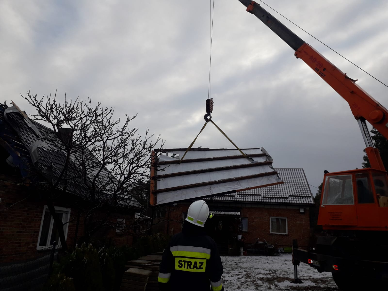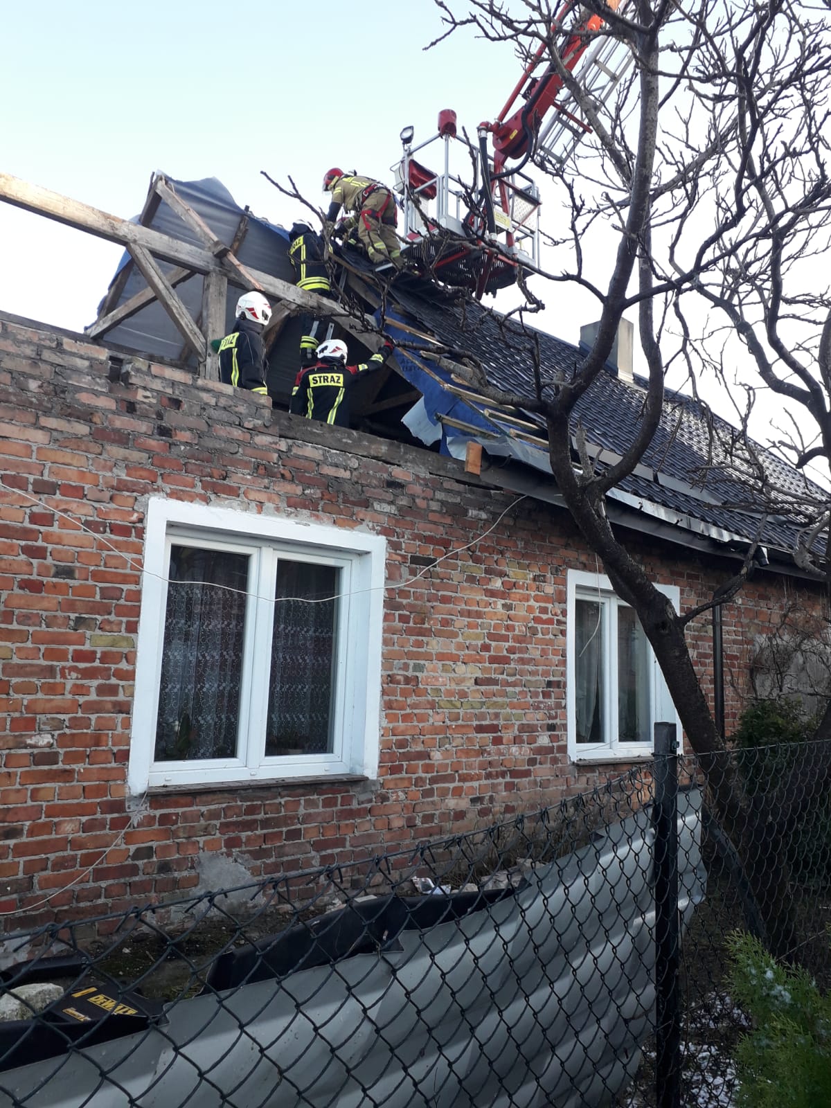 17 stycznia 2022 roku o godz. 07:54 dyżurny operacyjny stanowiska kierowania komendanta powiatowego PSP w Kwidzynie, przyjął zgłoszenie o zerwaniu dachu z budynku mieszkalnego w miejscowości Karpiny. Do zdarzenia zadysponowane zostały 2 zastępy z Jednostki Ratowniczo-Gaśniczej w Kwidzynie, 1 zastęp z OSP Sadlinki, 1 zastęp z OSP Bronisławowo, 1 patrol Policji. Na miejsce zdarzenia przybyła Wójt Gminy Sadlinki . W pierwszej fazie działań strażacy zabezpieczyli miejsce zdarzenia, pocięli oraz usunęli na pobocze 3 drzewa tarasujące dojazd do posesji. Przedstawiciel Urzędu Gminy Sadlinki zadysponował na miejsce dźwig oraz dostarczył materiały w celu zabezpieczenia dachu. Przy pomocy dźwigu zdjęto uszkodzone i naderwane blachy i krokwie. Za pomocą podnośnika doraźnie zabezpieczono dach poprzez nabicie łat i przykrycie plandeką. Straty oszacowano na około 70 tys. zł.