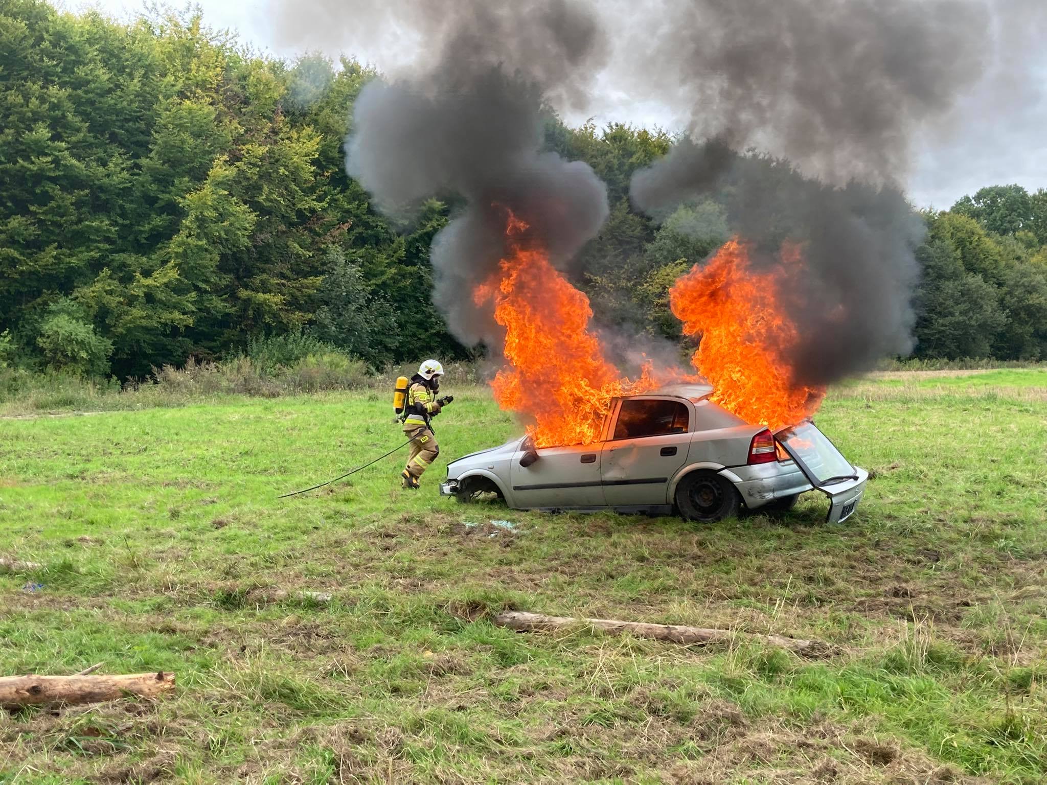Na zakończenie ćwiczeń strażacy z OSP Husów przeprowadzili pokaz gaszenia pojazdu przy użyciu systemu CAFS.