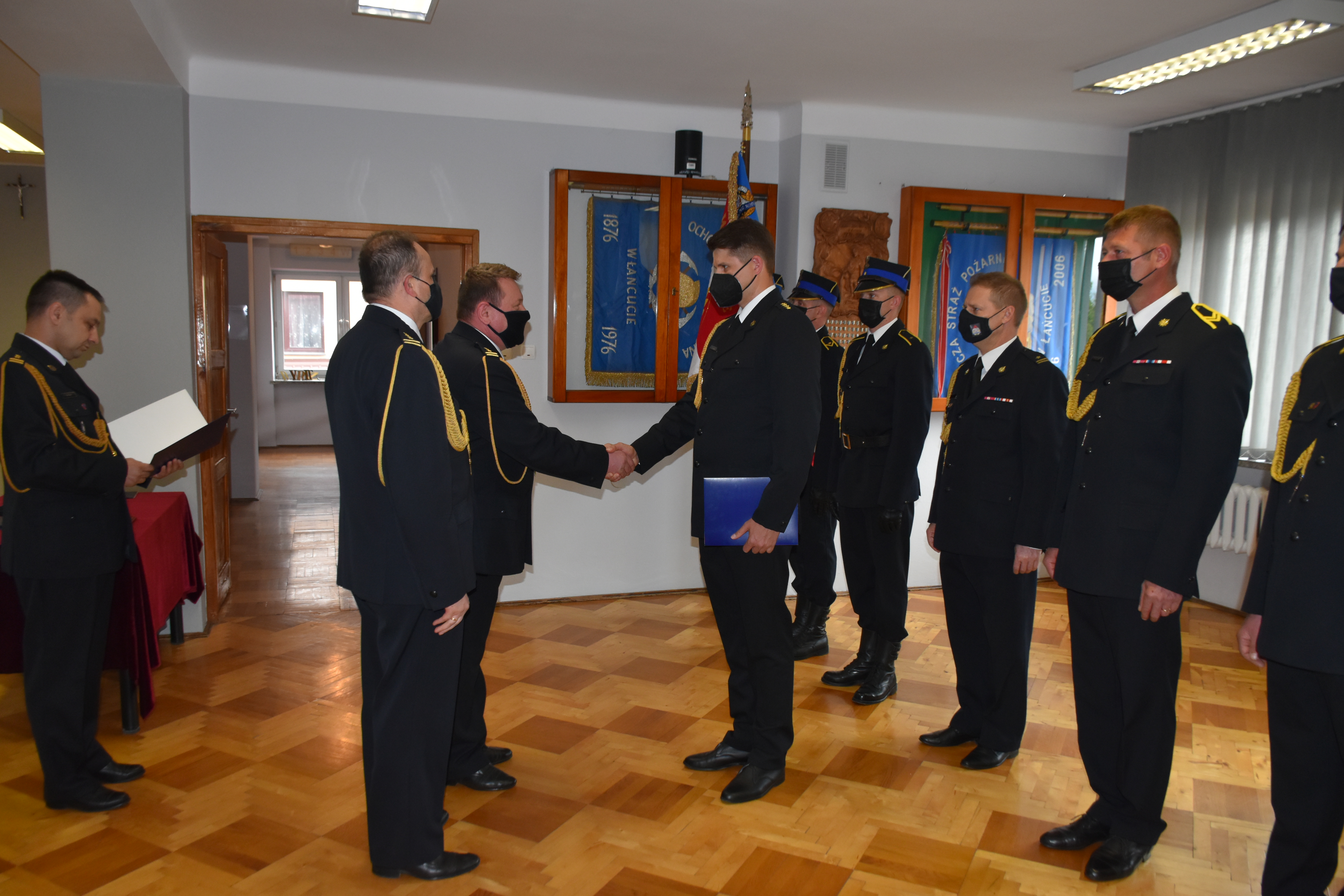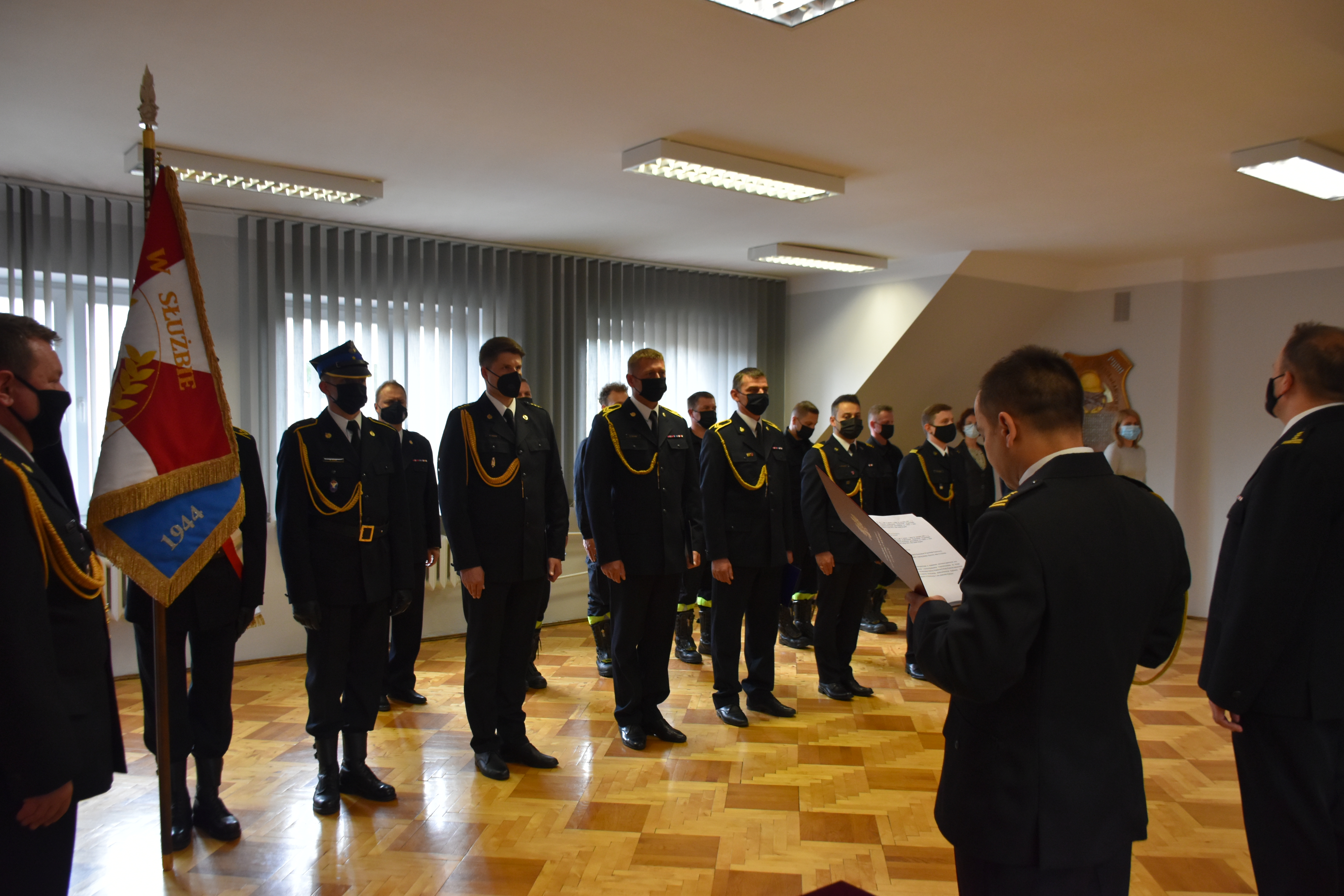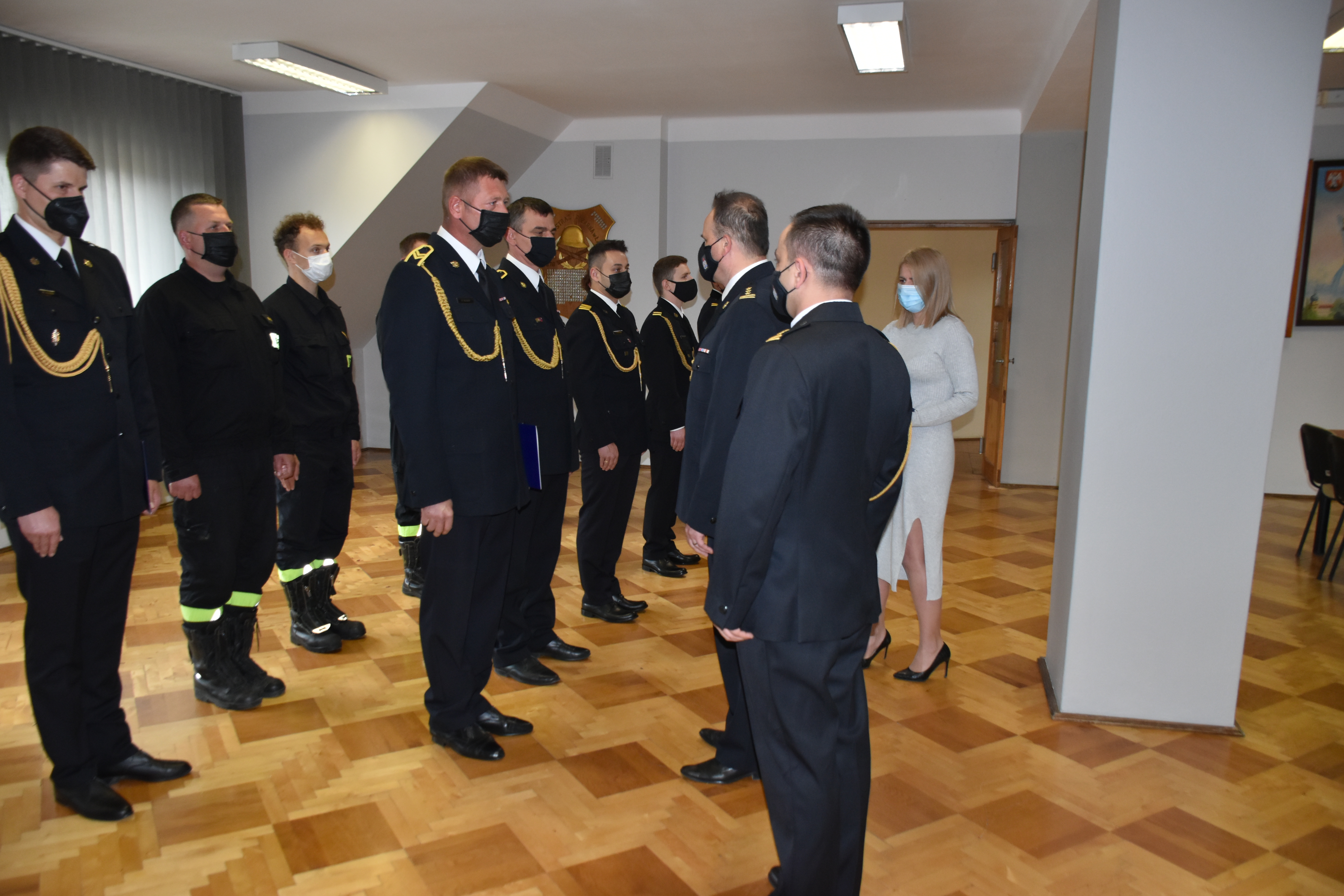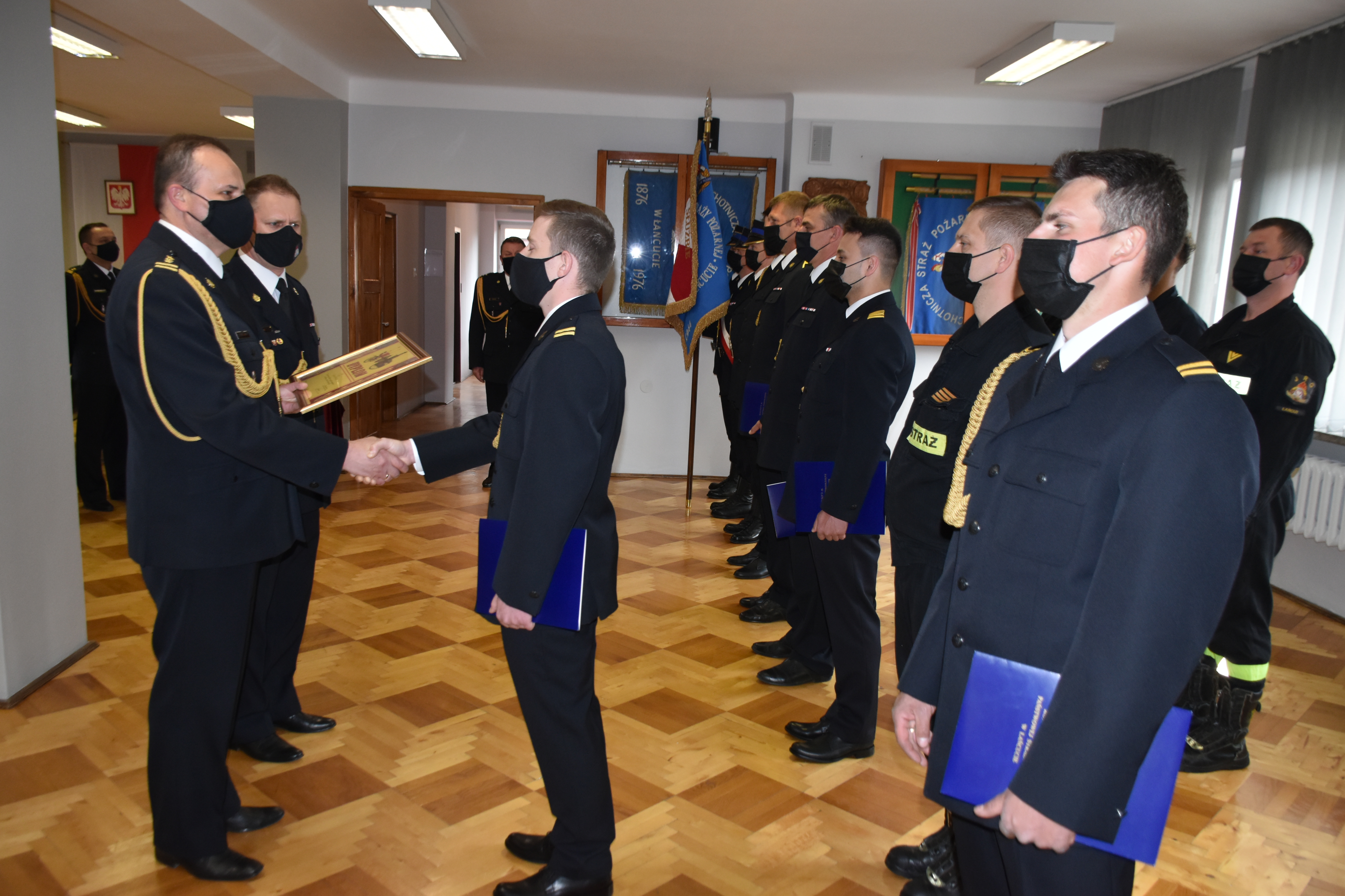 Po odczytaniu wyciągów z postanowień o nadaniu odznaczeń oraz rozkazów o nadaniu wyższych stopni służbowych Zastępca Komendanta Powiatowego PSP w Łańcucie st. bryg. Jacek Rejman wręczył akty nadania stopni służbowych oraz okolicznościowy dyplom. Odznaczenia przyznane przez Ministra Spraw Wewnętrznych i Administracji funkcjonariuszom tut. komendy zostaną wręczone w późniejszym terminie. Następnie Zastępca Komendanta Powiatowego PSP w krótkim przemówieniu pogratulował wyróżnionym funkcjonariuszom, równocześnie dziękując wszystkim za ofiarną służbę, szczególnie w obecnym, trudnym i wymagającym czasie.