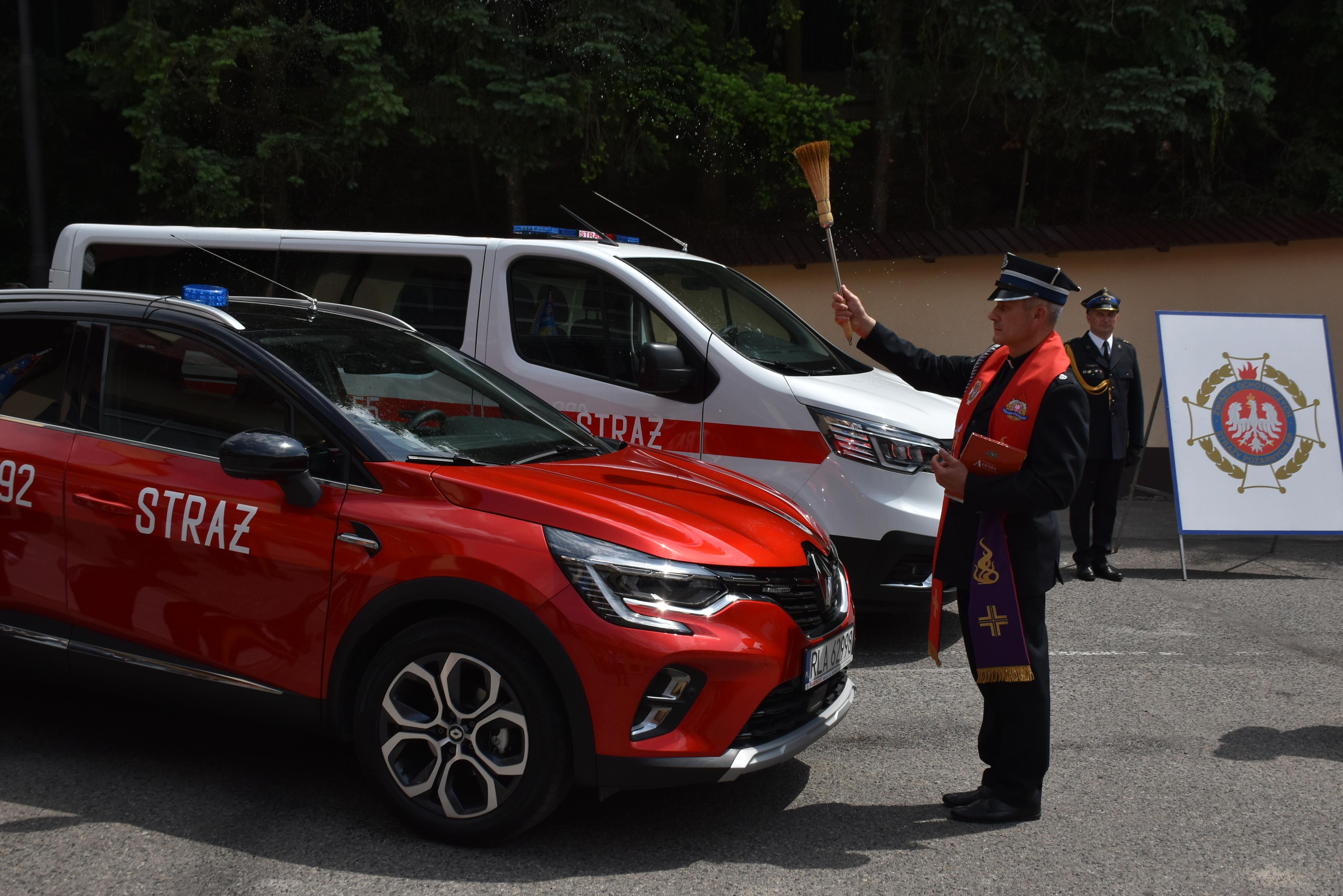 Po wręczeniu wyróżnień Ks. Grzegorz Garbacz - Kapelan Powiatowy Strażaków powiatu łańcuckiego poświęcił nowo pozyskane przez Komendę Powiatową PSP w Łańcucie samochody operacyjne: Renault Captur oraz Renault Trafic.