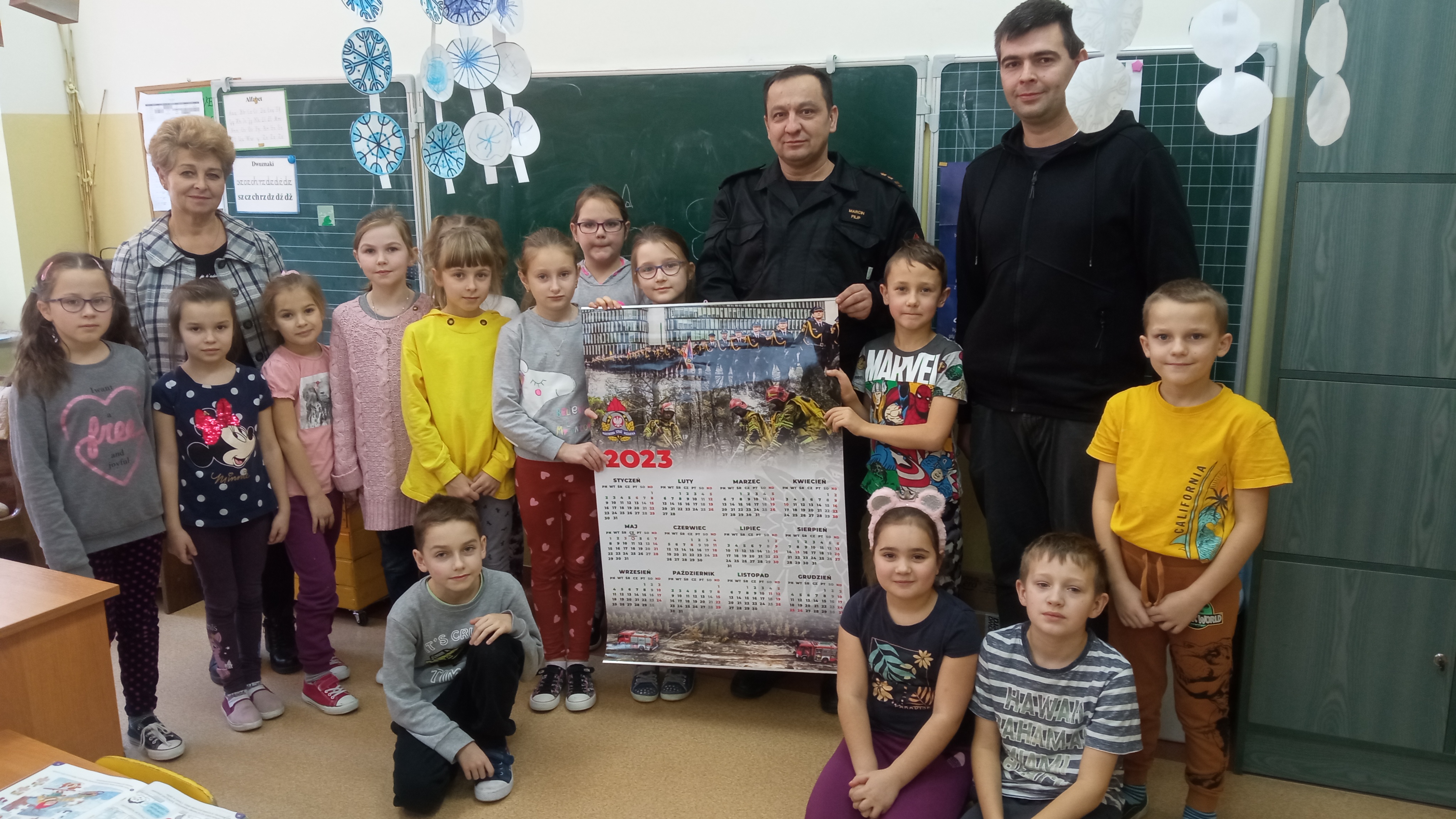 Strażacy z Komendy Powiatowej PSP w Łańcucie przekazali szkołom podstawowym z terenu powiatu łańcuckiego kalendarze plakatowe na rok 2023. Kalendarze wydane zostały nakładem Komendy Głównej Państwowej Straży Pożarnej. W akcji uczestniczyli wytypowani funkcjonariusze Komendy Powiatowej PSP w Łańcucie, którzy odwiedzili 38 szkół podstawowych. Podczas wizyty strażacy zachęcali do brania w udziału w ogłoszonych przez Komendę Główną PSP dwóch konkursach dla dzieci:
