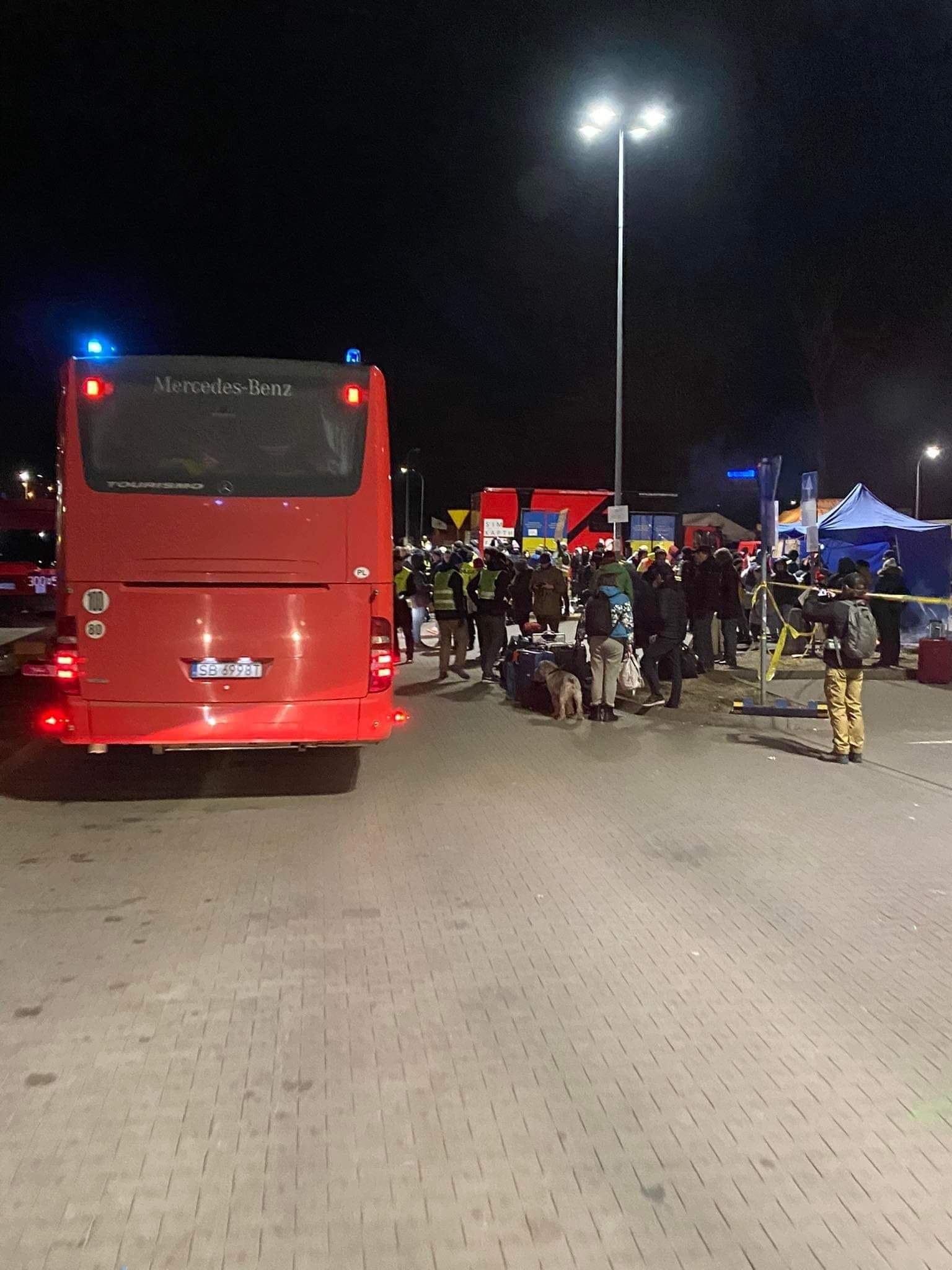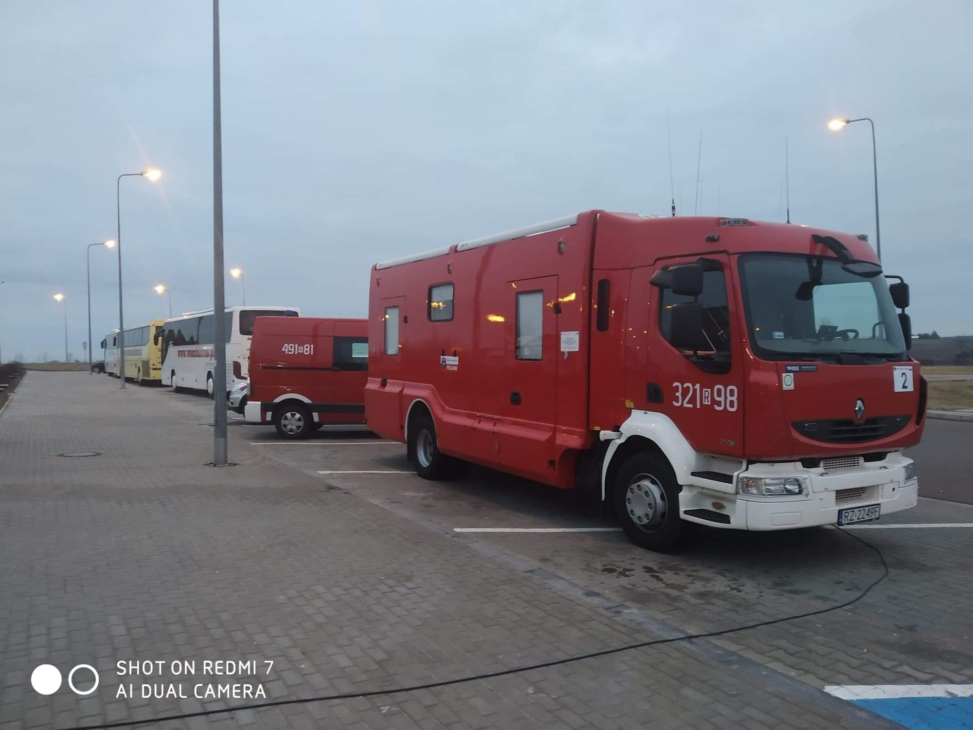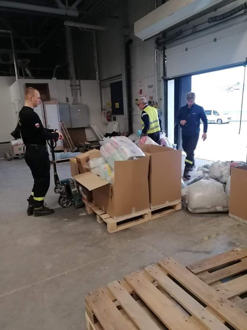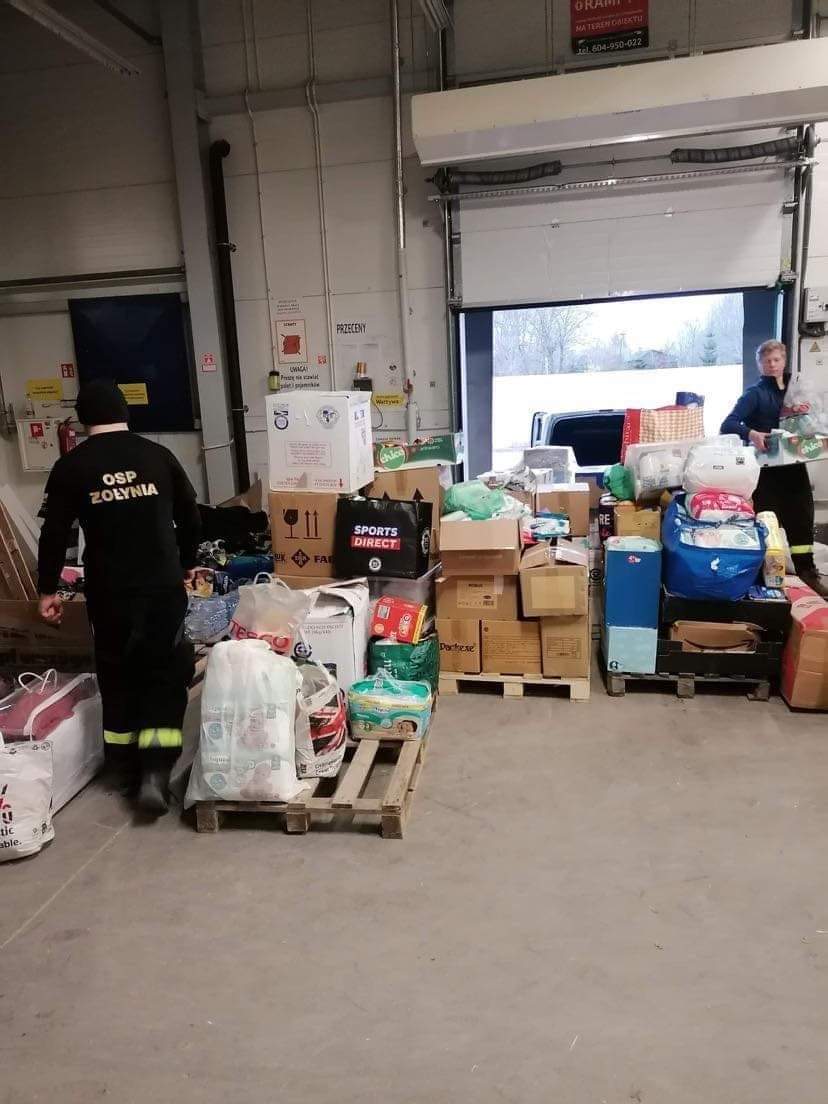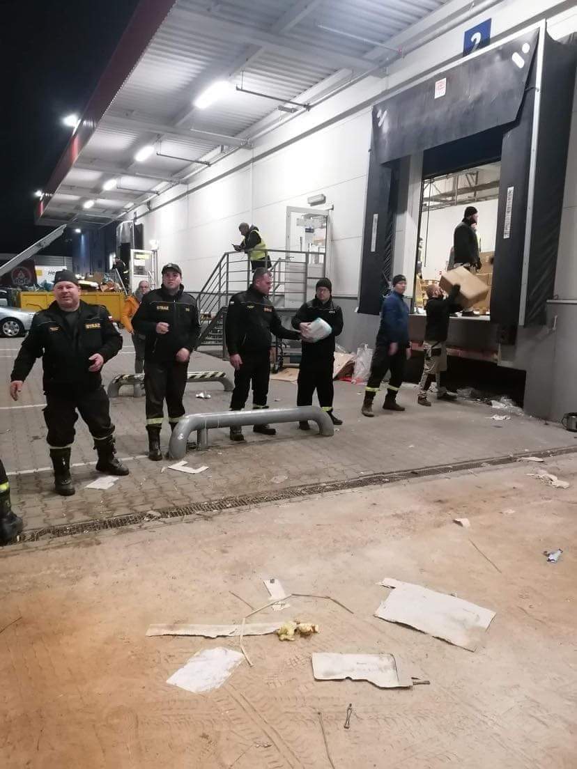 Nasi strażacy pracują również przy przeładunku darów oraz zajmują się organizacją i koordynacją działań związanych z przyjmowaniem transportu autokarowego na MOP Kaszyce.