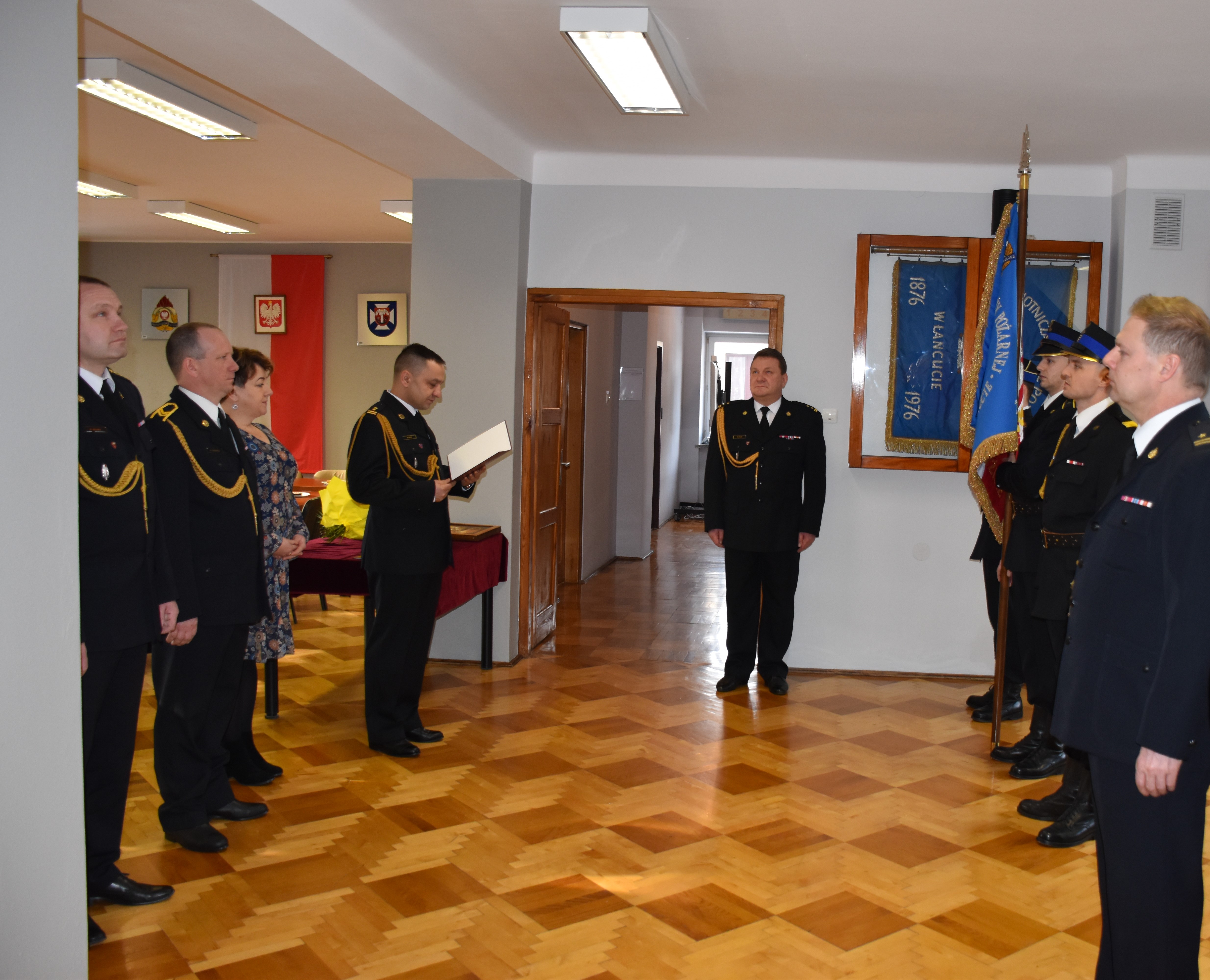 W uroczystości zakończenia służby uczestniczyło kierownictwo KP PSP w Łańcucie, małżonka odchodzącego na zaopatrzenie emerytalne oraz koleżanki i koledzy, z którymi przez wiele lat pełnił służbę. Komendant Powiatowy PSP w Łańcucie st. bryg. Bogusław Golenia wręczył nowemu emerytowi pamiątkowy ryngraf oraz krótko scharakteryzował przebieg służby wymieniając jego szczególne osiągnięcia i zasługi.