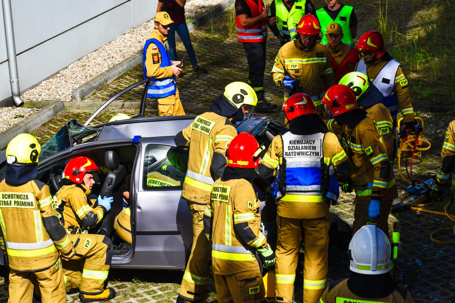 Z uwagi na ekstremalne warunki meteorologiczne i pożary kompleksów leśnych, które nasilały się w ostatnich dniach w dniu 15 września od godz. 08.00 rozkazem Komendanta Powiatowego PSP w Łasku biorąc pod uwagę skrajnie niekorzystne prognozy meteo i hydrologiczne zapadła decyzja o koncentracji doraźnej kompanii gaśniczej „GRABIA”. Polecono osiągnąć gotowość operacyjną na godzinę 11:30, na miejsce koncentracji wyznaczono plac przy OSP KSRG w Maleni. Chwilę przed godziną 12.00 samolot wojskowy MIG-29 tuż po starcie w kierunku wschodnim z lotniska EPLK - Łask, w odległości około 1800 m od pasa startowego, z niewiadomych przyczyn zahacza o budynek firmy GUCINEX w m. Gucin. Spadający wrak wznieca pożar lasu, wiatr wschodni, kierunek rozprzestrzeniania się pożaru na zachód. Fragment dachu budynku produkcyjno-magazynowego spada na zaparkowany na parkingu samochód osobowy, którym podjechali klienci firmy i zostali uwięzieni w pojeździe . Wskutek uszkodzenia dachu budynku opadające elementy konstrukcji oraz elementy podwieszone na suwnicach przyciskają pracowników budynku. Jeden element spada na butlę z gazem propan-butan, która rozszczelnia się i dochodzi do eksplozji. Wielu pracowników doznaje licznych ran i obrażeń tj. złamania, rany krwawiące, wbite w ciała przedmioty. Dwóch pracowników hali zostaje przygniecionych ciężkimi elementami. Działania strażaków polegały na zabezpieczeniu miejsca zdarzenia, następnie przeprowadzono TRIAGE, później udzielano pomocy poszkodowanym wg priorytetów. KDR zadysponował stacjonujące w pobliżu siły kompanii gaśniczej GRABIA w celu udzielenia pomocy poszkodowanym. Zorganizowano prowizoryczne punkty medyczne w miejscach bezpiecznych, poszkodowanych przekazywano zespołom ratownictwa medycznego wg priorytetów. Jednocześnie uszkodzony statek powietrzny, który spadł w pobliskim lesie wzniecił pożar. Możliwość gaszenia pożaru z uwagi na uzbrojenie samolotu była ograniczona, wyznaczono strefę niebezpieczną, zastęp WSP 32BLT w Łasku dokonał rozpoznania, podjął próbę gaszenia pożaru, jednak pożar zaczął się rozprzestrzeniać w kierunku firmy GUCINEX. Zadysponowano zastępy wchodzące w skład Plutonu D Kompanii Gaśniczej „RADOMSKO”. Z uwagi na długotrwałe działania utworzono punkt wydawania wody i posiłków dla uczestników akcji. Udzielono pomocy poszkodowanym przy katastrofie, po czym przy współpracy z Policją w Łasku siły przerzucono do poszukiwań rozbitka, który prawdopodobnie się katapultował. Uczestnicy ćwiczeń musieli sobie radzić z licznymi podgrywkami i utrudnieniami, jedną z nich, był napotkany w lesie przedmiot przypominający uzbrojenie. Wówczas siły natychmiast wycofano w miejsce bezpieczne, a Policja przeprowadziła rozpoznanie minersko-pirotechniczne. Okazało się, że przedmiot nie stwarza zagrożenia wybuchowego, zatem wznowiono poszukiwania. Wkrótce znaleziono rozbitka, udzielono KPP poszkodowanemu i przekazano go ZRM. Tymczasem Pluton D przygotował linię obrony na skraju lasu. Zbudowano zasilanie z pobliskiego punktu czerpania wody i przygotowano się do natarcia, na front pożaru. O godzinie 14:00 przeprowadzono natarcie na front pożaru z wykorzystaniem działek przenośnych i przewoźnych i ugaszono pożar.