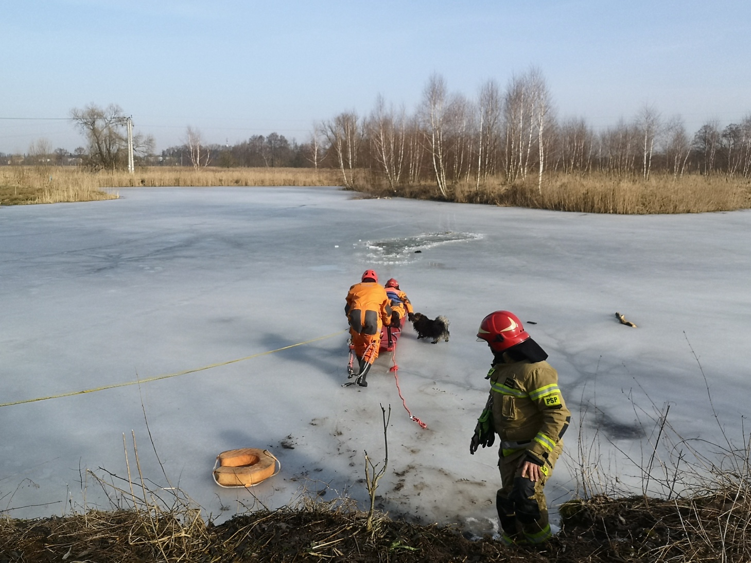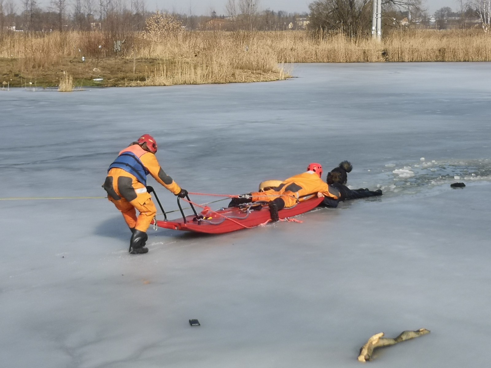 Około godz. 11:30 dyżurny Stanowiska Kierowania KP PSP w Łasku otrzymał zgłoszenie, że wskutek złamania się lodu do wody wpadł mąż osoby zgłaszającej i zaczął się topić. Do działań zadysponowano 3 pojazdy pożarnicze z łodzią i saniami lodowymi. Po dojeździe na miejsce zdarzenia strażacy niezwłocznie przystąpili do ewakuacji mężczyzny korzystając z sań lodowych. Następnie udzielono pomocy medycznej , zapewniając komfort termiczny. Po dojeździe na miejsce zdarzenia ZRM i przekazaniu osoby poszkodowanej działania zakończono.