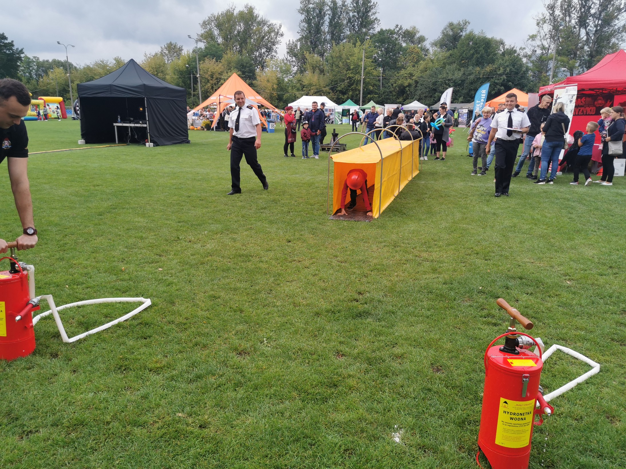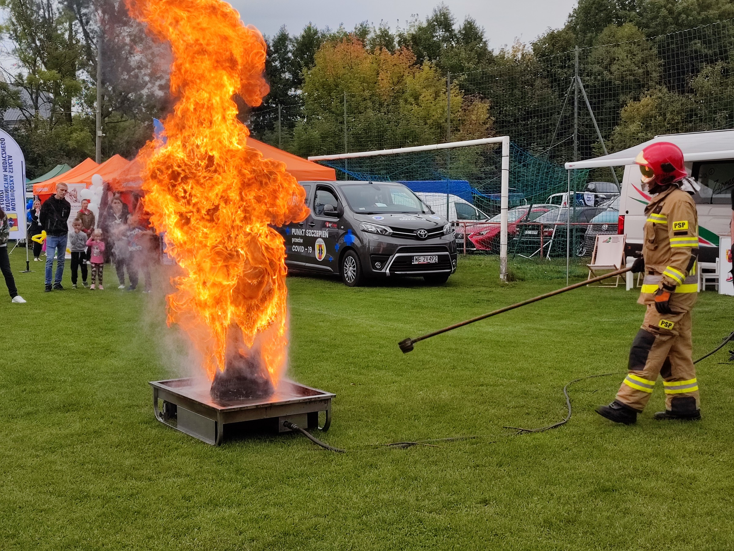 W trakcie pikniku strażacy z tut. Komendy zorganizowali dodatkowo nietypowy pokaz z wykorzystaniem symulatora pożarowego z rozgrzanym olejem, który miał na celu uświadomienie uczestnikom z jakimi zagrożeniami możemy się spotkać podczas próby gaszenia palącego się tłuszczu. Podgrzewany tłuszcz na symulatorze zaczął się gotować a następnie po przekroczeniu temperatury zapłonu palić, do palącego się oleju podszedł strażak, który zalał go wodą. Efekt przypominał eksplozję. W górę buchnął ogromny słup ognia.