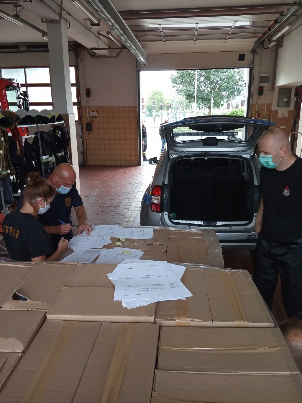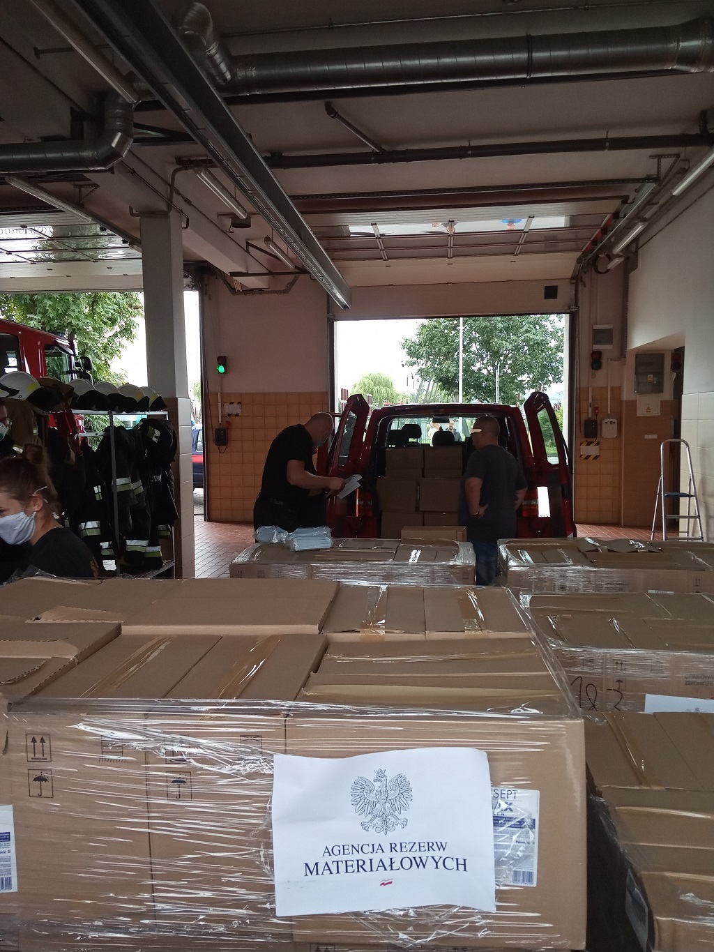 Strażacy na terenie województwa pomorskiego pomagają w transporcie środków ochrony indywidualnej dla uczniów i nauczycieli w szkołach. Przy współpracy z Pocztą Polską materiały są transportowane z magazynów Agencji Rezerw Materiałowych do jednostek Państwowej Straży Pożarnej.