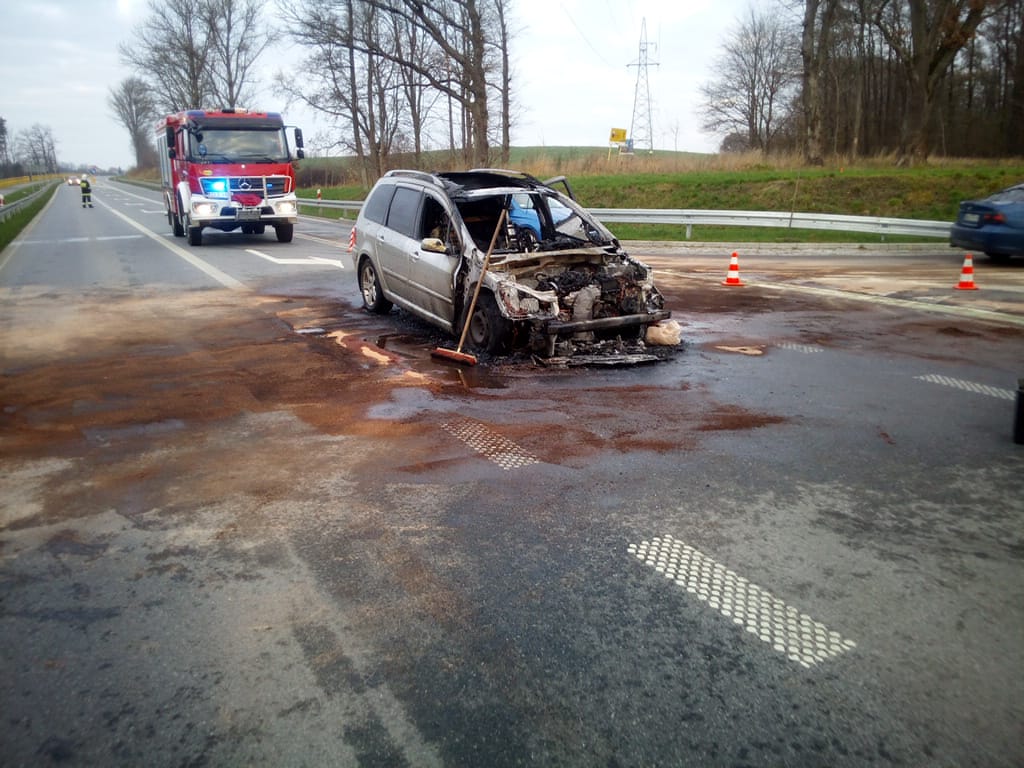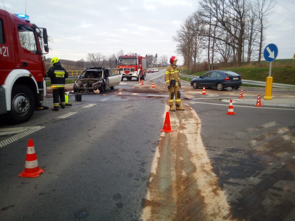 Po przybyciu na miejsce zdarzenia stwierdzono, że doszło do pożaru samochodu osobowego w przedziale silnikowym pojazdu. Ratownicy zabezpieczyli miejsce zdarzenia, przystąpili do gaszenia płonącego pojazdu oraz zneutralizowali rozlewisko substancji ropopochodnej. W wyniku zdarzenia nikomu nic się nie stało.